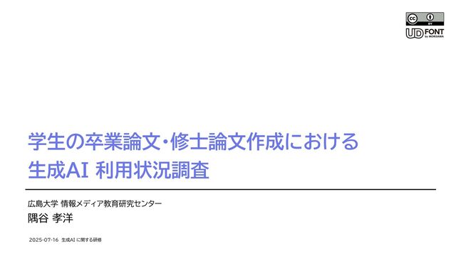 学生の卒業論文・修士論文作成における 生成AI 利用状況調査 広島大学 情報メディア教育研究センター 隅谷 孝洋 2025-07-16 生成AI に関する研修