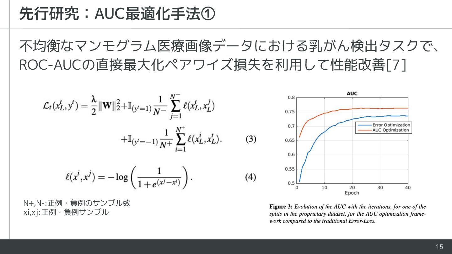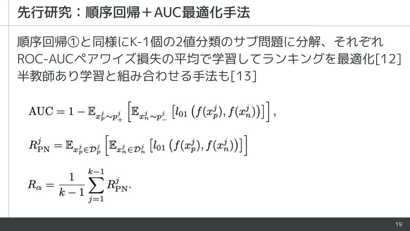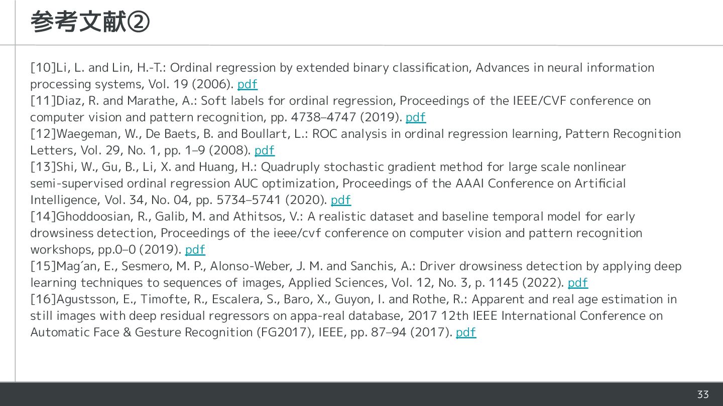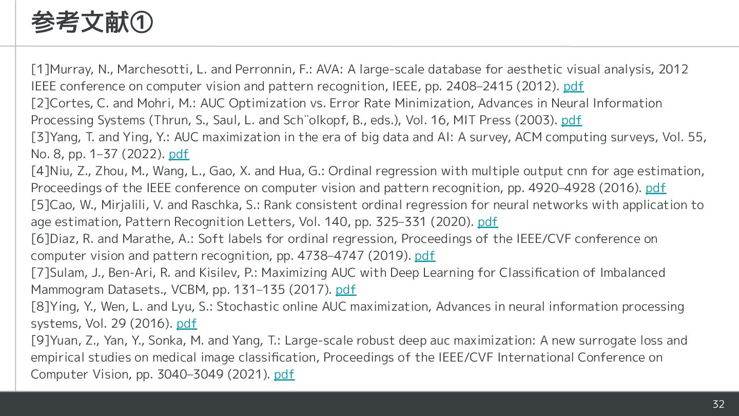 database for aesthetic visual analysis, 2012 IEEE conference on computer vision and pattern recognition, IEEE, pp. 2408–2415 (2012). pdf [2]Cortes, C. and Mohri, M.: AUC Optimization vs. Error Rate Minimization, Advances in Neural Information Processing Systems (Thrun, S., Saul, L. and Sch¨olkopf, B., eds.), Vol. 16, MIT Press (2003). pdf [3]Yang, T. and Ying, Y.: AUC maximization in the era of big data and AI: A survey, ACM computing surveys, Vol. 55, No. 8, pp. 1–37 (2022). pdf [4]Niu, Z., Zhou, M., Wang, L., Gao, X. and Hua, G.: Ordinal regression with multiple output cnn for age estimation, Proceedings of the IEEE conference on computer vision and pattern recognition, pp. 4920–4928 (2016). pdf [5]Cao, W., Mirjalili, V. and Raschka, S.: Rank consistent ordinal regression for neural networks with application to age estimation, Pattern Recognition Letters, Vol. 140, pp. 325–331 (2020). pdf [6]Diaz, R. and Marathe, A.: Soft labels for ordinal regression, Proceedings of the IEEE/CVF conference on computer vision and pattern recognition, pp. 4738–4747 (2019). pdf [7]Sulam, J., Ben-Ari, R. and Kisilev, P.: Maximizing AUC with Deep Learning for Classification of Imbalanced Mammogram Datasets., VCBM, pp. 131–135 (2017). pdf [8]Ying, Y., Wen, L. and Lyu, S.: Stochastic online AUC maximization, Advances in neural information processing systems, Vol. 29 (2016). pdf [9]Yuan, Z., Yan, Y., Sonka, M. and Yang, T.: Large-scale robust deep auc maximization: A new surrogate loss and empirical studies on medical image classification, Proceedings of the IEEE/CVF International Conference on Computer Vision, pp. 3040–3049 (2021). pdf 参考文献① 32