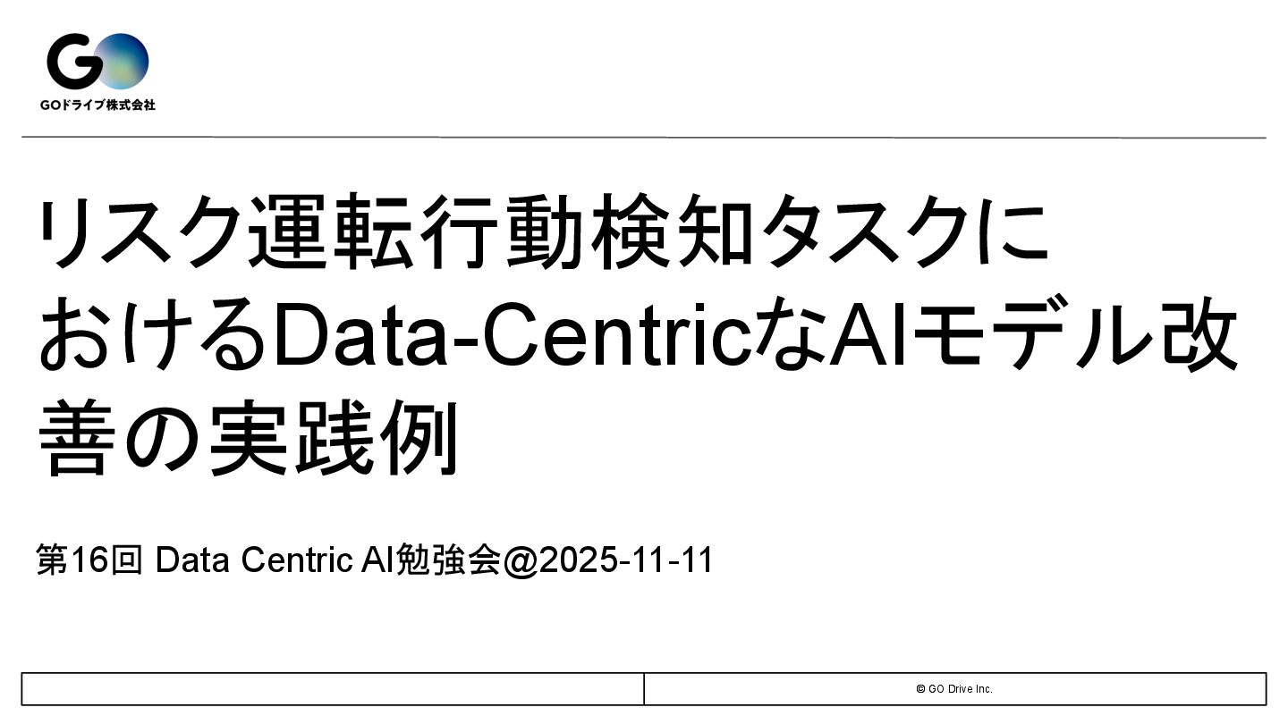 © GO Drive Inc. リスク運転行動検知タスクに おけるData-CentricなAIモデル改 善の実践例 第16回 Data Centric
