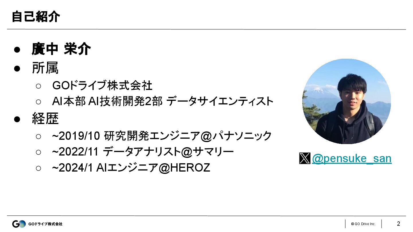◦ GOドライブ株式会社 ◦ AI本部 AI技術開発2部 データサイエンティスト • 経歴 ◦ ~2019/10 研究開発エンジニア@パナソニック ◦ ~2022/11 データアナリスト@サマリー ◦ ~2024/1 AIエンジニア@HEROZ 自己紹介 @pensuke_san