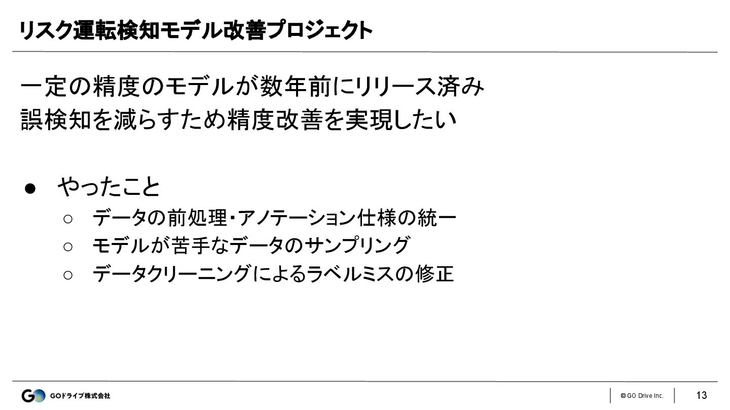 © GO Drive Inc. 一定の精度のモデルが数年前にリリース済み 誤検知を減らすため精度改善を実現したい • やったこと ◦ データの前処理・アノテーション仕様の統一