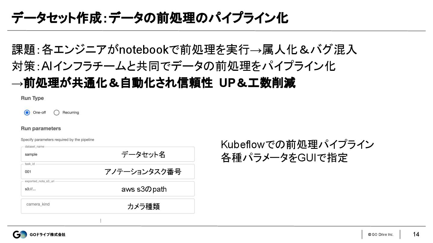 © GO Drive Inc. 課題:各エンジニアがnotebookで前処理を実行→属人化&バグ混入 対策:AIインフラチームと共同でデータの前処理をパイプライン化 →前処理が共通化&自動化され信頼性 UP&工数削減 データセット作成:データの前処理のパイプライン化 データセット名