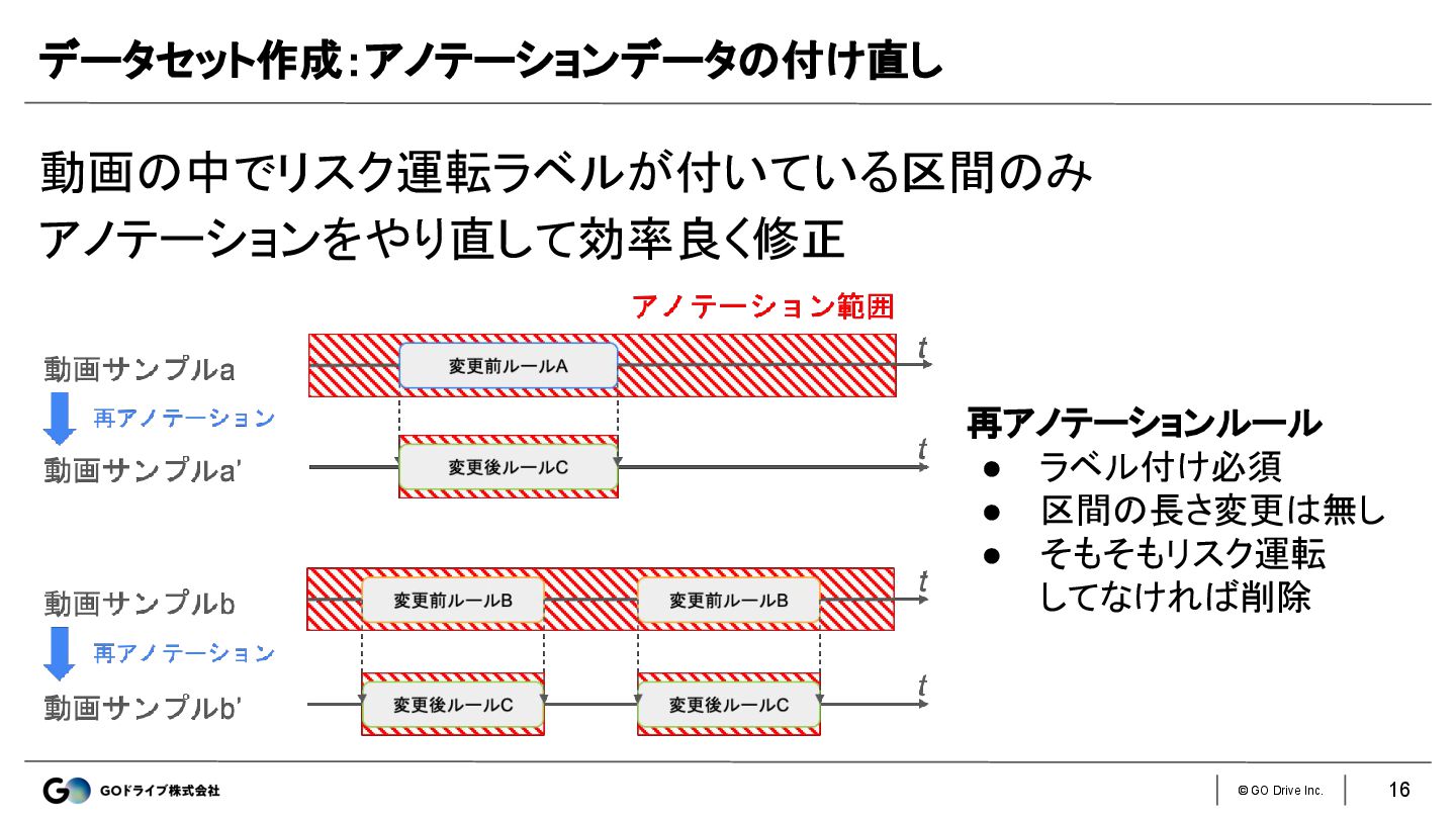 © GO Drive Inc. データセット作成:アノテーションデータの付け直し 動画の中でリスク運転ラベルが付いている区間のみ アノテーションをやり直して効率良く修正 16 再アノテーションルール •