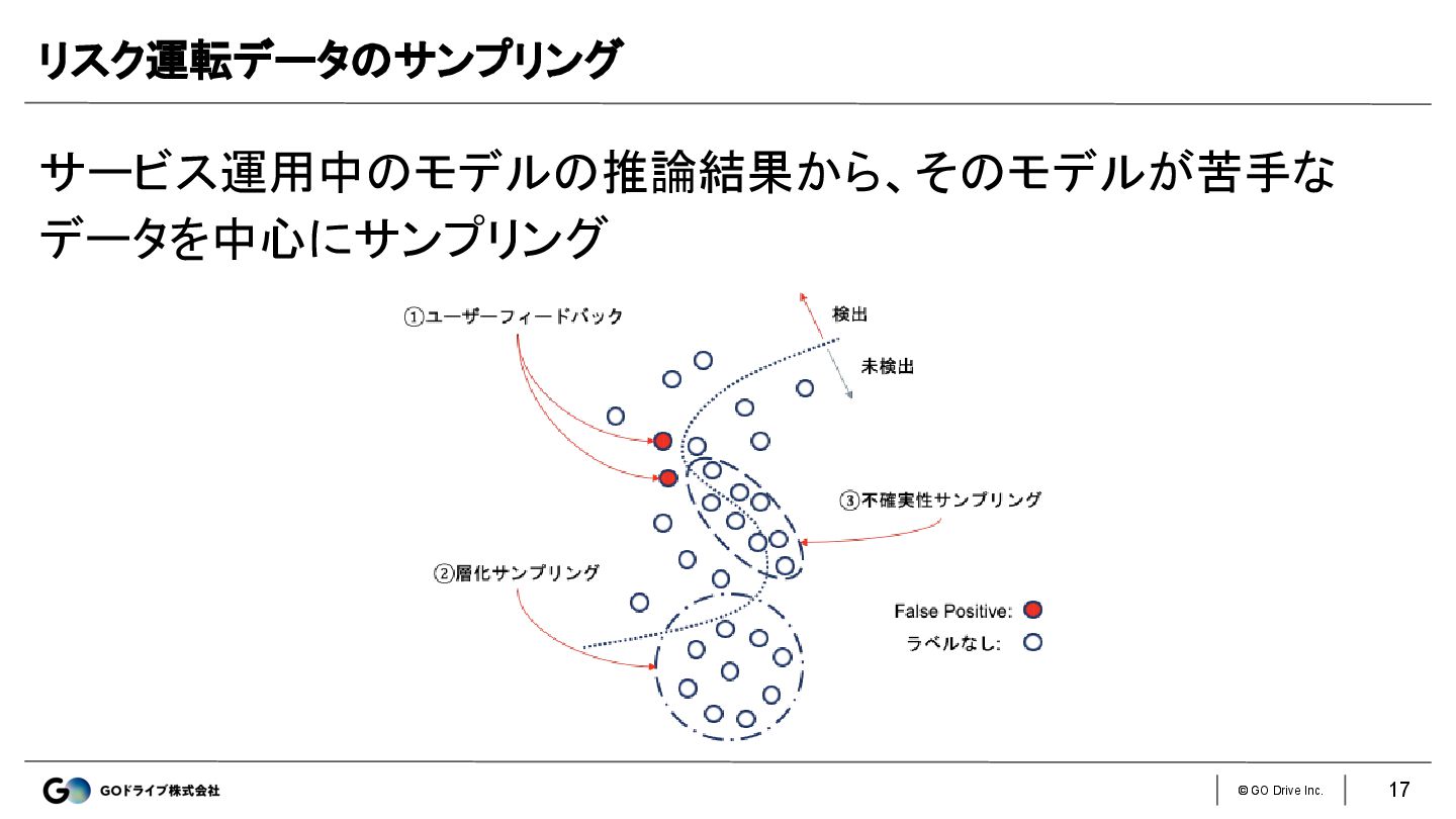© GO Drive Inc. サービス運用中のモデルの推論結果から、そのモデルが苦手な データを中心にサンプリング リスク運転データのサンプリング 17