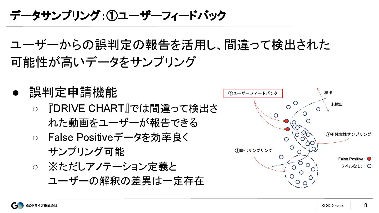 © GO Drive Inc. ユーザーからの誤判定の報告を活用し、間違って検出された 可能性が高いデータをサンプリング データサンプリング:①ユーザーフィードバック • 誤判定申請機能 ◦