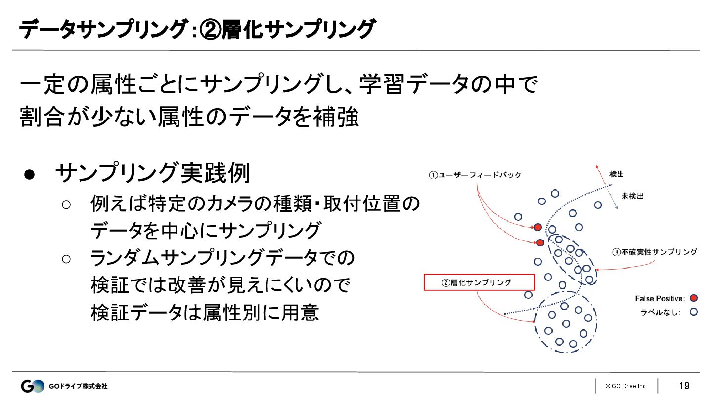 © GO Drive Inc. 一定の属性ごとにサンプリングし、学習データの中で 割合が少ない属性のデータを補強 データサンプリング:②層化サンプリング • サンプリング実践例 ◦