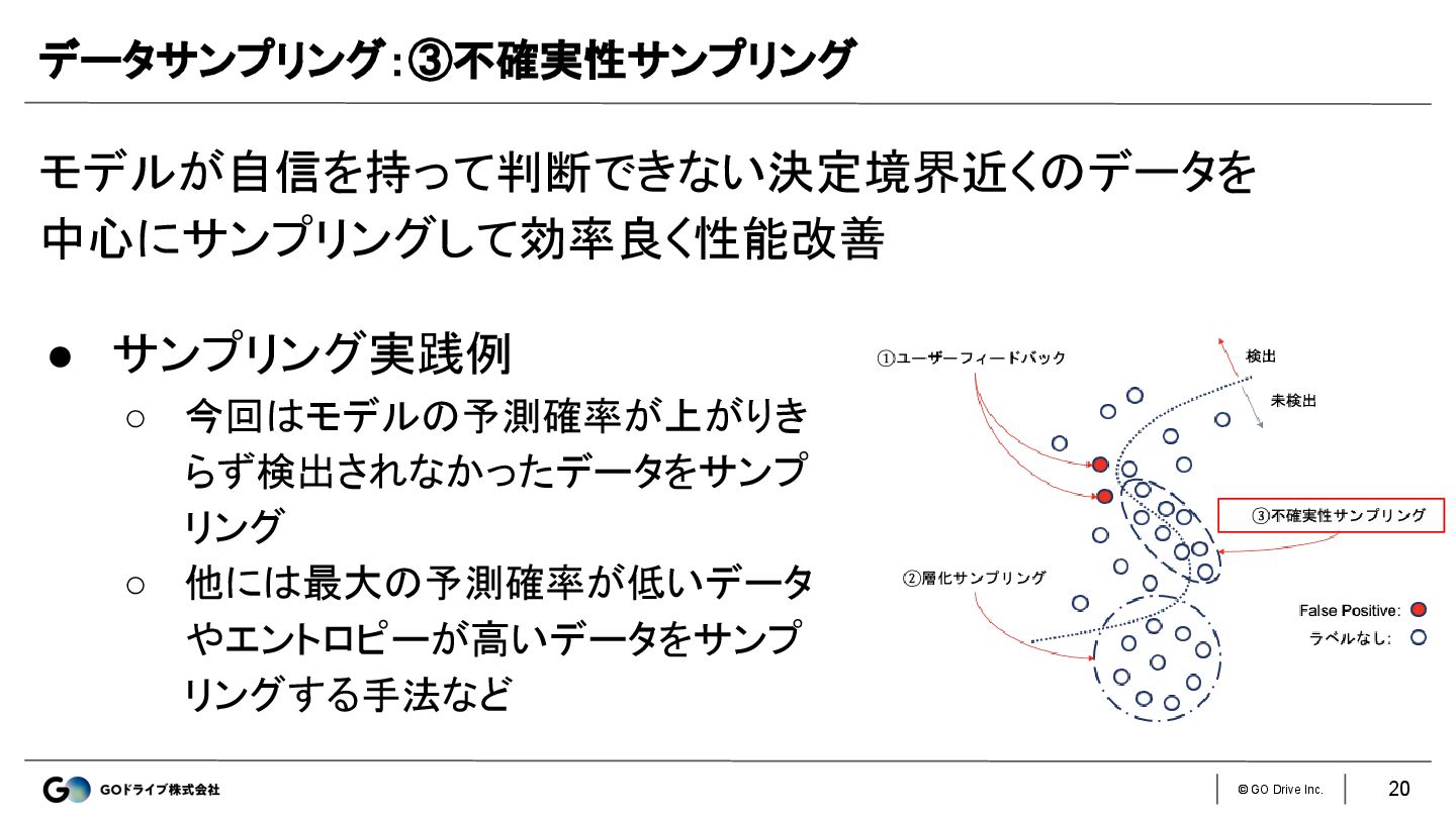 © GO Drive Inc. モデルが自信を持って判断できない決定境界近くのデータを 中心にサンプリングして効率良く性能改善 データサンプリング:③不確実性サンプリング • サンプリング実践例 ◦