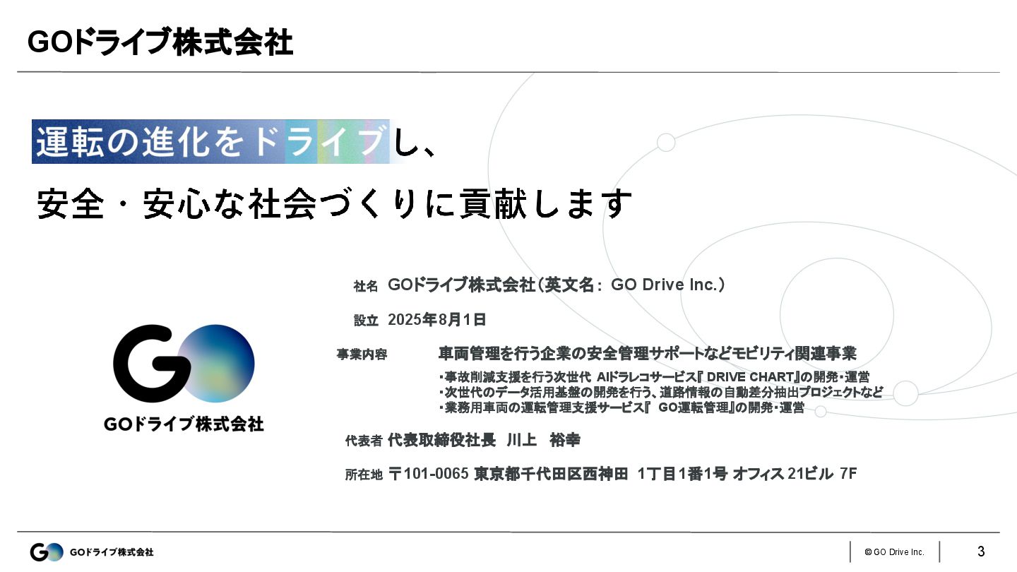 設立 2025年8月1日 事業内容 車両管理を行う企業の安全管理サポートなどモビリティ関連事業 ・事故削減支援を行う次世代 AIドラレコサービス『 DRIVE CHART』の開発・運営 ・次世代のデータ活用基盤の開発を行う、道路情報の自動差分抽出プロジェクトなど ・業務用車両の運転管理支援サービス『 GO運転管理』の開発・運営 代表者 代表取締役社長 川上 裕幸 所在地 〒101-0065 東京都千代田区西神田 1丁目1番1号 オフィス 21ビル 7F 3