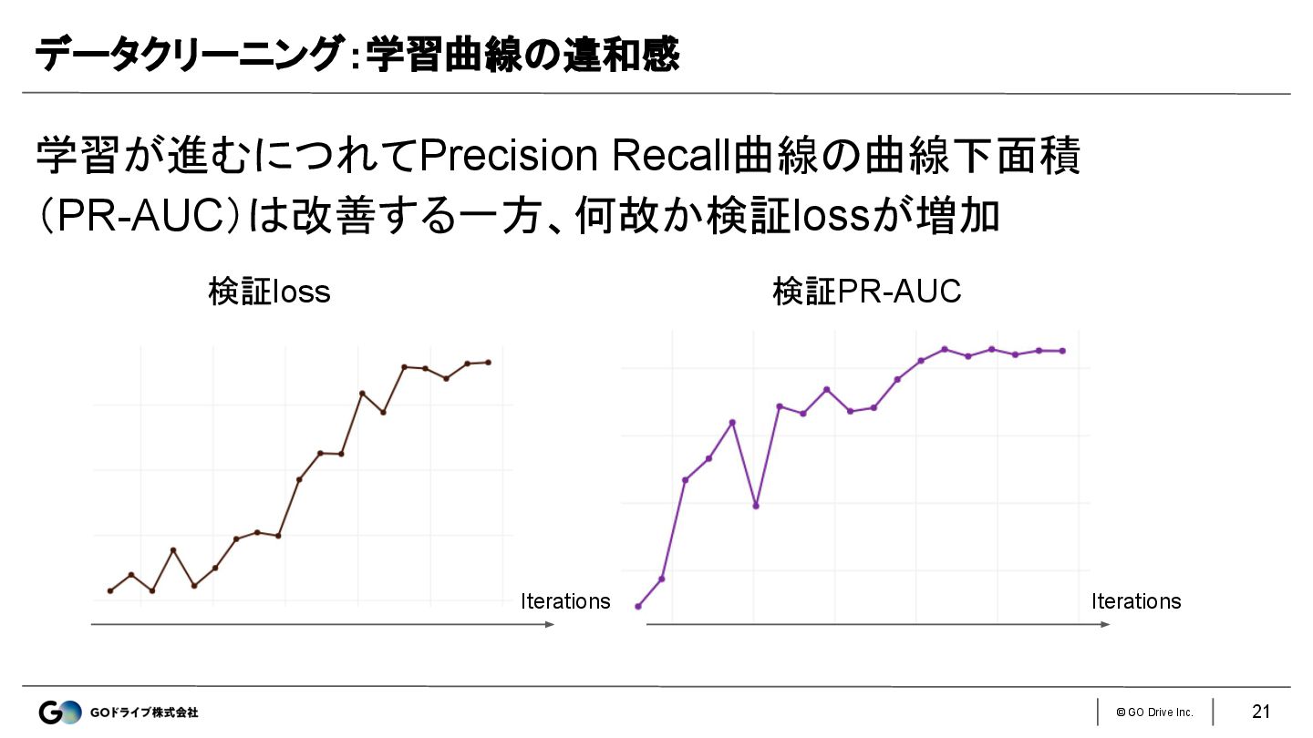 © GO Drive Inc. 学習が進むにつれてPrecision Recall曲線の曲線下面積 (PR-AUC)は改善する一方、何故か検証lossが増加 データクリーニング:学習曲線の違和感 検証loss 検証PR-AUC