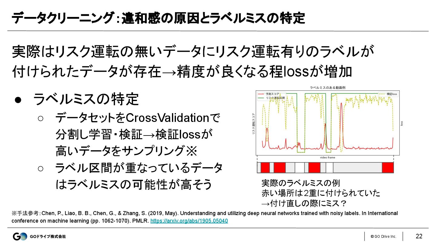 © GO Drive Inc. 実際はリスク運転の無いデータにリスク運転有りのラベルが 付けられたデータが存在→精度が良くなる程lossが増加 データクリーニング:違和感の原因とラベルミスの特定 22 ※手法参考:Chen, P.,