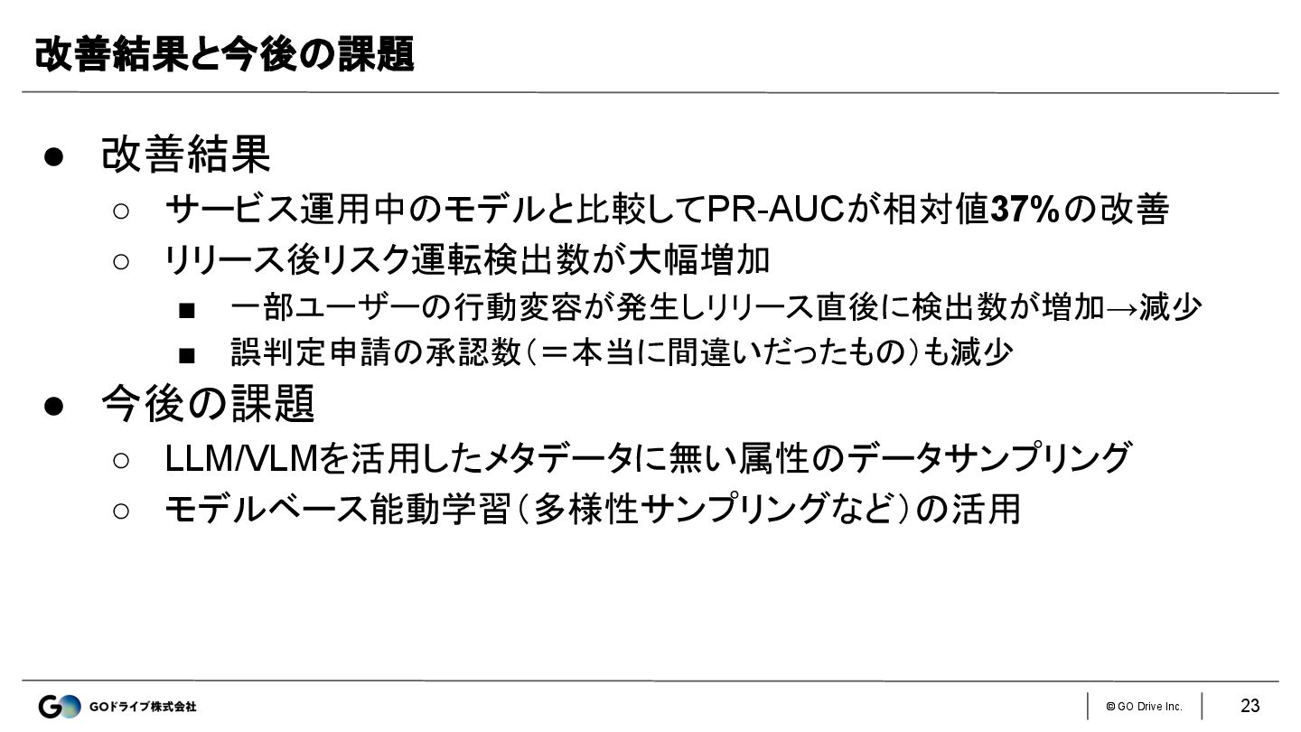 © GO Drive Inc. • 改善結果 ◦ サービス運用中のモデルと比較してPR-AUCが相対値37%の改善 ◦ リリース後リスク運転検出数が大幅増加