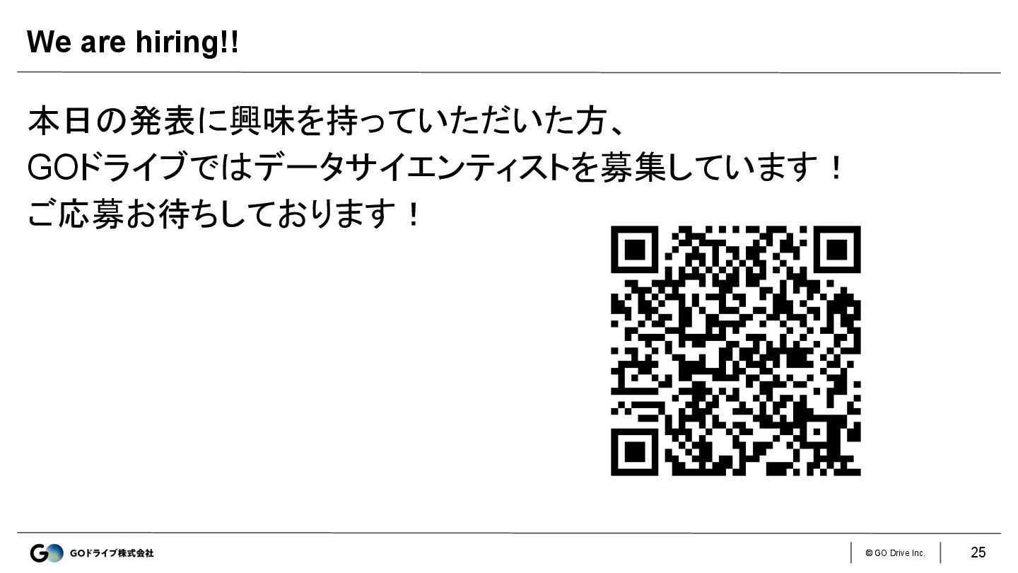 © GO Drive Inc. 本日の発表に興味を持っていただいた方、 GOドライブではデータサイエンティストを募集しています! ご応募お待ちしております! We are hiring!!