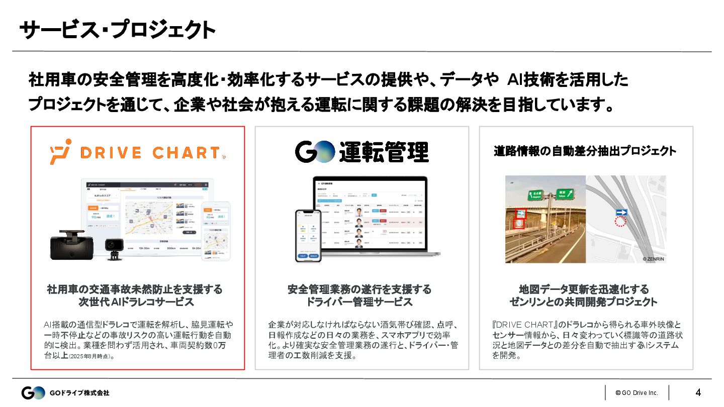 台以上(2025年8月時点)。 サービス・プロジェクト 4 道路情報の自動差分抽出プロジェクト 社用車の安全管理を高度化・効率化するサービスの提供や、データや AI技術を活用した プロジェクトを通じて、企業や社会が抱える運転に関する課題の解決を目指しています。 安全管理業務の遂行を支援する ドライバー管理サービス 企業が対応しなければならない酒気帯び確認、点呼、 日報作成などの日々の業務を、スマホアプリで効率 化。より確実な安全管理業務の遂行と、ドライバー・管 理者の工数削減を支援。 地図データ更新を迅速化する ゼンリンとの共同開発プロジェクト 『DRIVE CHART』のドラレコから得られる車外映像と センサー情報から、日々変わっていく標識等の道路状 況と地図データとの差分を自動で抽出する AIシステム を開発。