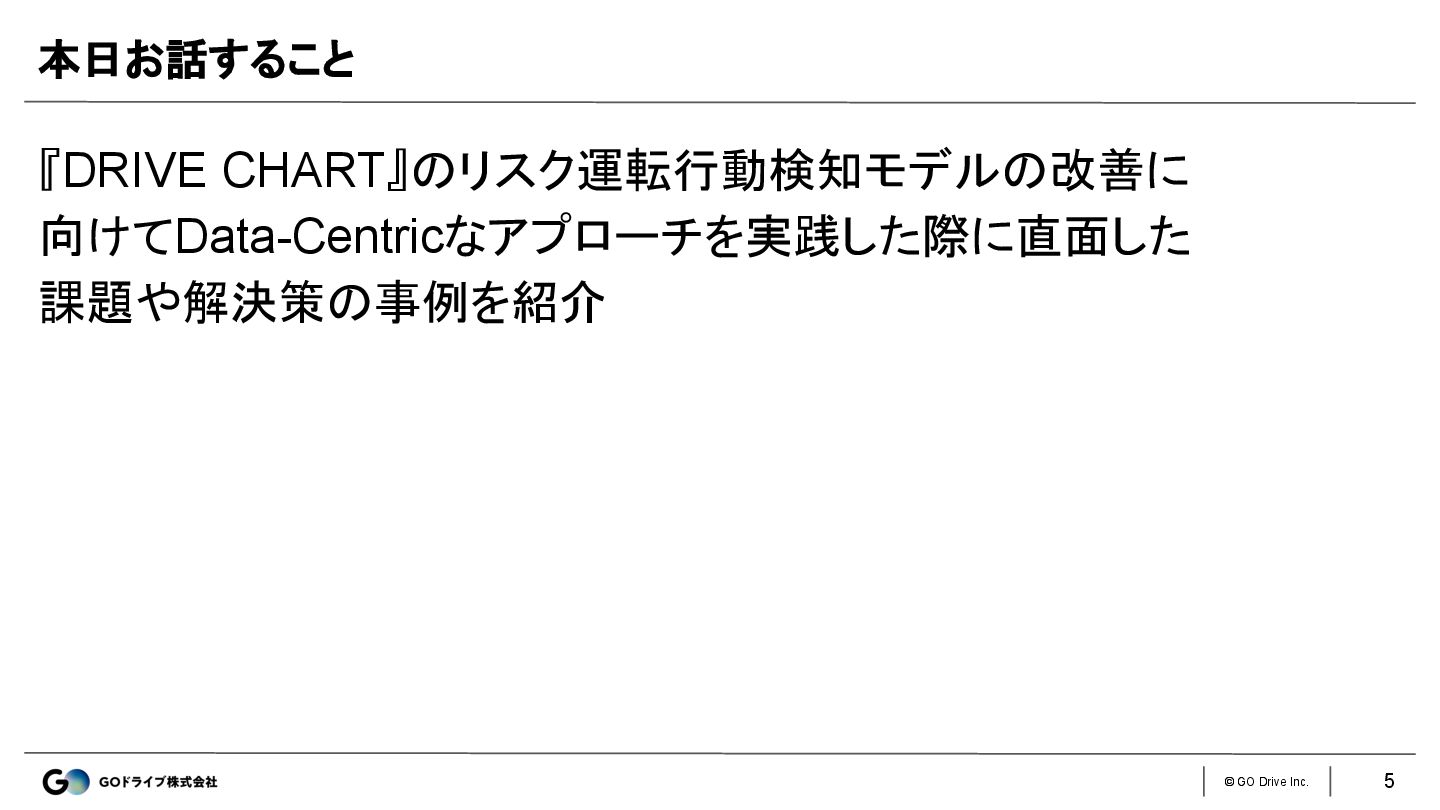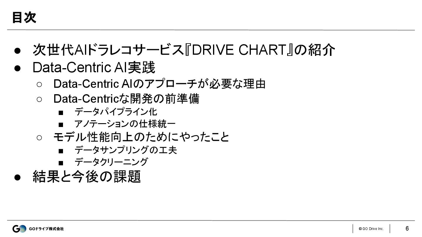 © GO Drive Inc. 5 『DRIVE CHART』のリスク運転行動検知モデルの改善に 向けてData-Centricなアプローチを実践した際に直面した 課題や解決策の事例を紹介 本日お話すること
