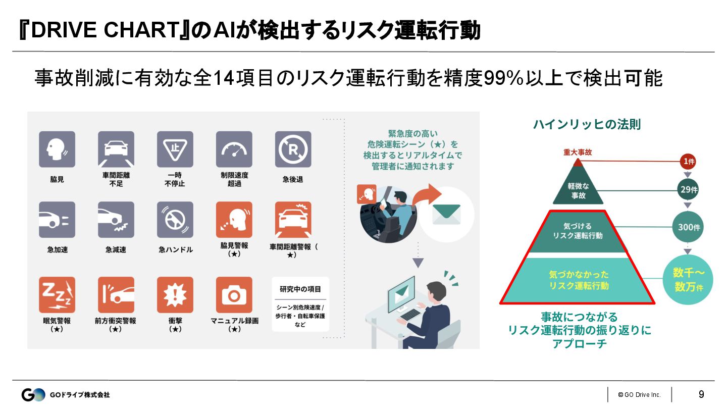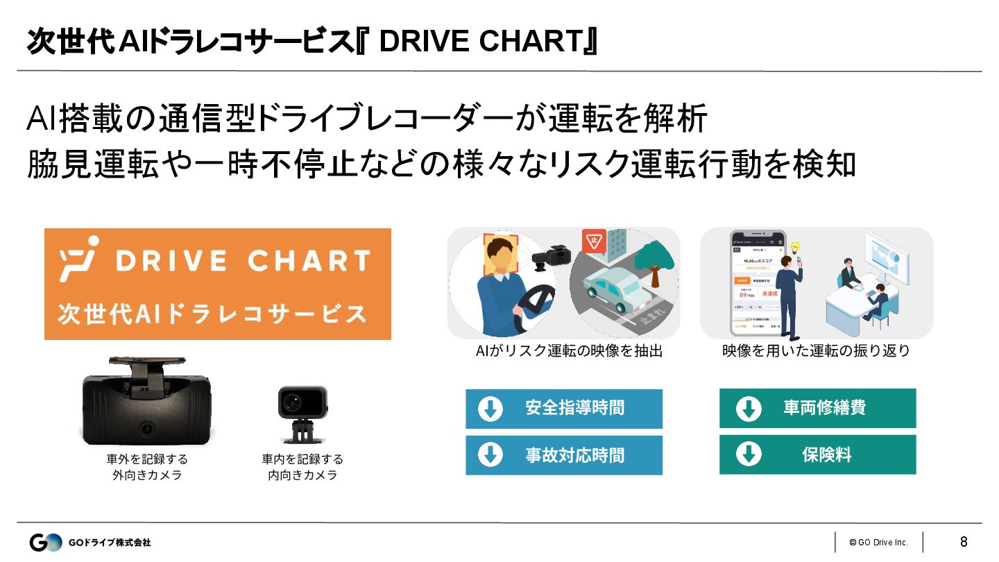 © GO Drive Inc. AI搭載の通信型ドライブレコーダーが運転を解析 脇見運転や一時不停止などの様々なリスク運転行動を検知 次世代AIドラレコサービス『 DRIVE CHART』 8