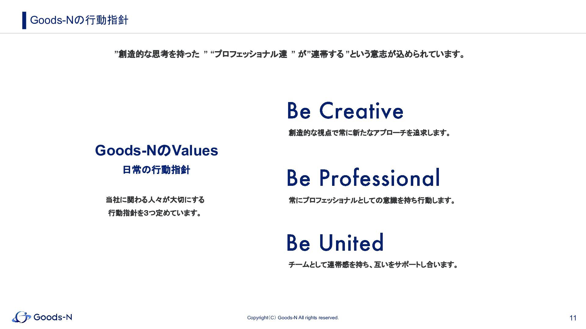 ”創造的な思考を持った ” “プロフェッショナル達 ” が”連帯する ”という意志が込められています。 創造的な視点で常に新たなアプローチを追求します。 常にプロフェッショナルとしての意識を持ち行動します。 チームとして連帯感を持ち、互いをサポートし合います。 Goods-Nの行動指針