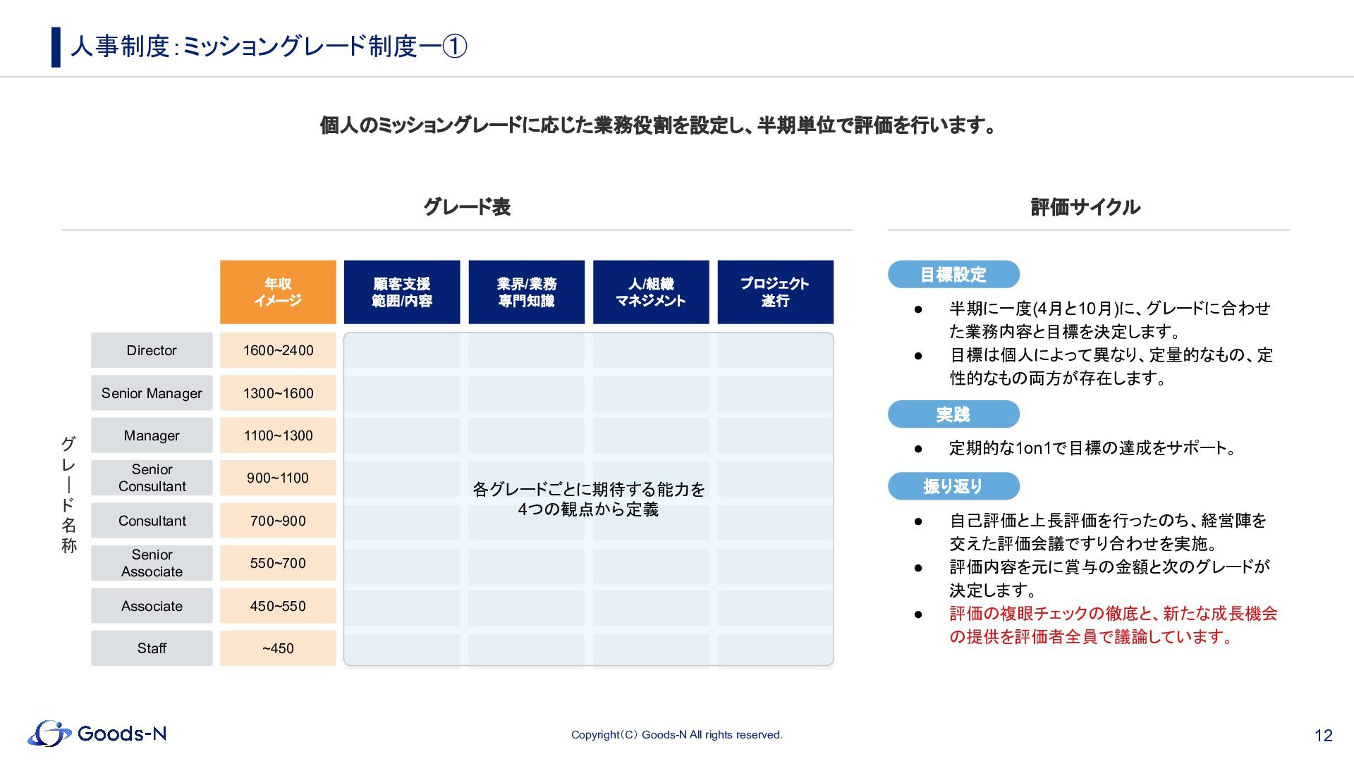 10. 12 Copyright(C) Goods-N All rights reserved. 個人のミッショングレードに応じた業務役割を設定し、半期単位で評価を行います。 人事制度:ミッショングレード制度ー① グ レ