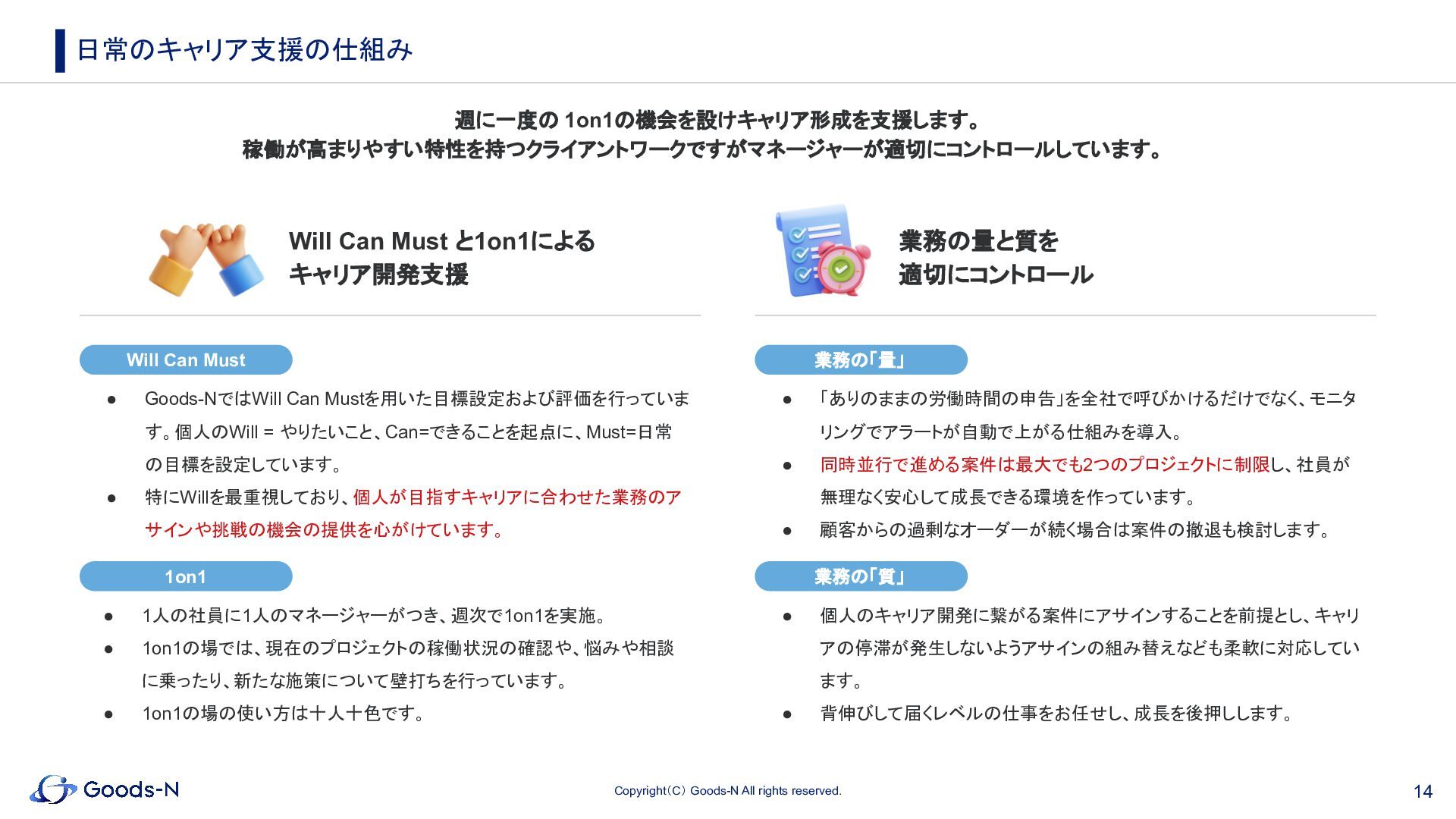 12. 14 Copyright(C) Goods-N All rights reserved. 週に一度の 1on1の機会を設けキャリア形成を支援します。 稼働が高まりやすい特性を持つクライアントワークですがマネージャーが適切にコントロールしています。 日常のキャリア支援の仕組み