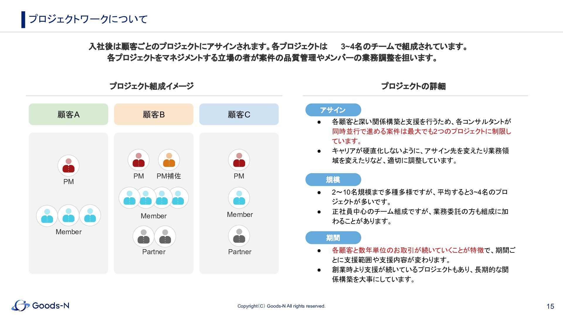 13. 15 Copyright(C) Goods-N All rights reserved. 入社後は顧客ごとのプロジェクトにアサインされます。各プロジェクトは 3~4名のチームで組成されています。 各プロジェクトをマネジメントする立場の者が案件の品質管理やメンバーの業務調整を担います。 プロジェクトワークについて