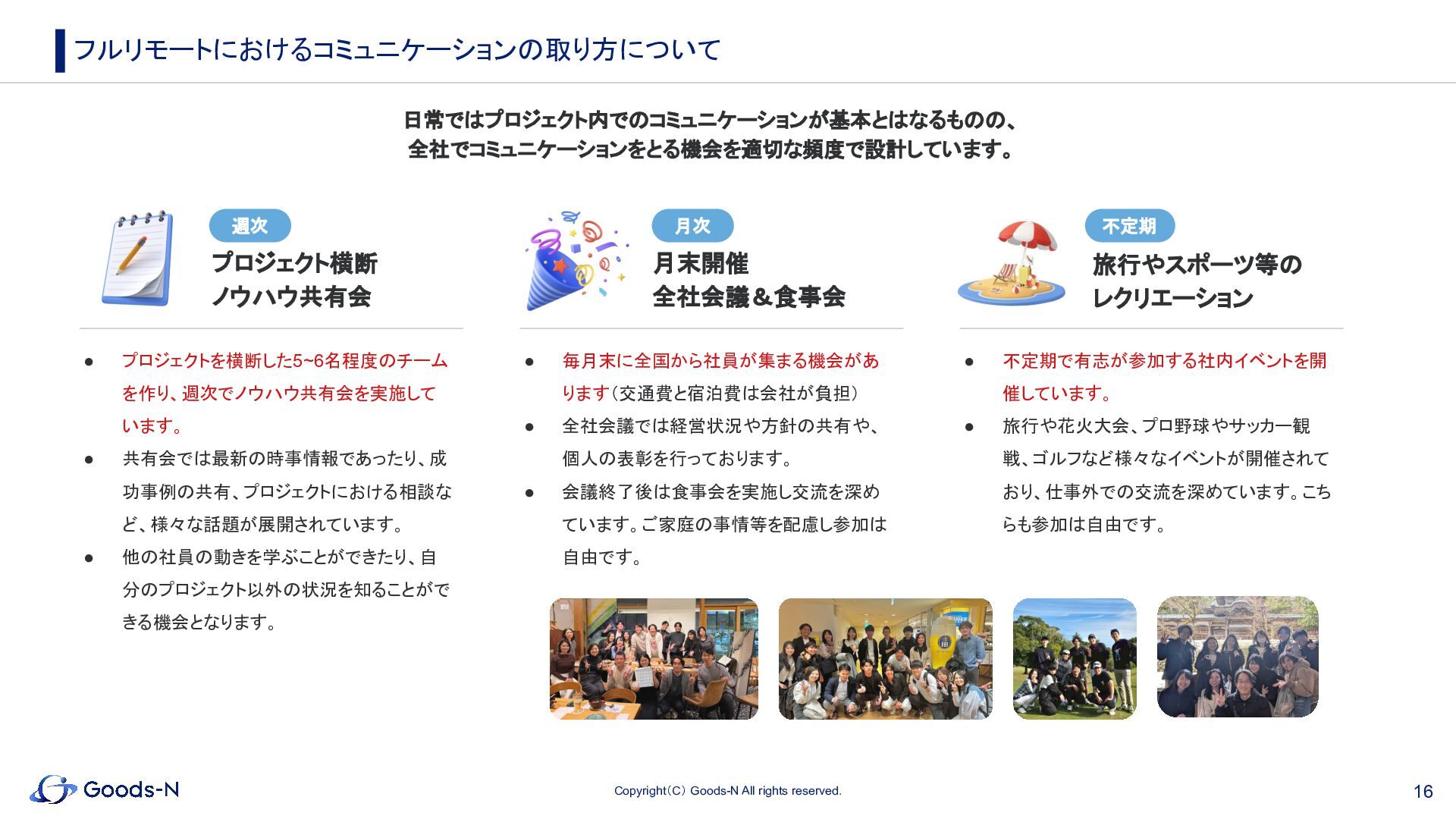 14. 16 Copyright(C) Goods-N All rights reserved. 日常ではプロジェクト内でのコミュニケーションが基本とはなるものの、 全社でコミュニケーションをとる機会を適切な頻度で設計しています。 フルリモートにおけるコミュニケーションの取り方について プロジェクト横断