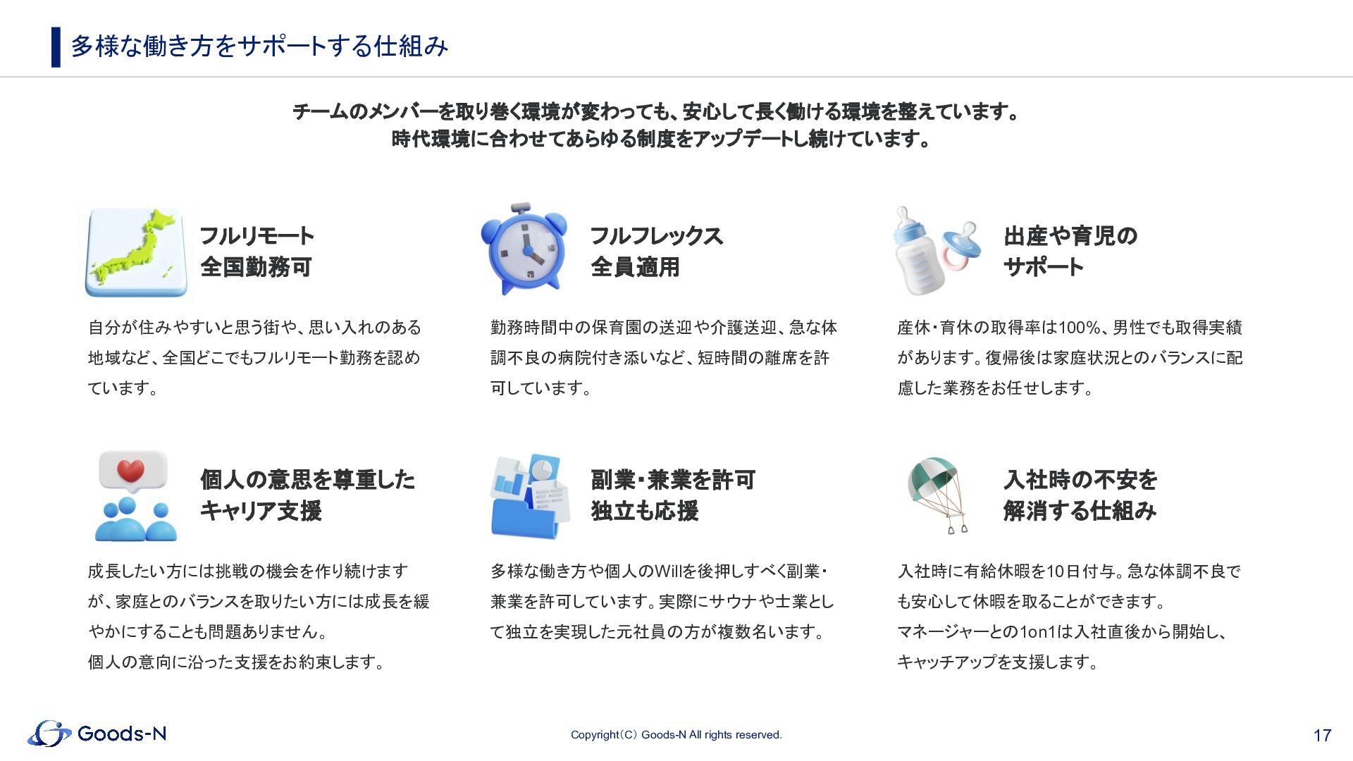15. 17 Copyright(C) Goods-N All rights reserved. チームのメンバーを取り巻く環境が変わっても、安心して長く働ける環境を整えています。 時代環境に合わせてあらゆる制度をアップデートし続けています。 多様な働き方をサポートする仕組み フルリモート