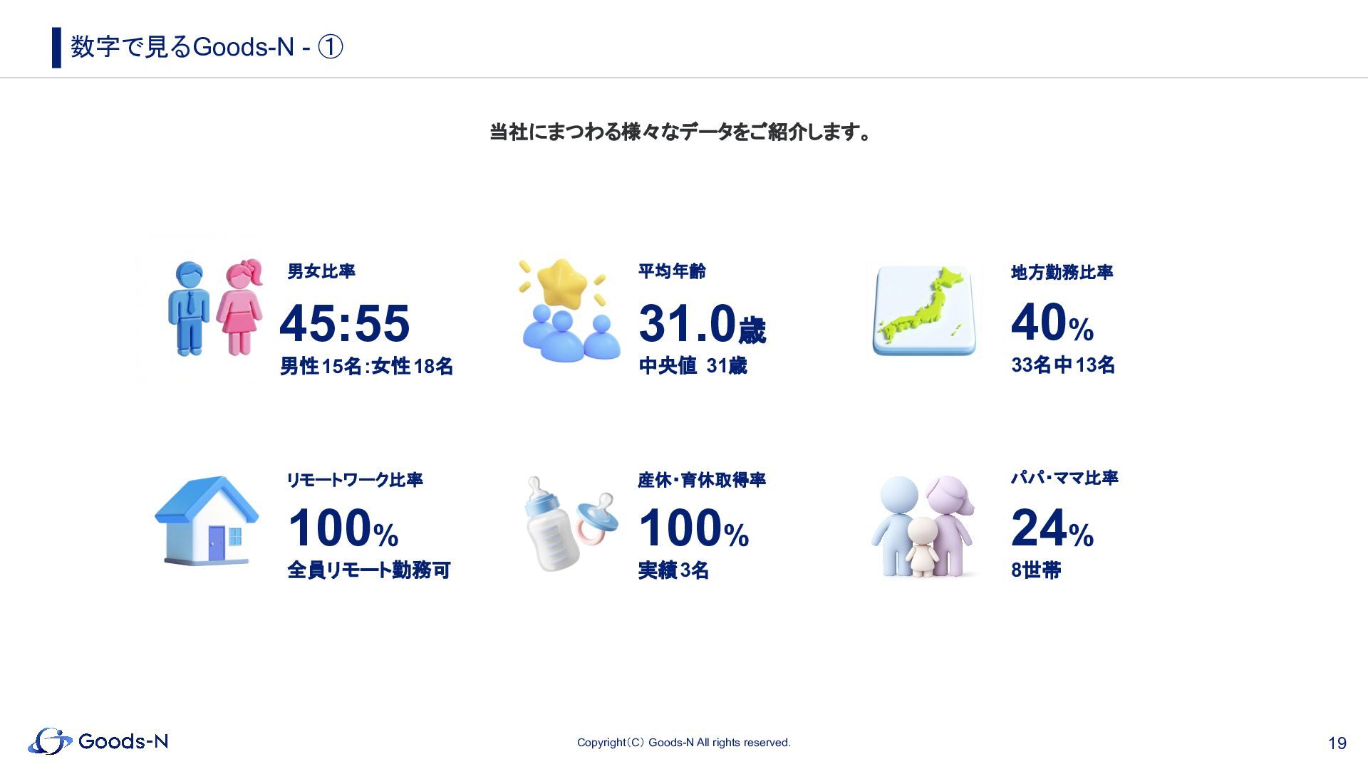 50% 地方勤務比率 40% 33名中13名 男女比率 45:55 男性15名:女性18名 産休・育休取得率 100% 実績3名 リモートワーク比率 100% 全員リモート勤務可 平均年齢 31.0歳 中央値 31歳 パパ・ママ比率 24% 8世帯 当社にまつわる様々なデータをご紹介します。