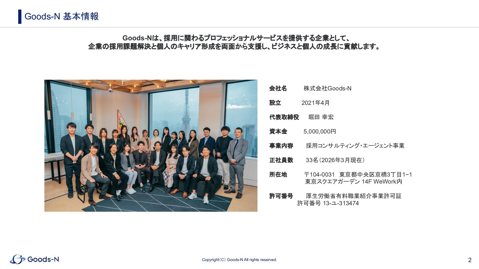 代表取締役   堀田 幸宏 資本金    5,000,000円 事業内容   採用コンサルティング・エージェント事業 正社員数   33名(2026年3月現在)   所在地    〒104-0031 東京都中央区京橋3丁目1−1      東京スクエアガーデン 14F WeWork内 許可番号   厚生労働省有料職業紹介事業許可証        許可番号 13-ユ-313474 Goods-Nは、採用に関わるプロフェッショナルサービスを提供する企業として、 企業の採用課題解決と個人のキャリア形成を両面から支援し、ビジネスと個人の成長に貢献します。