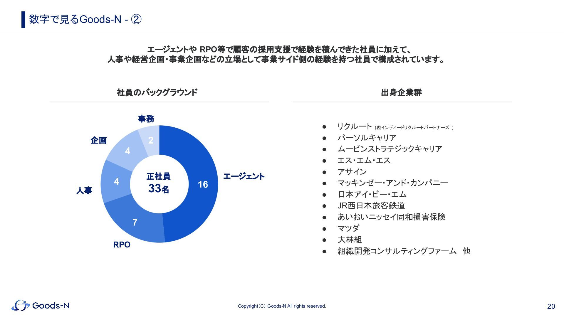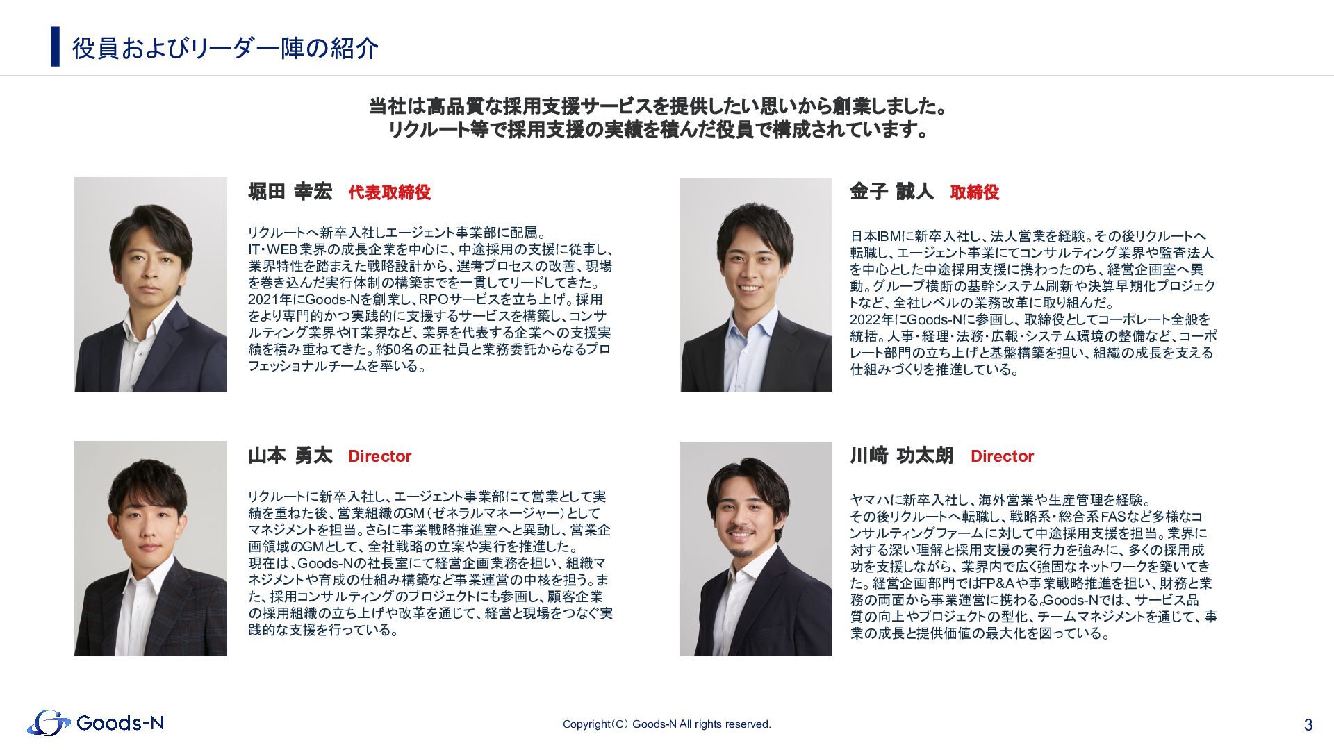 業界特性を踏まえた戦略設計から、選考プロセスの改善、現場 を巻き込んだ実行体制の構築までを一貫してリードしてきた。 2021年にGoods-Nを創業し、RPOサービスを立ち上げ。採用 をより専門的かつ実践的に支援するサービスを構築し、コンサ ルティング業界やIT業界など、業界を代表する企業への支援実 績を積み重ねてきた。約 50名の正社員と業務委託からなるプロ フェッショナルチームを率いる。 役員およびリーダー陣の紹介 金子 誠人 取締役 日本IBMに新卒入社し、法人営業を経験。その後リクルートへ 転職し、エージェント事業にてコンサルティング業界や監査法人 を中心とした中途採用支援に携わったのち、経営企画室へ異 動。グループ横断の基幹システム刷新や決算早期化プロジェク トなど、全社レベルの業務改革に取り組んだ。 2022年にGoods-Nに参画し、取締役としてコーポレート全般を 統括。人事・経理・法務・広報・システム環境の整備など、コーポ レート部門の立ち上げと基盤構築を担い、組織の成長を支える 仕組みづくりを推進している。 山本 勇太 Director リクルートに新卒入社し、エージェント事業部にて営業として実 績を重ねた後、営業組織の GM(ゼネラルマネージャー)として マネジメントを担当。さらに事業戦略推進室へと異動し、営業企 画領域のGMとして、全社戦略の立案や実行を推進した。 現在は、Goods-Nの社長室にて経営企画業務を担い、組織マ ネジメントや育成の仕組み構築など事業運営の中核を担う。ま た、採用コンサルティングのプロジェクトにも参画し、顧客企業 の採用組織の立ち上げや改革を通じて、経営と現場をつなぐ実 践的な支援を行っている。 川﨑 功太朗 Director ヤマハに新卒入社し、海外営業や生産管理を経験。 その後リクルートへ転職し、戦略系・総合系・ FASなど多様なコ ンサルティングファームに対して中途採用支援を担当。業界に 対する深い理解と採用支援の実行力を強みに、多くの採用成 功を支援しながら、業界内で広く強固なネットワークを築いてき た。経営企画部門では FP&Aや事業戦略推進を担い、財務と業 務の両面から事業運営に携わる。 Goods-Nでは、サービス品 質の向上やプロジェクトの型化、チームマネジメントを通じて、事 業の成長と提供価値の最大化を図っている。 当社は高品質な採用支援サービスを提供したい思いから創業しました。 リクルート等で採用支援の実績を積んだ役員で構成されています。