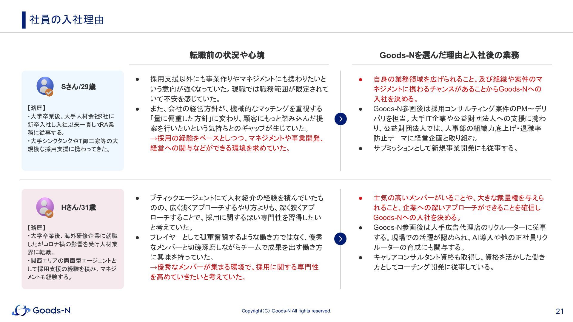 18. 21 Copyright(C) Goods-N All rights reserved. 社員の入社理由 Sさん/29歳 • 採用支援以外にも事業作りやマネジメントにも携わりたいと