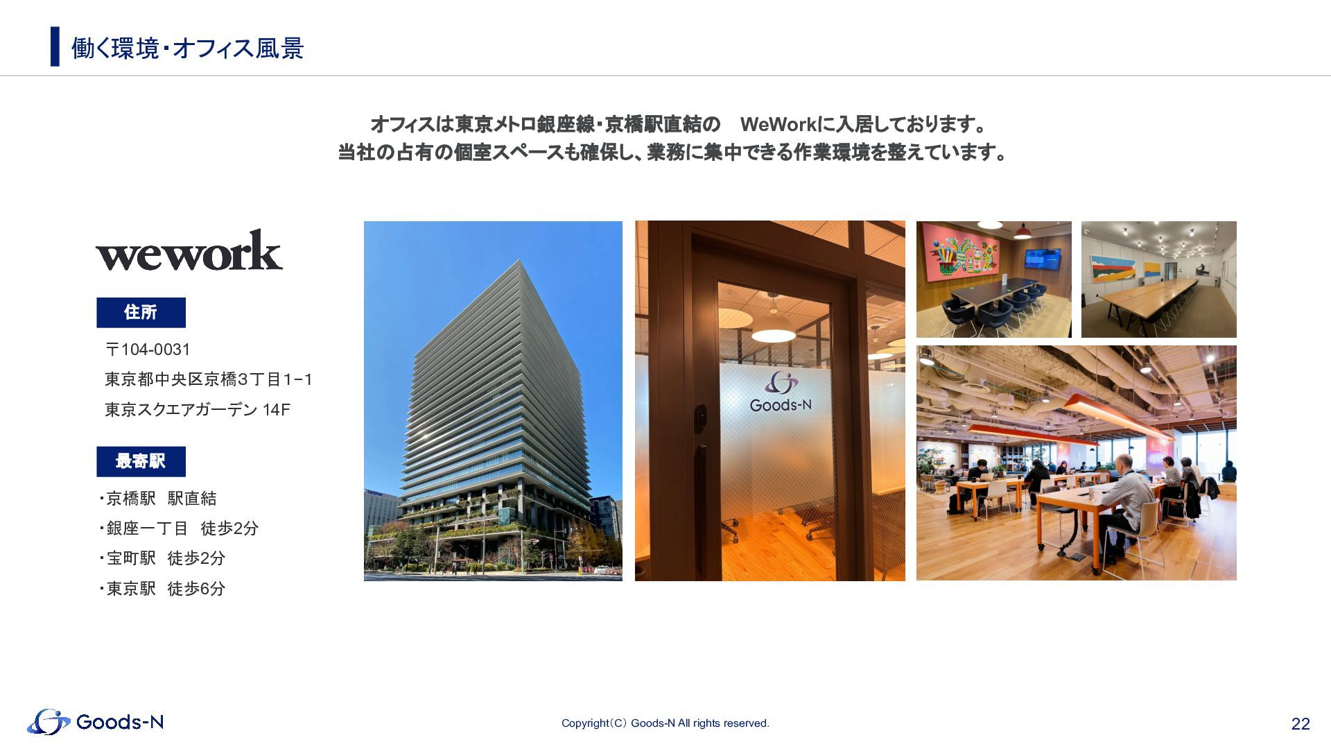 19. 22 Copyright(C) Goods-N All rights reserved. 働く環境・オフィス風景 ・京橋駅 駅直結 ・銀座一丁目 徒歩2分 ・宝町駅 徒歩2分
