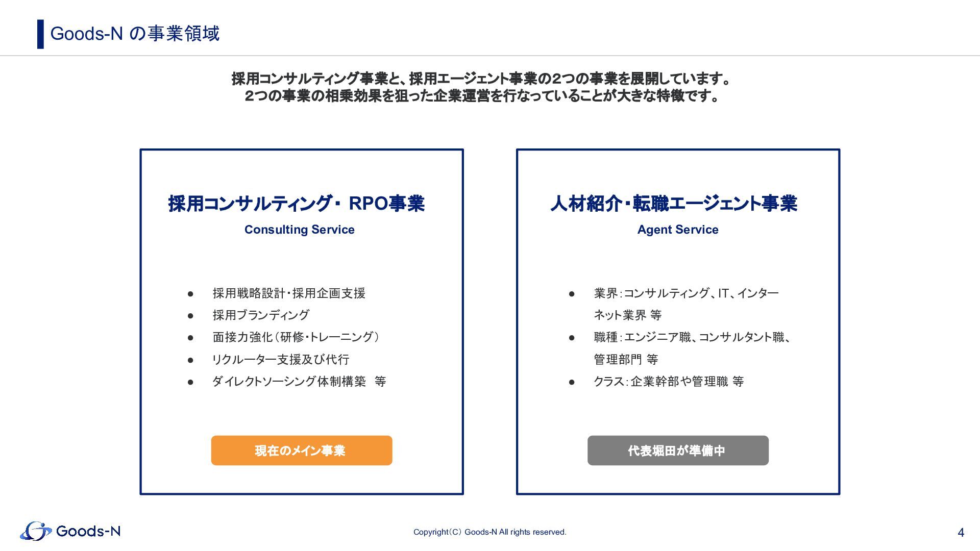 3. 4 Copyright(C) Goods-N All rights reserved. 採用コンサルティング事業 Consulting Service 人材紹介・転職エージェント事業