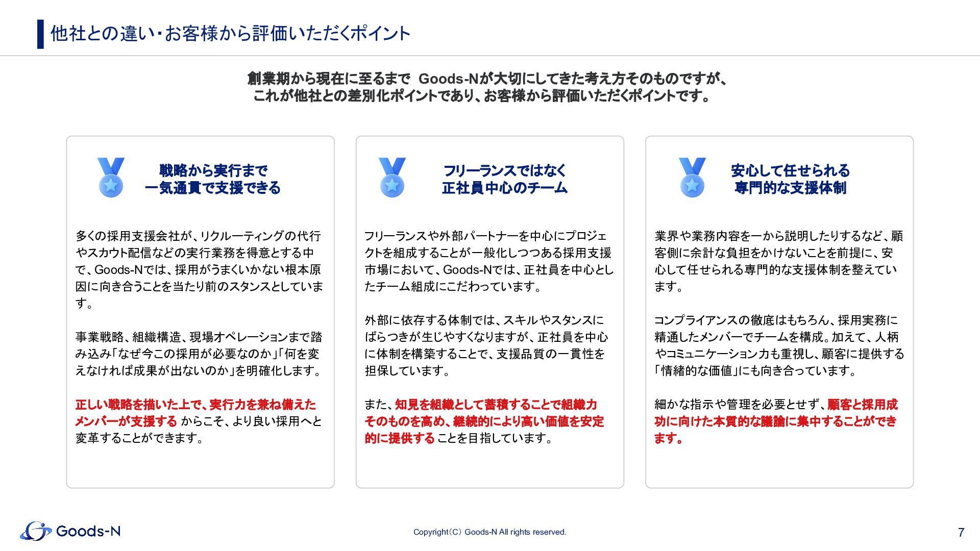 6. 7 Copyright(C) Goods-N All rights reserved. 業界や業務内容を一から説明したりするなど、顧 客側に余計な負担をかけないことを前提に、安 心して任せられる専門的な支援体制を整えてい ます。
