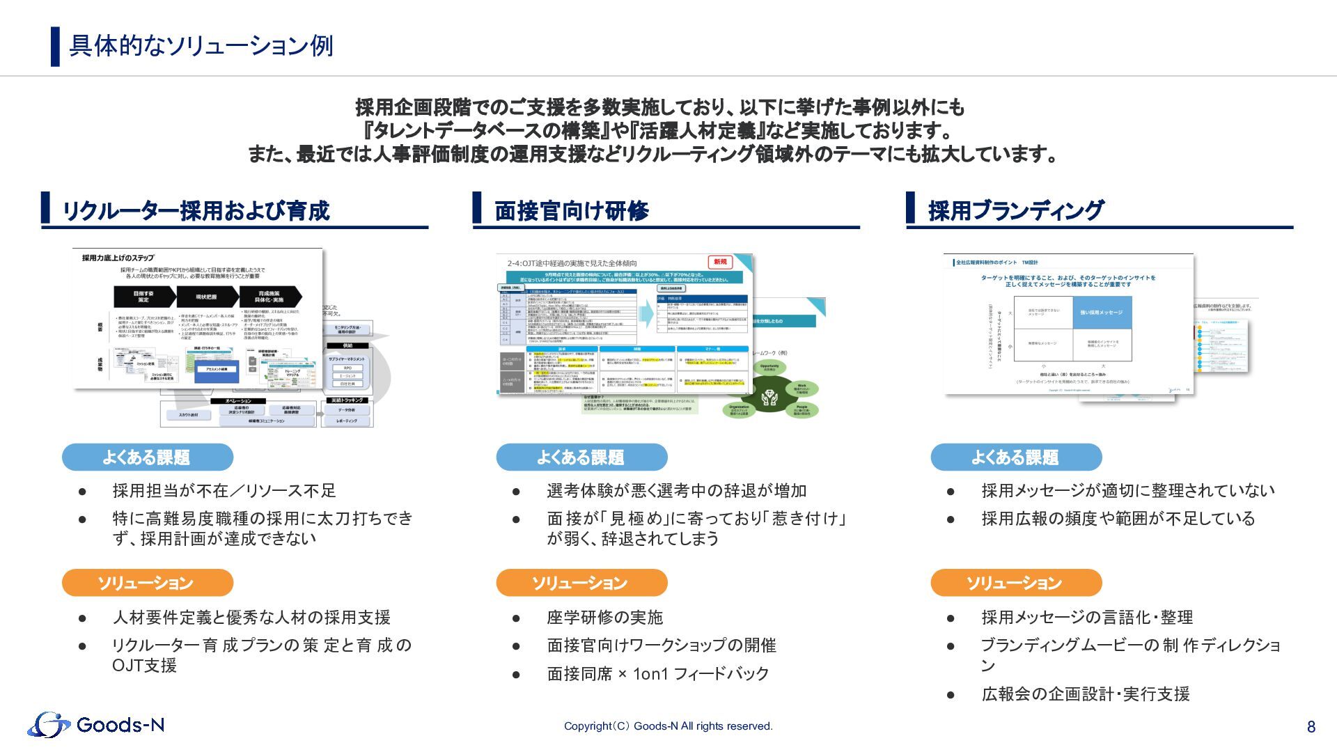 7. 8 Copyright(C) Goods-N All rights reserved. 具体的なソリューション例 採用企画段階でのご支援を多数実施しており、以下に挙げた事例以外にも 『タレントデータベースの構築』や『活躍人材定義』など実施しております。 また、最近では人事評価制度の運用支援などリクルーティング領域外のテーマにも拡大しています。