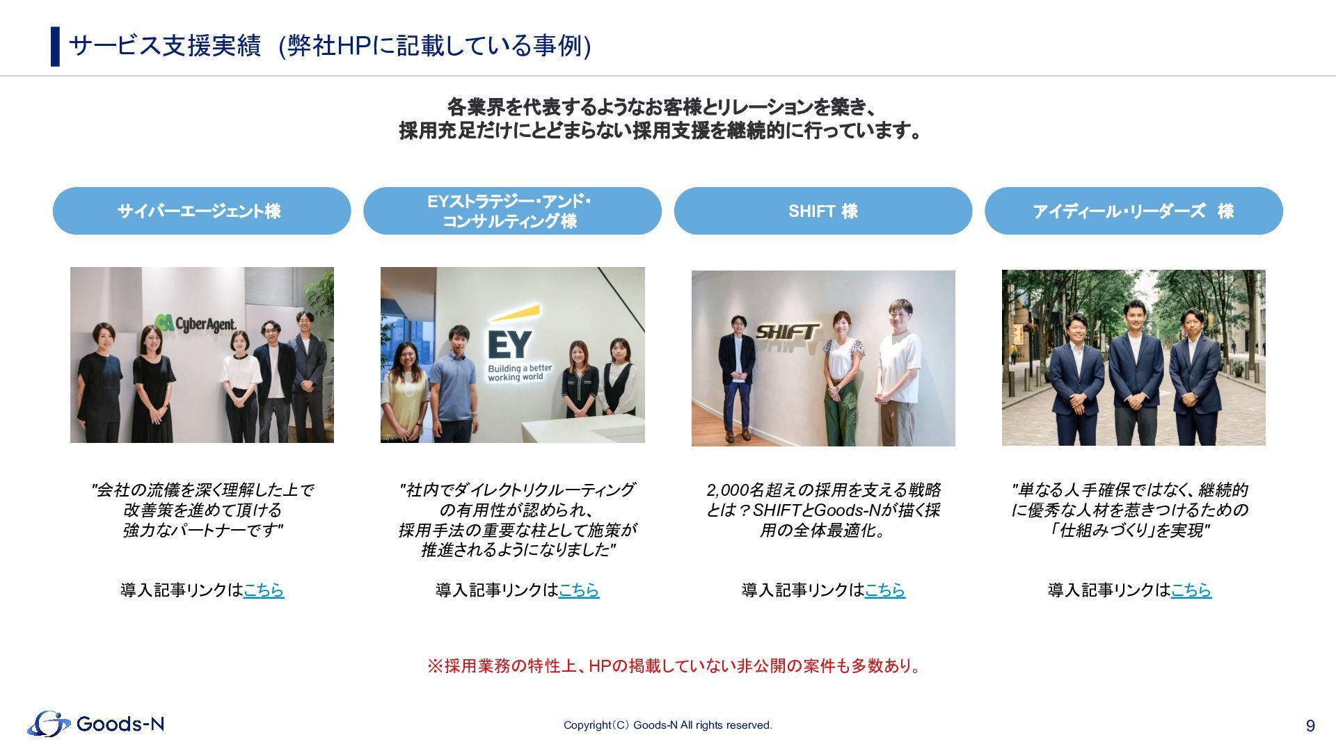 8. 9 Copyright(C) Goods-N All rights reserved. サービス支援実績 (弊社HPに記載している事例) 各業界を代表するようなお客様とリレーションを築き、 採用充足だけにとどまらない採用支援を継続的に行っています。 サイバーエージェント様