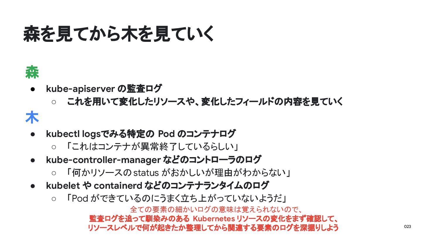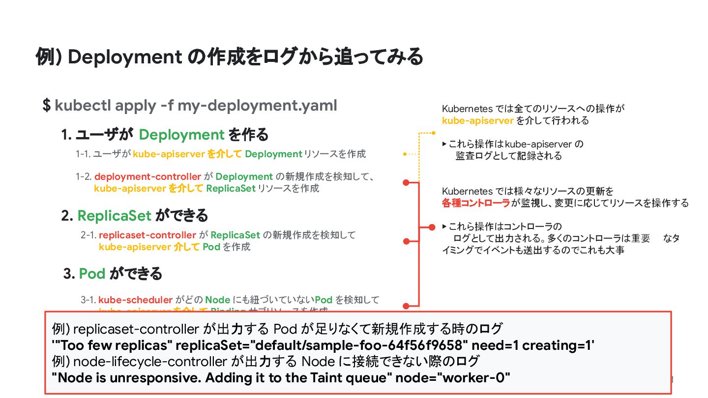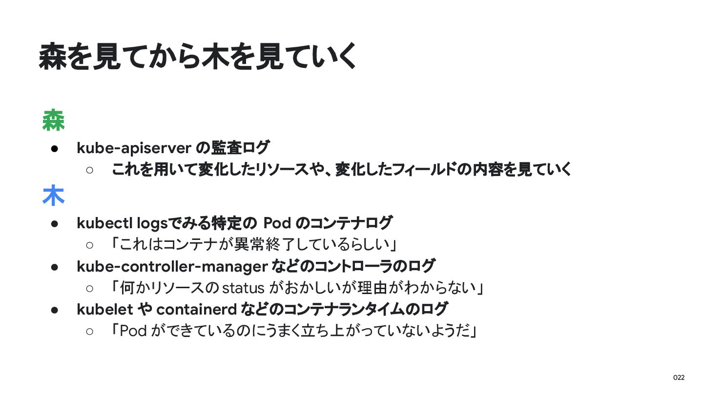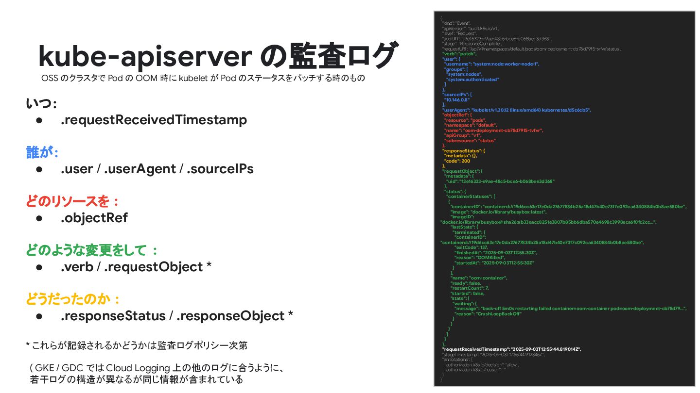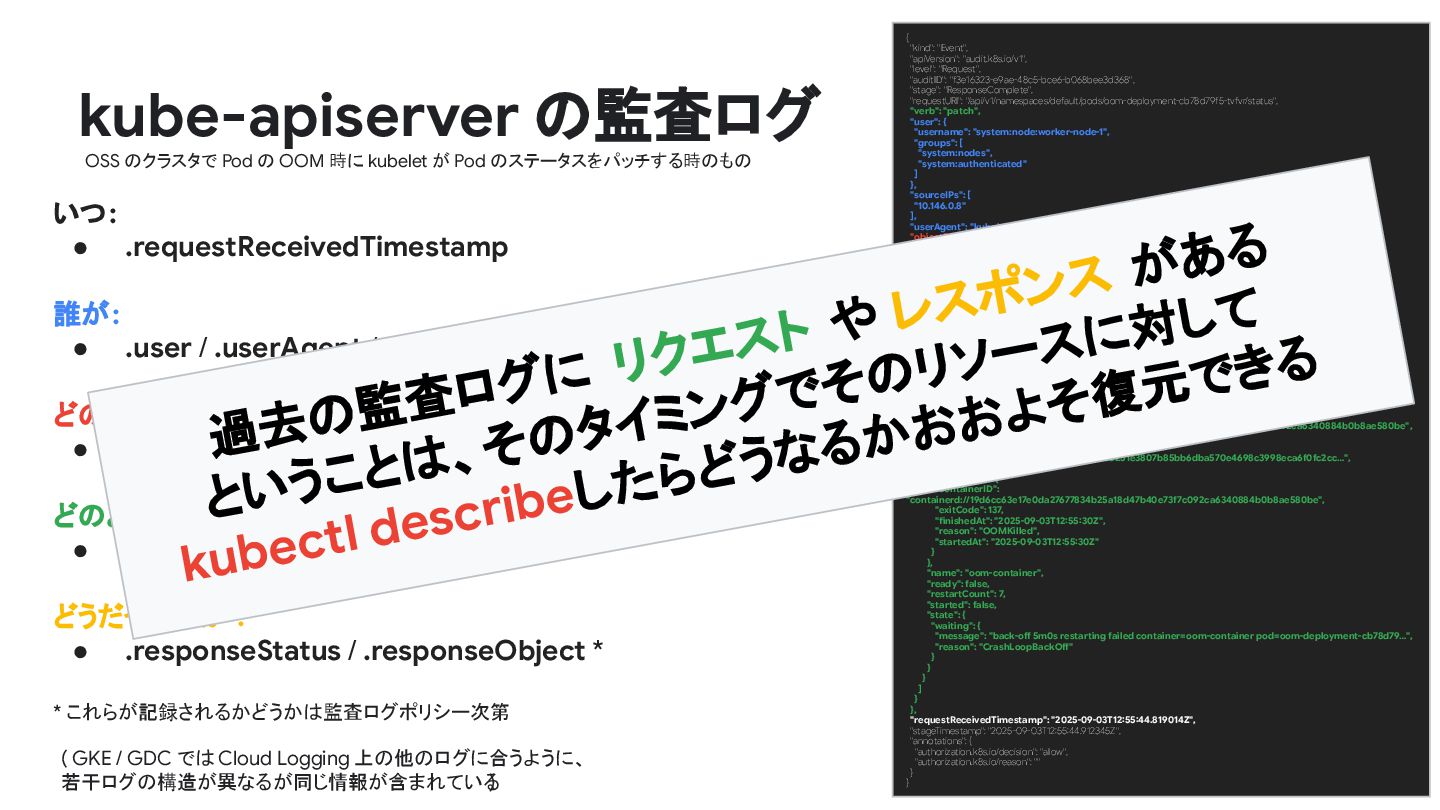 "auditID": "f3e16323-e9ae-48c5-bce6-b068bee3d368", "stage": "ResponseComplete", "requestURI": "/api/v1/namespaces/default/pods/oom-deployment-cb78d79f5-tvfvr/status", "verb": "patch", "user": { "username": "system:node:worker-node-1", "groups": [ "system:nodes", "system:authenticated" ] }, "sourceIPs": [ "10.146.0.8" ], "userAgent": "kubelet/v1.30.12 (linux/amd64) kubernetes/d5c6cb5", "objectRef": { "resource": "pods", "namespace": "default", "name": "oom-deployment-cb78d79f5-tvfvr", "apiGroup": "v1", "subresource": "status" }, "responseStatus": { "metadata": {}, "code": 200 }, "requestObject": { "metadata": { "uid": "f3e16323-e9ae-48c5-bce6-b068bee3d368" }, "status": { "containerStatuses": [ { "containerID": "containerd://19d6cc63e17e0da27677834b25a18d47b40e73f7c092ca6340884b0b8ae580be", "image": "docker.io/library/busybox:latest", "imageID": "docker.io/library/busybox@sha26:ab33eacc8251e3807b85bb6dba570e4698c3998eca6f0fc2cc…", "lastState": { "terminated": { "containerID": "containerd://19d6cc63e17e0da27677834b25a18d47b40e73f7c092ca6340884b0b8ae580be", "exitCode": 137, "finishedAt": "2025-09-03T12:55:30Z", "reason": "OOMKilled", "startedAt": "2025-09-03T12:55:30Z" } }, "name": "oom-container", "ready": false, "restartCount": 7, "started": false, "state": { "waiting": { "message": "back-off 5m0s restarting failed container=oom-container pod=oom-deployment-cb78d79…", "reason": "CrashLoopBackOff" } } } ] } }, "requestReceivedTimestamp": "2025-09-03T12:55:44.819014Z", "stageTimestamp": "2025-09-03T12:55:44.912345Z", "annotations": { "authorization.k8s.io/decision": "allow", "authorization.k8s.io/reason": "" } } いつ: • .requestReceivedTimestamp 誰が: • .user / .userAgent / .sourceIPs どのリソースを : • .objectRef どのような変更をして : • .verb / .requestObject * どうだったのか : • .responseStatus / .responseObject * * これらが記録されるかどうかは監査ログポリシー次第 ( GKE / GDC では Cloud Logging 上の他のログに合うように、 若干ログの構造が異なるが同じ情報が含まれている ) OSS のクラスタで Pod の OOM 時に kubelet が Pod のステータスをパッチする時のもの 過去の監査ログに リクエスト や レスポンス がある ということは、そのタイミングでそのリソースに対して kubectl describeしたらどうなるかおおよそ復元できる
