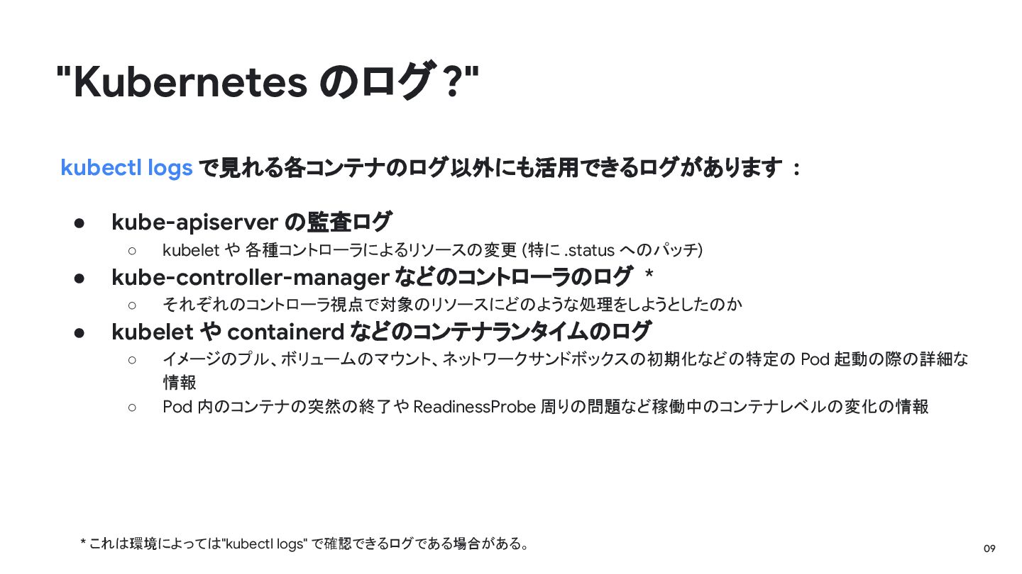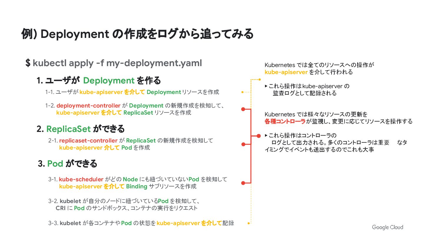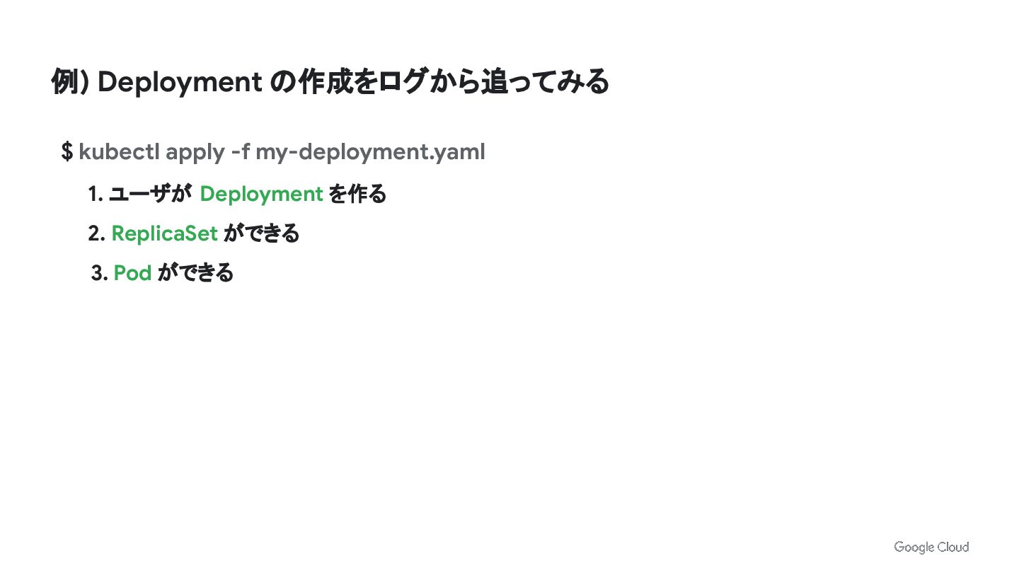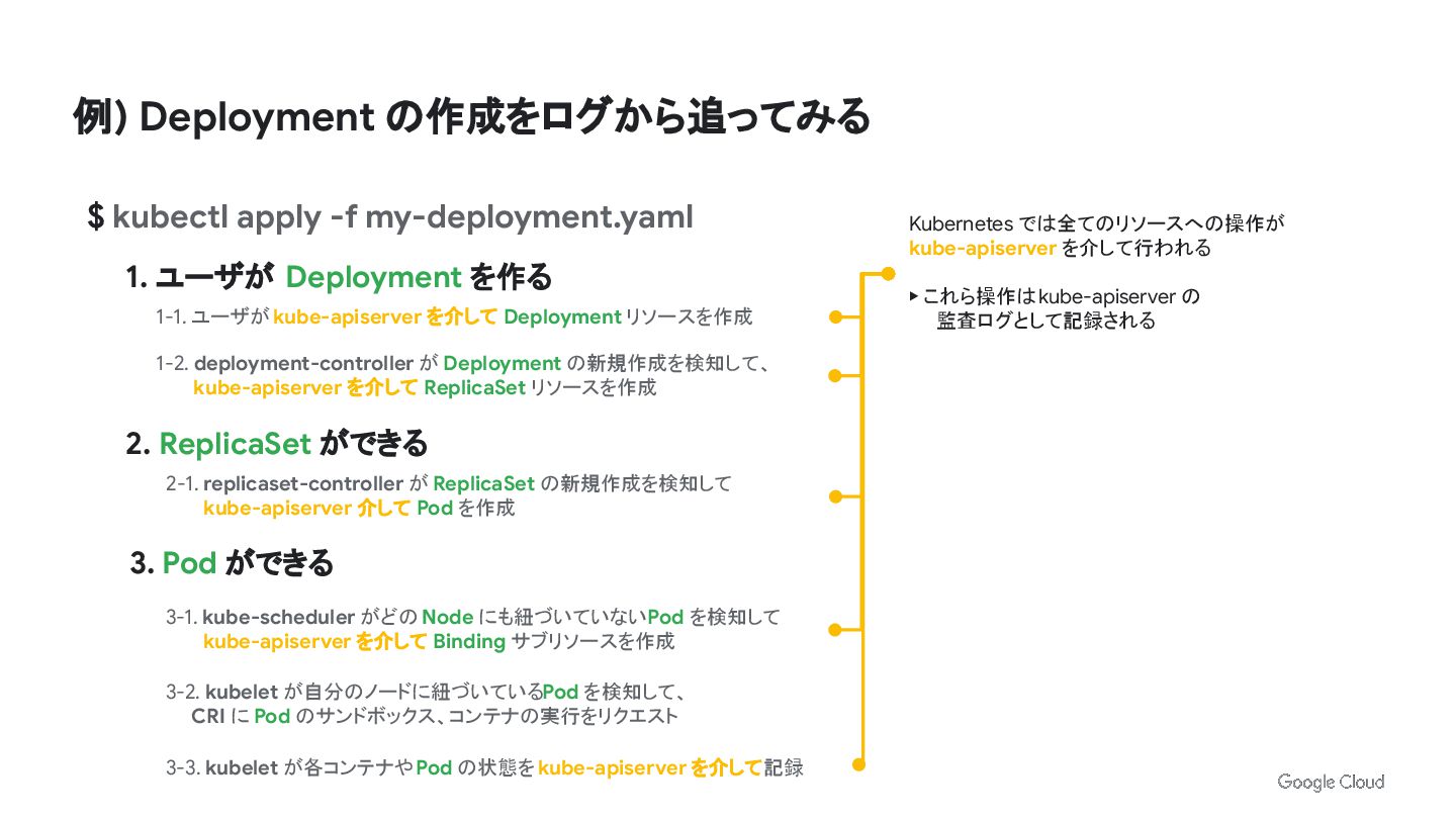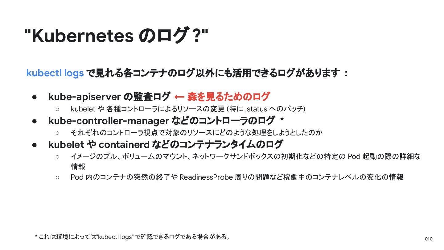 "auditID": "f3e16323-e9ae-48c5-bce6-b068bee3d368", "stage": "ResponseComplete", "requestURI": "/api/v1/namespaces/default/pods/oom-deployment-cb78d79f5-tvfvr/status", "verb": "patch", "user": { "username": "system:node:worker-node-1", "groups": [ "system:nodes", "system:authenticated" ] }, "sourceIPs": [ "10.146.0.8" ], "userAgent": "kubelet/v1.30.12 (linux/amd64) kubernetes/d5c6cb5", "objectRef": { "resource": "pods", "namespace": "default", "name": "oom-deployment-cb78d79f5-tvfvr", "apiGroup": "v1", "subresource": "status" }, "responseStatus": { "metadata": {}, "code": 200 }, "requestObject": { "metadata": { "uid": "f3e16323-e9ae-48c5-bce6-b068bee3d368" }, "status": { "containerStatuses": [ { "containerID": "containerd://19d6cc63e17e0da27677834b25a18d47b40e73f7c092ca6340884b0b8ae580be", "image": "docker.io/library/busybox:latest", "imageID": "docker.io/library/busybox@sha26:ab33eacc8251e3807b85bb6dba570e4698c3998eca6f0fc2cc…", "lastState": { "terminated": { "containerID": "containerd://19d6cc63e17e0da27677834b25a18d47b40e73f7c092ca6340884b0b8ae580be", "exitCode": 137, "finishedAt": "2025-09-03T12:55:30Z", "reason": "OOMKilled", "startedAt": "2025-09-03T12:55:30Z" } }, "name": "oom-container", "ready": false, "restartCount": 7, "started": false, "state": { "waiting": { "message": "back-off 5m0s restarting failed container=oom-container pod=oom-deployment-cb78d79…", "reason": "CrashLoopBackOff" } } } ] } }, "requestReceivedTimestamp": "2025-09-03T12:55:44.819014Z", "stageTimestamp": "2025-09-03T12:55:44.912345Z", "annotations": { "authorization.k8s.io/decision": "allow", "authorization.k8s.io/reason": "" } } いつ: • .requestReceivedTimestamp 誰が: • .user / .userAgent / .sourceIPs どのリソースを : • .objectRef どのような変更をして : • .verb / .requestObject * どうだったのか : • .responseStatus / .responseObject * * これらが記録されるかどうかは監査ログポリシー次第 ( GKE / GDC では Cloud Logging 上の他のログに合うように、 若干ログの構造が異なるが同じ情報が含まれている ) OSS のクラスタで Pod の OOM 時に kubelet が Pod のステータスをパッチする時のもの 過去の監査ログに リクエスト や レスポンス がある ということは、そのタイミングでそのリソースに対して kubectl describeしたらどうなるかおおよそ復元できる