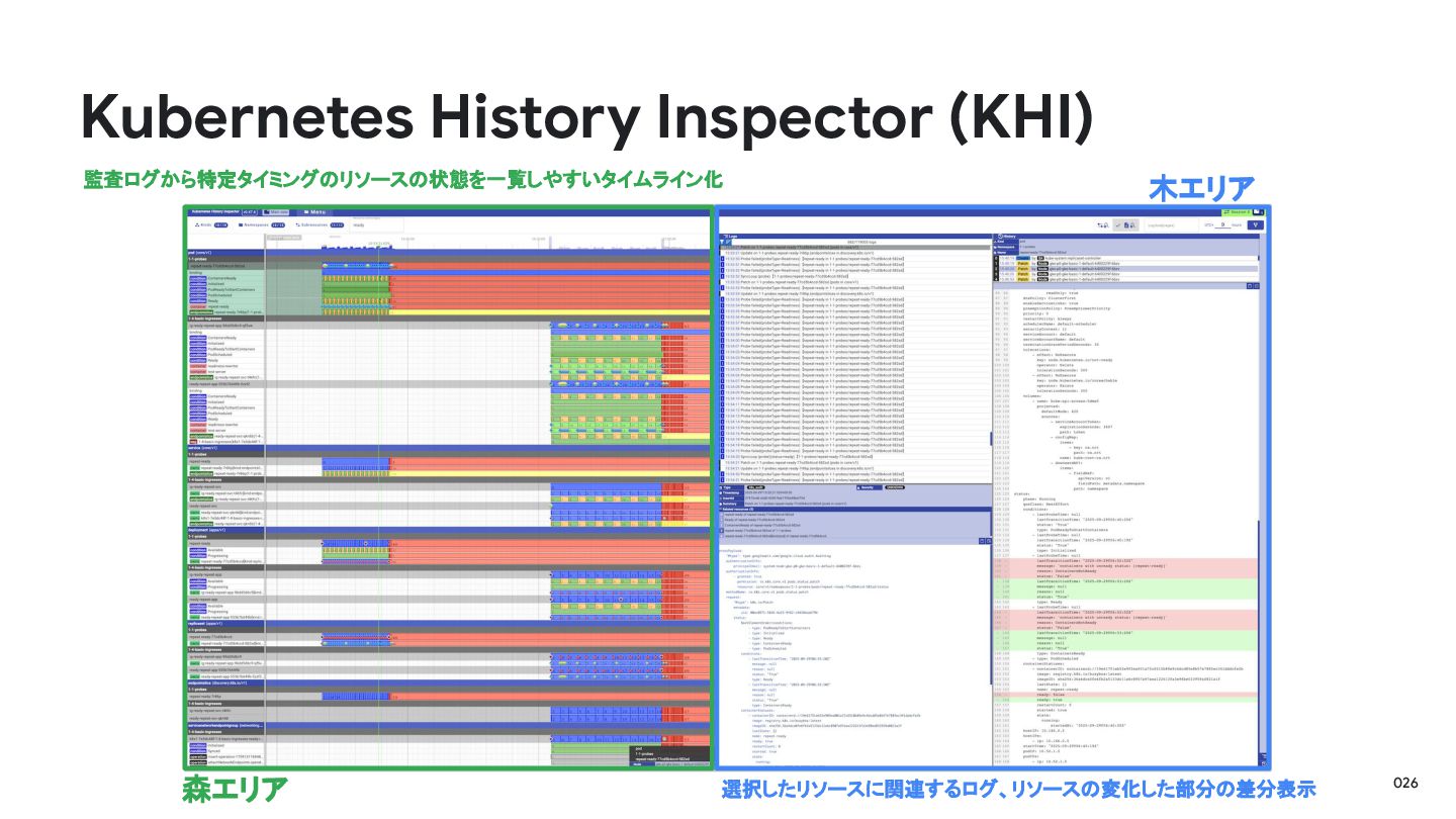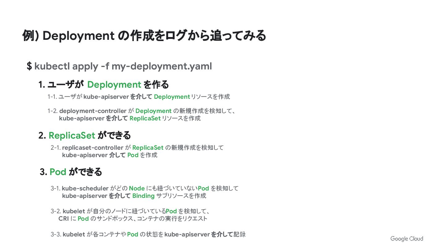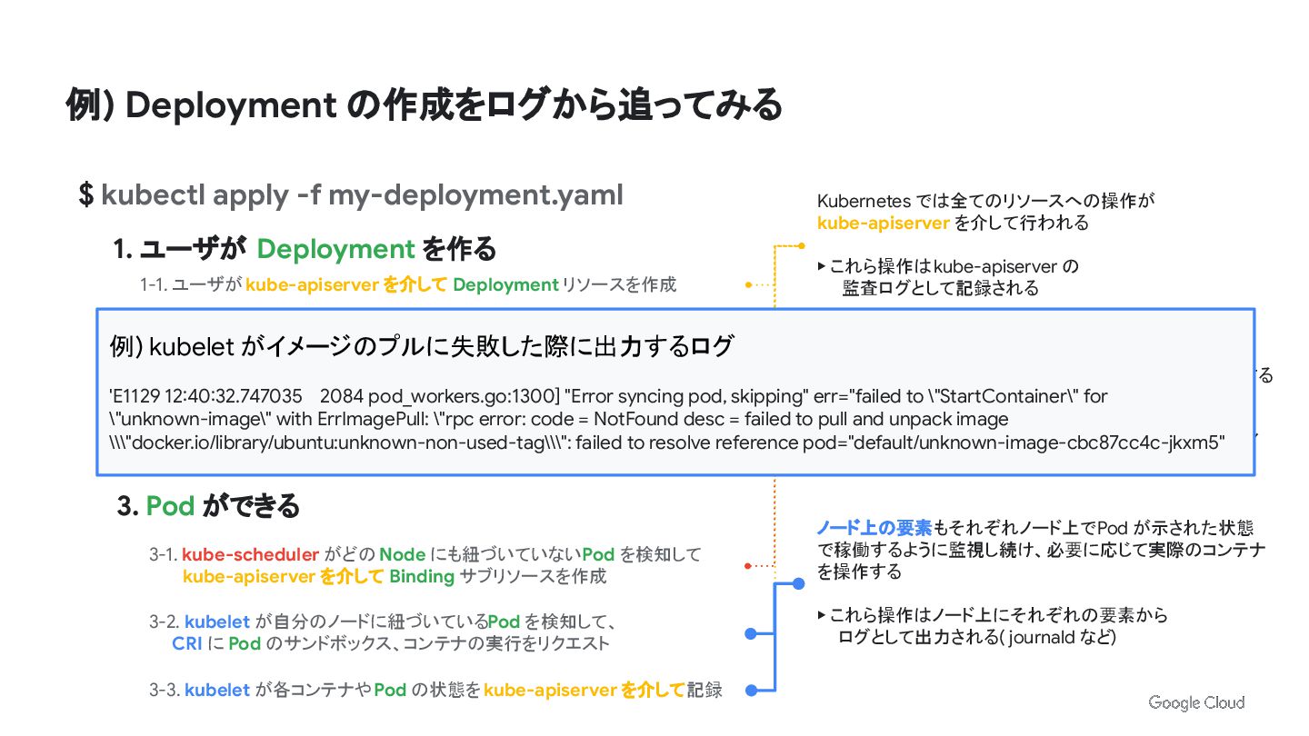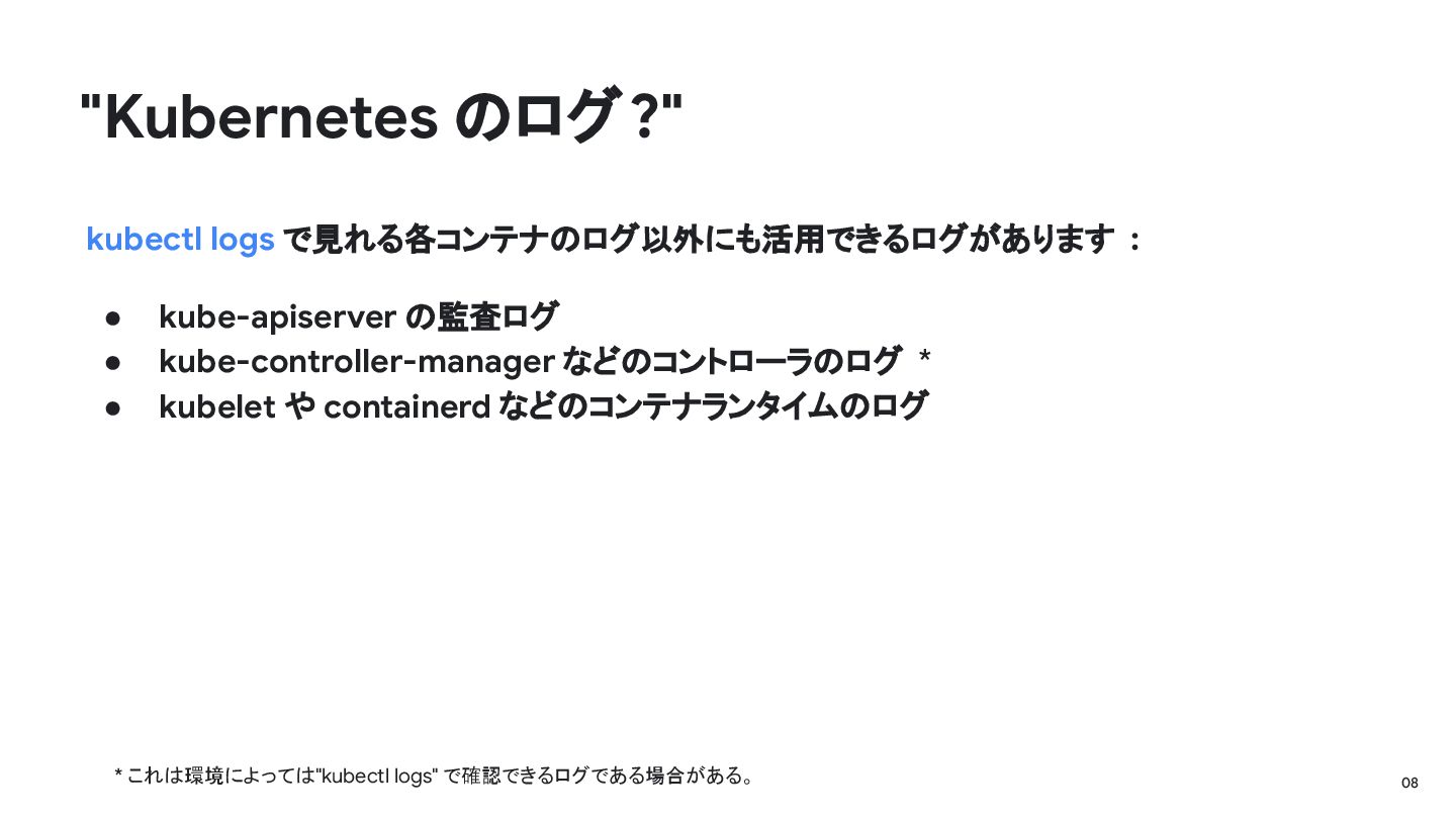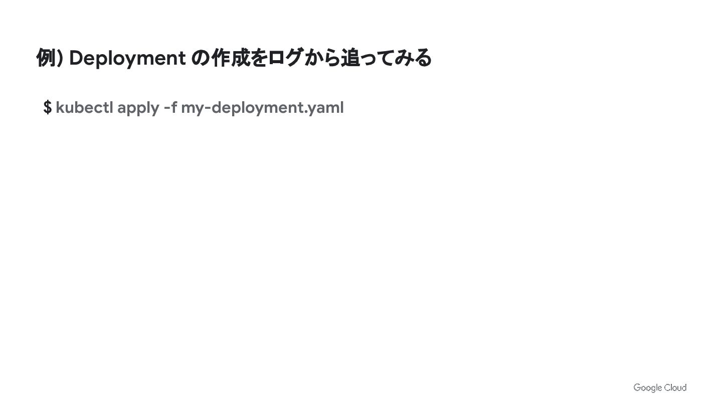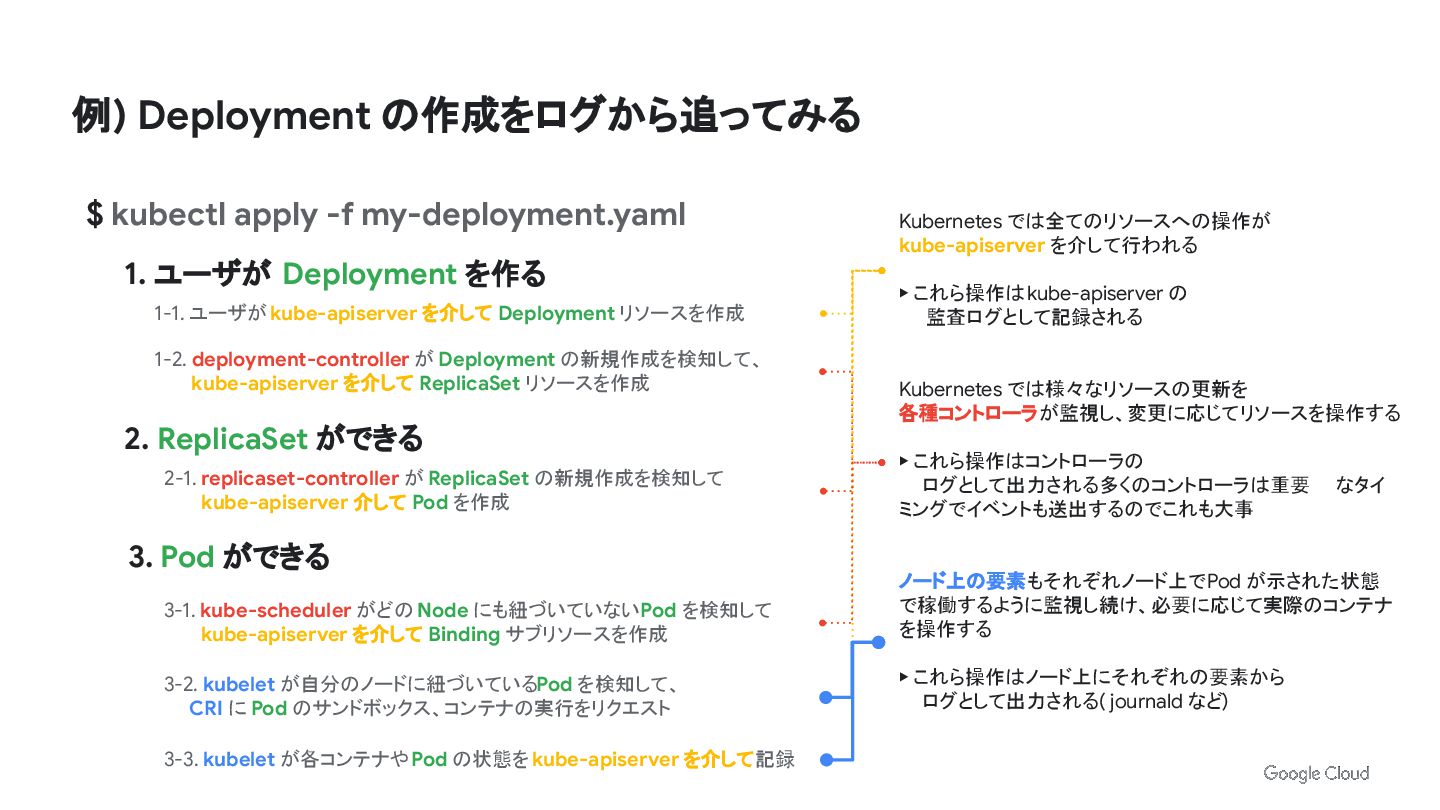 "auditID": "f3e16323-e9ae-48c5-bce6-b068bee3d368", "stage": "ResponseComplete", "requestURI": "/api/v1/namespaces/default/pods/oom-deployment-cb78d79f5-tvfvr/status", "verb": "patch", "user": { "username": "system:node:worker-node-1", "groups": [ "system:nodes", "system:authenticated" ] }, "sourceIPs": [ "10.146.0.8" ], "userAgent": "kubelet/v1.30.12 (linux/amd64) kubernetes/d5c6cb5", "objectRef": { "resource": "pods", "namespace": "default", "name": "oom-deployment-cb78d79f5-tvfvr", "apiGroup": "v1", "subresource": "status" }, "responseStatus": { "metadata": {}, "code": 200 }, "requestObject": { "metadata": { "uid": "f3e16323-e9ae-48c5-bce6-b068bee3d368" }, "status": { "containerStatuses": [ { "containerID": "containerd://19d6cc63e17e0da27677834b25a18d47b40e73f7c092ca6340884b0b8ae580be", "image": "docker.io/library/busybox:latest", "imageID": "docker.io/library/busybox@sha26:ab33eacc8251e3807b85bb6dba570e4698c3998eca6f0fc2cc…", "lastState": { "terminated": { "containerID": "containerd://19d6cc63e17e0da27677834b25a18d47b40e73f7c092ca6340884b0b8ae580be", "exitCode": 137, "finishedAt": "2025-09-03T12:55:30Z", "reason": "OOMKilled", "startedAt": "2025-09-03T12:55:30Z" } }, "name": "oom-container", "ready": false, "restartCount": 7, "started": false, "state": { "waiting": { "message": "back-off 5m0s restarting failed container=oom-container pod=oom-deployment-cb78d79…", "reason": "CrashLoopBackOff" } } } ] } }, "requestReceivedTimestamp": "2025-09-03T12:55:44.819014Z", "stageTimestamp": "2025-09-03T12:55:44.912345Z", "annotations": { "authorization.k8s.io/decision": "allow", "authorization.k8s.io/reason": "" } } いつ: • .requestReceivedTimestamp 誰が: • .user / .userAgent / .sourceIPs どのリソースを : • .objectRef どのような変更をして : • .verb / .requestObject * どうだったのか : • .responseStatus / .responseObject * * これらが記録されるかどうかは監査ログポリシー次第 ( GKE / GDC では Cloud Logging 上の他のログに合うように、 若干ログの構造が異なるが同じ情報が含まれている ) OSS のクラスタで Pod の OOM 時に kubelet が Pod のステータスをパッチする時のもの 過去の監査ログに リクエスト や レスポンス がある ということは、そのタイミングでそのリソースに対して kubectl describeしたらどうなるかおおよそ復元できる