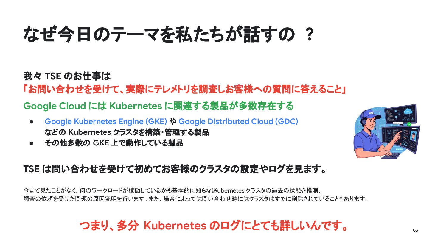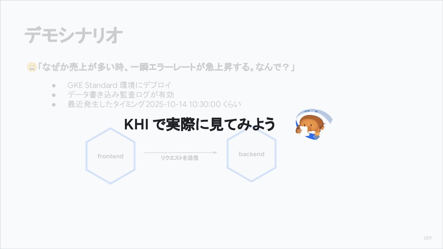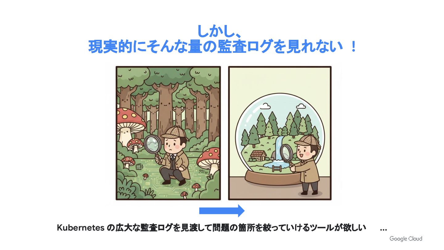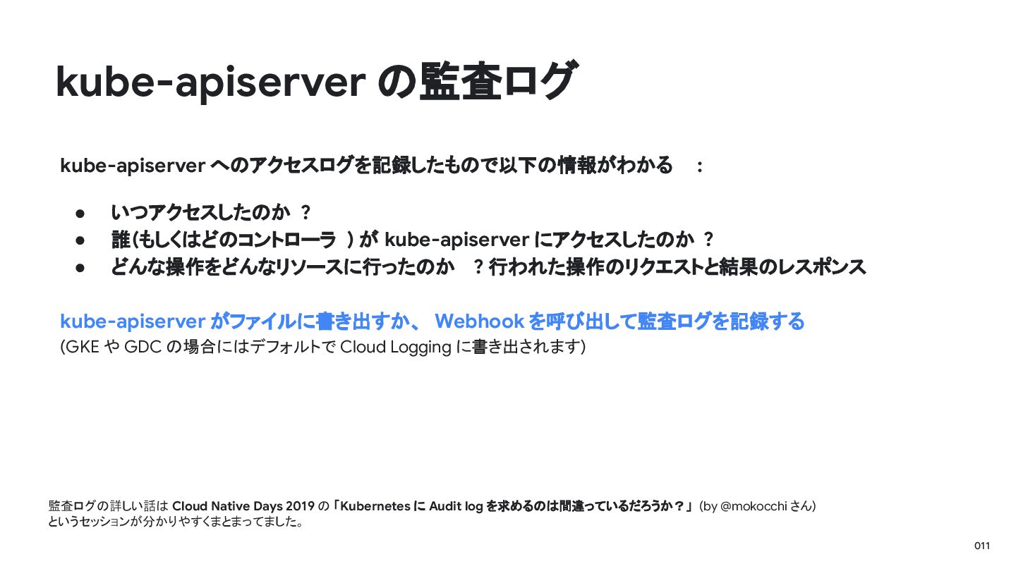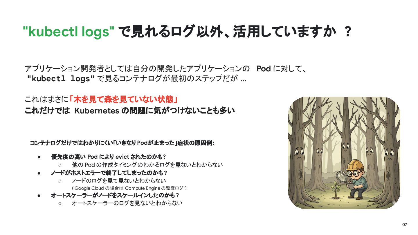 "auditID": "f3e16323-e9ae-48c5-bce6-b068bee3d368", "stage": "ResponseComplete", "requestURI": "/api/v1/namespaces/default/pods/oom-deployment-cb78d79f5-tvfvr/status", "verb": "patch", "user": { "username": "system:node:worker-node-1", "groups": [ "system:nodes", "system:authenticated" ] }, "sourceIPs": [ "10.146.0.8" ], "userAgent": "kubelet/v1.30.12 (linux/amd64) kubernetes/d5c6cb5", "objectRef": { "resource": "pods", "namespace": "default", "name": "oom-deployment-cb78d79f5-tvfvr", "apiGroup": "v1", "subresource": "status" }, "responseStatus": { "metadata": {}, "code": 200 }, "requestObject": { "metadata": { "uid": "f3e16323-e9ae-48c5-bce6-b068bee3d368" }, "status": { "containerStatuses": [ { "containerID": "containerd://19d6cc63e17e0da27677834b25a18d47b40e73f7c092ca6340884b0b8ae580be", "image": "docker.io/library/busybox:latest", "imageID": "docker.io/library/busybox@sha26:ab33eacc8251e3807b85bb6dba570e4698c3998eca6f0fc2cc…", "lastState": { "terminated": { "containerID": "containerd://19d6cc63e17e0da27677834b25a18d47b40e73f7c092ca6340884b0b8ae580be", "exitCode": 137, "finishedAt": "2025-09-03T12:55:30Z", "reason": "OOMKilled", "startedAt": "2025-09-03T12:55:30Z" } }, "name": "oom-container", "ready": false, "restartCount": 7, "started": false, "state": { "waiting": { "message": "back-off 5m0s restarting failed container=oom-container pod=oom-deployment-cb78d79…", "reason": "CrashLoopBackOff" } } } ] } }, "requestReceivedTimestamp": "2025-09-03T12:55:44.819014Z", "stageTimestamp": "2025-09-03T12:55:44.912345Z", "annotations": { "authorization.k8s.io/decision": "allow", "authorization.k8s.io/reason": "" } } いつ: • .requestReceivedTimestamp 誰が: • .user / .userAgent / .sourceIPs どのリソースを : • .objectRef どのような変更をして : • .verb / .requestObject * どうだったのか : • .responseStatus / .responseObject * * これらが記録されるかどうかは監査ログポリシー次第 ( GKE / GDC では Cloud Logging 上の他のログに合うように、 若干ログの構造が異なるが同じ情報が含まれている ) OSS のクラスタで Pod の OOM 時に kubelet が Pod のステータスをパッチする時のもの 過去の監査ログに リクエスト や レスポンス がある ということは、そのタイミングでそのリソースに対して kubectl describeしたらどうなるかおおよそ復元できる