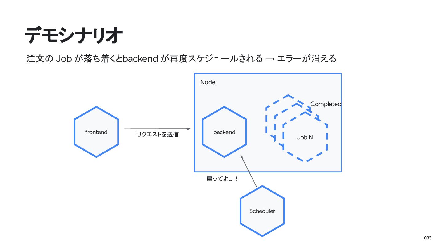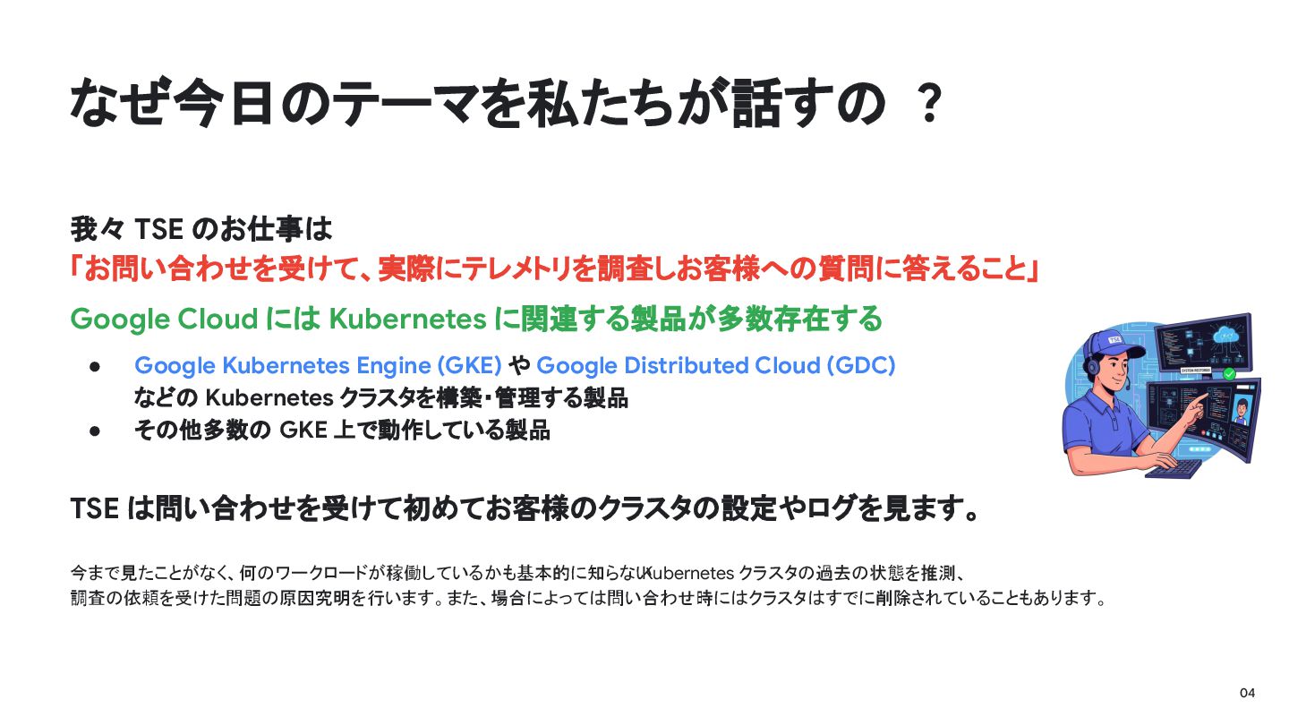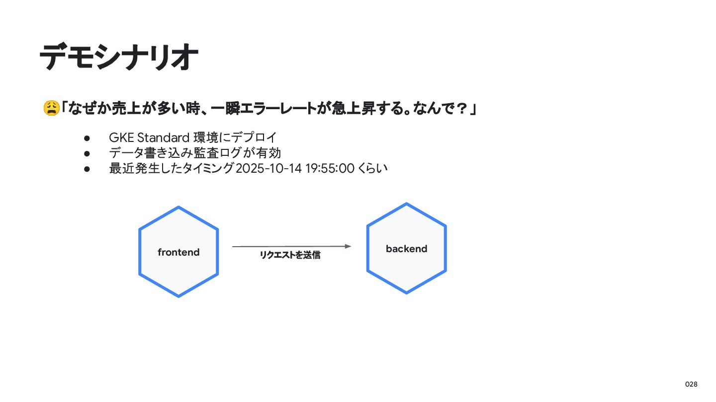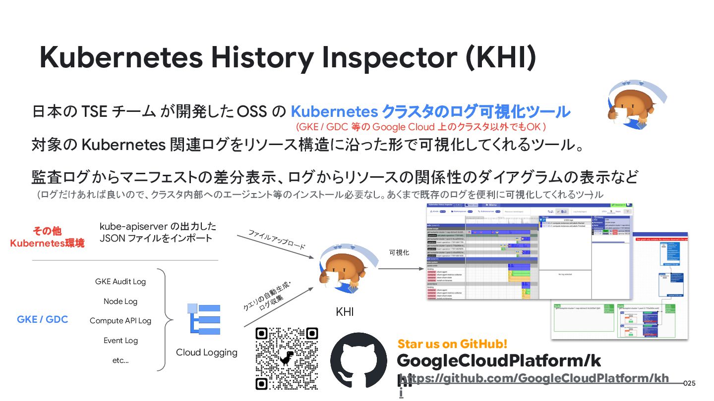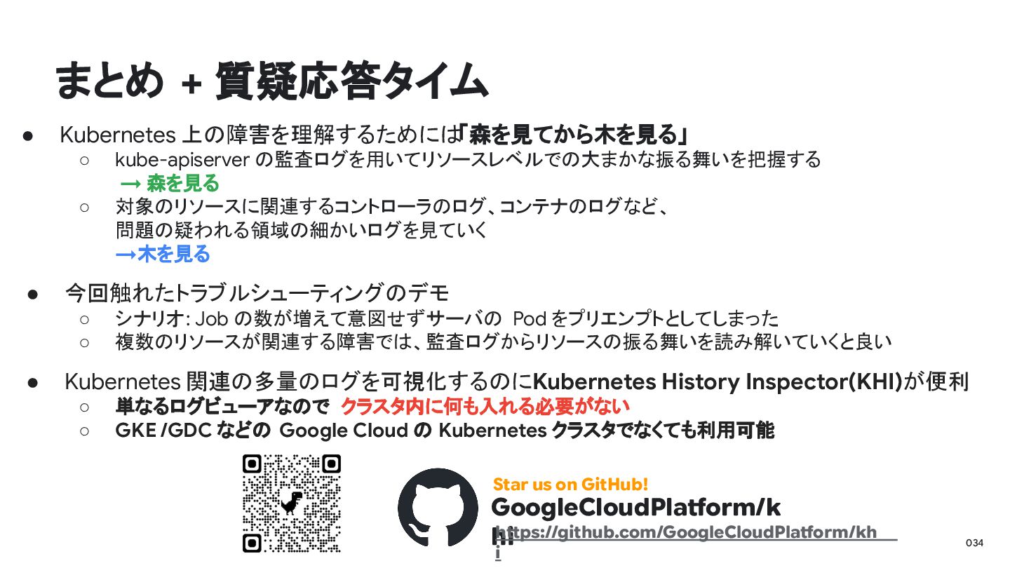 "auditID": "f3e16323-e9ae-48c5-bce6-b068bee3d368", "stage": "ResponseComplete", "requestURI": "/api/v1/namespaces/default/pods/oom-deployment-cb78d79f5-tvfvr/status", "verb": "patch", "user": { "username": "system:node:worker-node-1", "groups": [ "system:nodes", "system:authenticated" ] }, "sourceIPs": [ "10.146.0.8" ], "userAgent": "kubelet/v1.30.12 (linux/amd64) kubernetes/d5c6cb5", "objectRef": { "resource": "pods", "namespace": "default", "name": "oom-deployment-cb78d79f5-tvfvr", "apiGroup": "v1", "subresource": "status" }, "responseStatus": { "metadata": {}, "code": 200 }, "requestObject": { "metadata": { "uid": "f3e16323-e9ae-48c5-bce6-b068bee3d368" }, "status": { "containerStatuses": [ { "containerID": "containerd://19d6cc63e17e0da27677834b25a18d47b40e73f7c092ca6340884b0b8ae580be", "image": "docker.io/library/busybox:latest", "imageID": "docker.io/library/busybox@sha26:ab33eacc8251e3807b85bb6dba570e4698c3998eca6f0fc2cc…", "lastState": { "terminated": { "containerID": "containerd://19d6cc63e17e0da27677834b25a18d47b40e73f7c092ca6340884b0b8ae580be", "exitCode": 137, "finishedAt": "2025-09-03T12:55:30Z", "reason": "OOMKilled", "startedAt": "2025-09-03T12:55:30Z" } }, "name": "oom-container", "ready": false, "restartCount": 7, "started": false, "state": { "waiting": { "message": "back-off 5m0s restarting failed container=oom-container pod=oom-deployment-cb78d79…", "reason": "CrashLoopBackOff" } } } ] } }, "requestReceivedTimestamp": "2025-09-03T12:55:44.819014Z", "stageTimestamp": "2025-09-03T12:55:44.912345Z", "annotations": { "authorization.k8s.io/decision": "allow", "authorization.k8s.io/reason": "" } } いつ: • .requestReceivedTimestamp 誰が: • .user / .userAgent / .sourceIPs どのリソースを : • .objectRef どのような変更をして : • .verb / .requestObject * どうだったのか : • .responseStatus / .responseObject * * これらが記録されるかどうかは監査ログポリシー次第 ( GKE / GDC では Cloud Logging 上の他のログに合うように、 若干ログの構造が異なるが同じ情報が含まれている ) OSS のクラスタで Pod の OOM 時に kubelet が Pod のステータスをパッチする時のもの 過去の監査ログに リクエスト や レスポンス がある ということは、そのタイミングでそのリソースに対して kubectl describeしたらどうなるかおおよそ復元できる