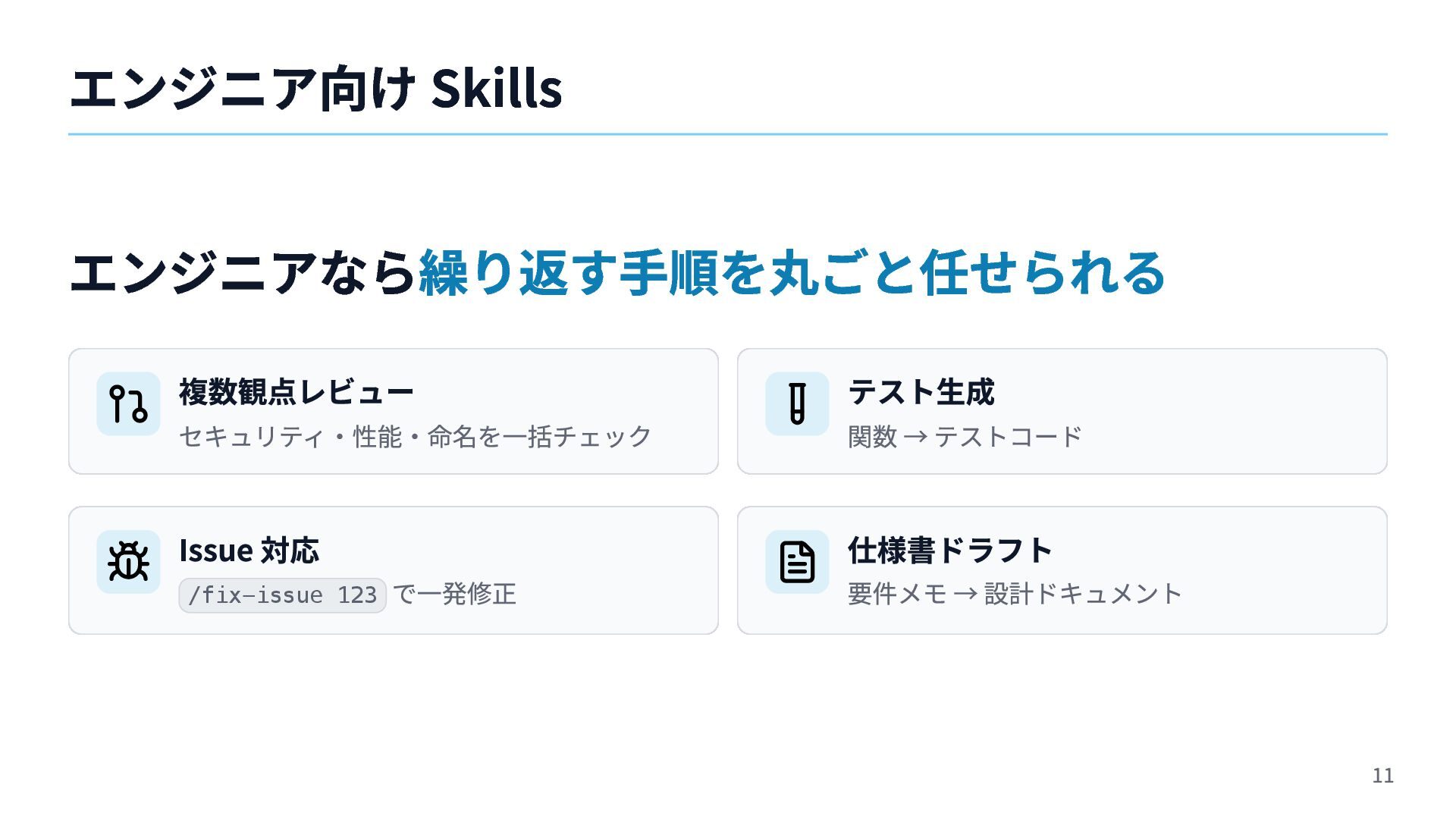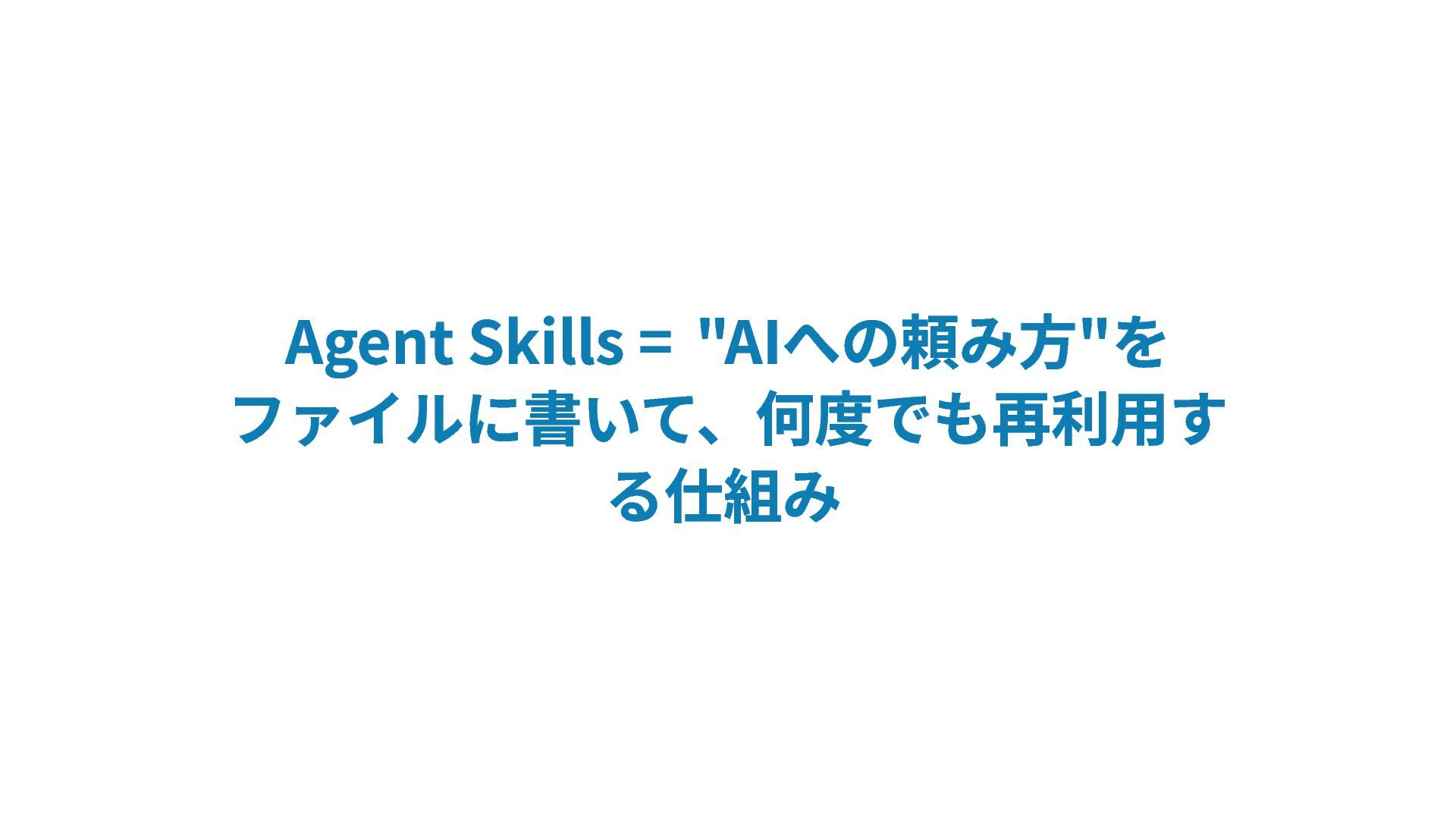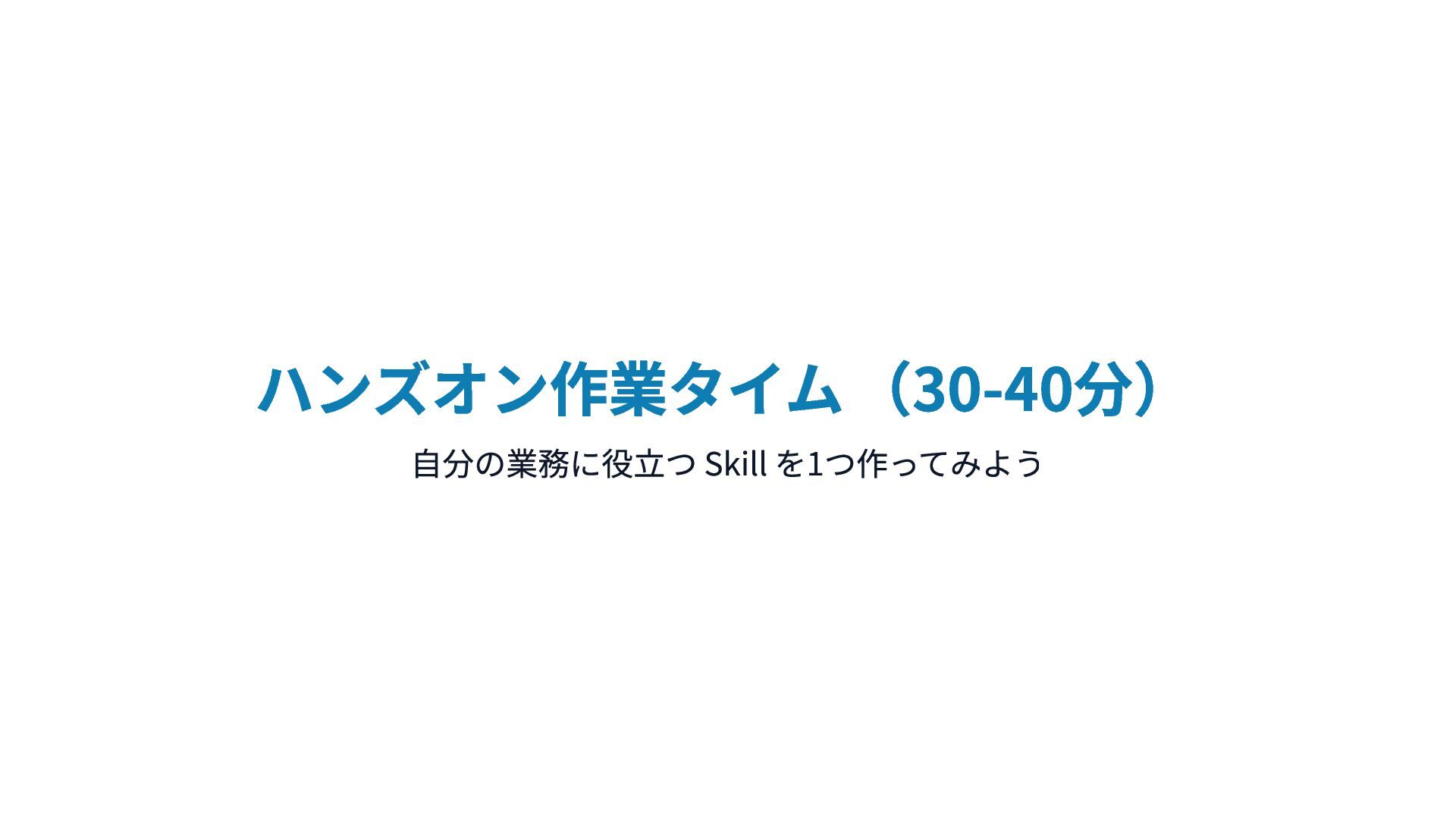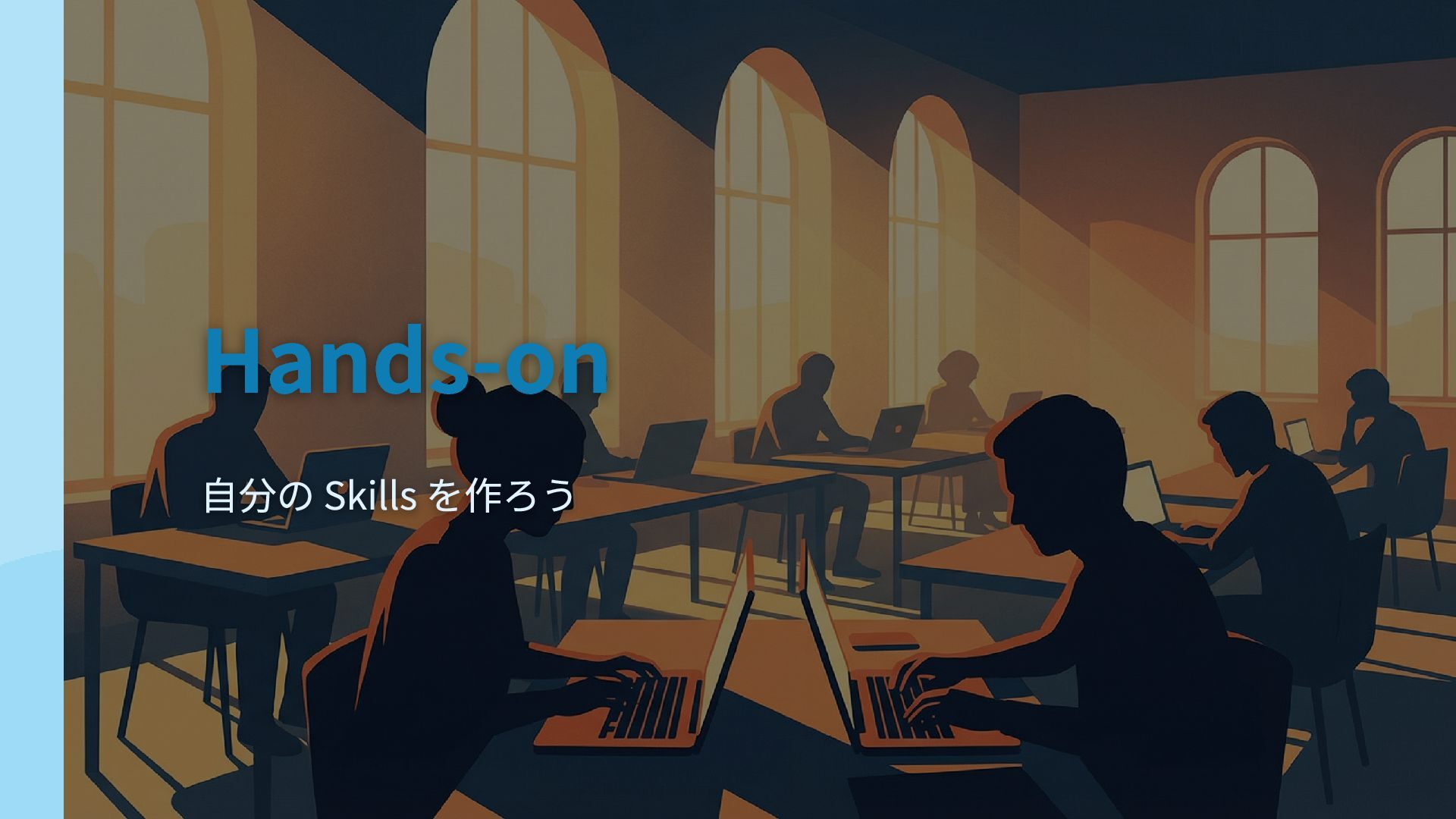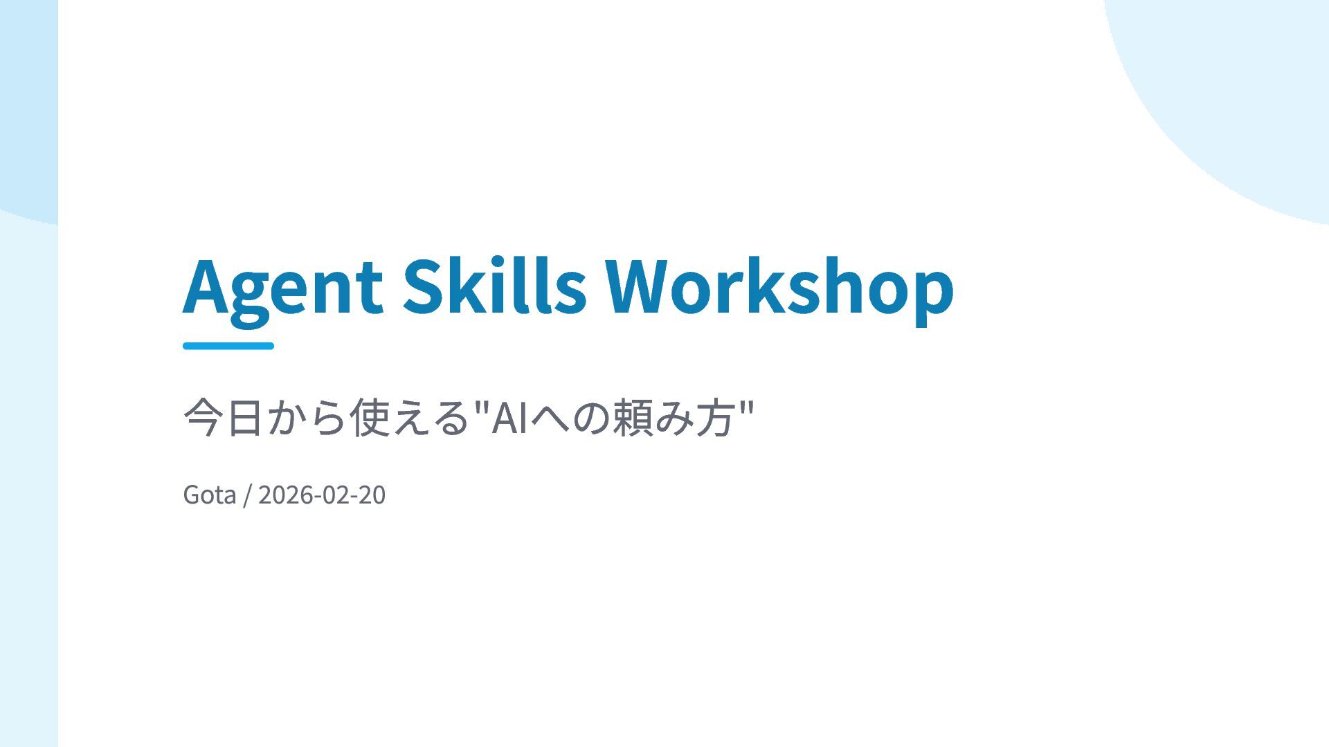 「Agent Skills」のワークショップ資料。なぜ毎回の指示出しでは限界があるのか、Skills で何ができるのか(議事録・コードレビュー・テスト生成など)、Skillsの仕組み、SkillsBench 研究に基づく効果的な書き方、セキュリティ上の注意点まで、入門から発展的な内容まで一通り網羅しています。後半は自分の Skill を手で書いて動かすハンズオン構成。Skillsの社内勉強会やオンボーディングの教材としてそのまま使えることを意図して作成し、実際に実施しました!