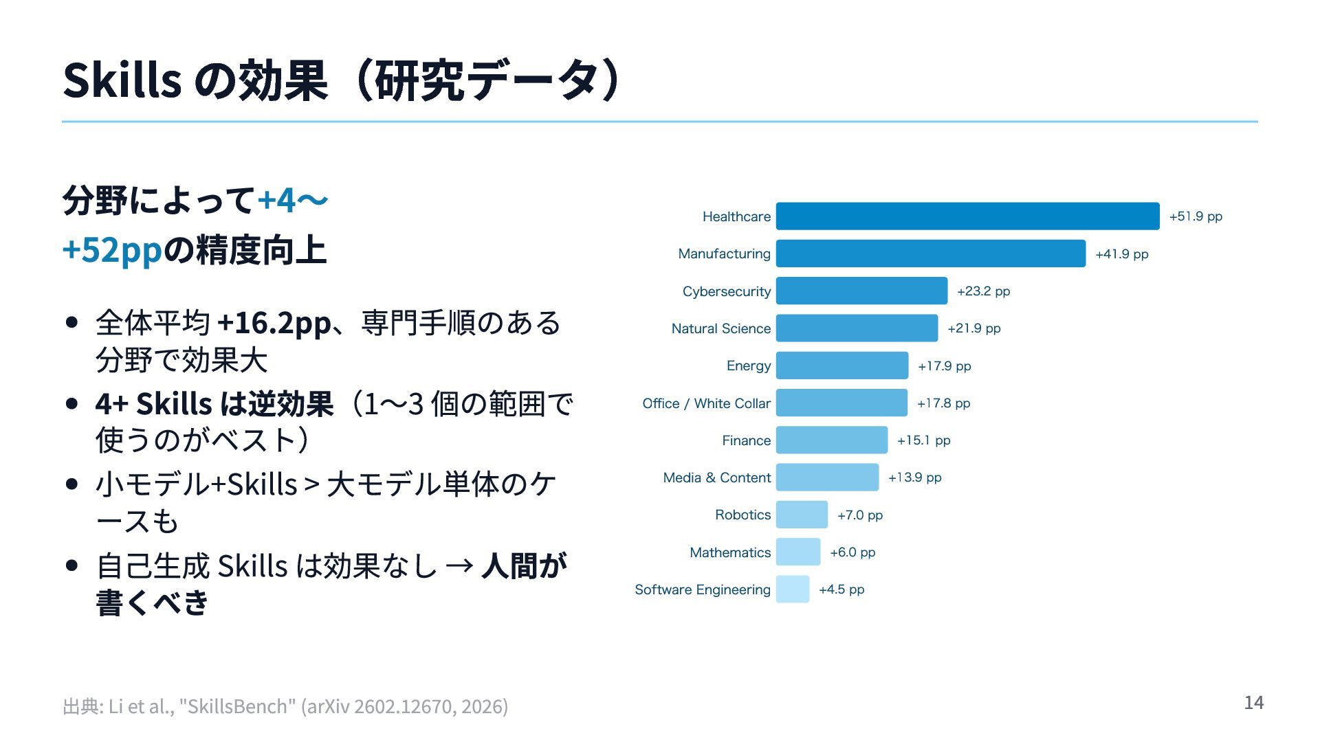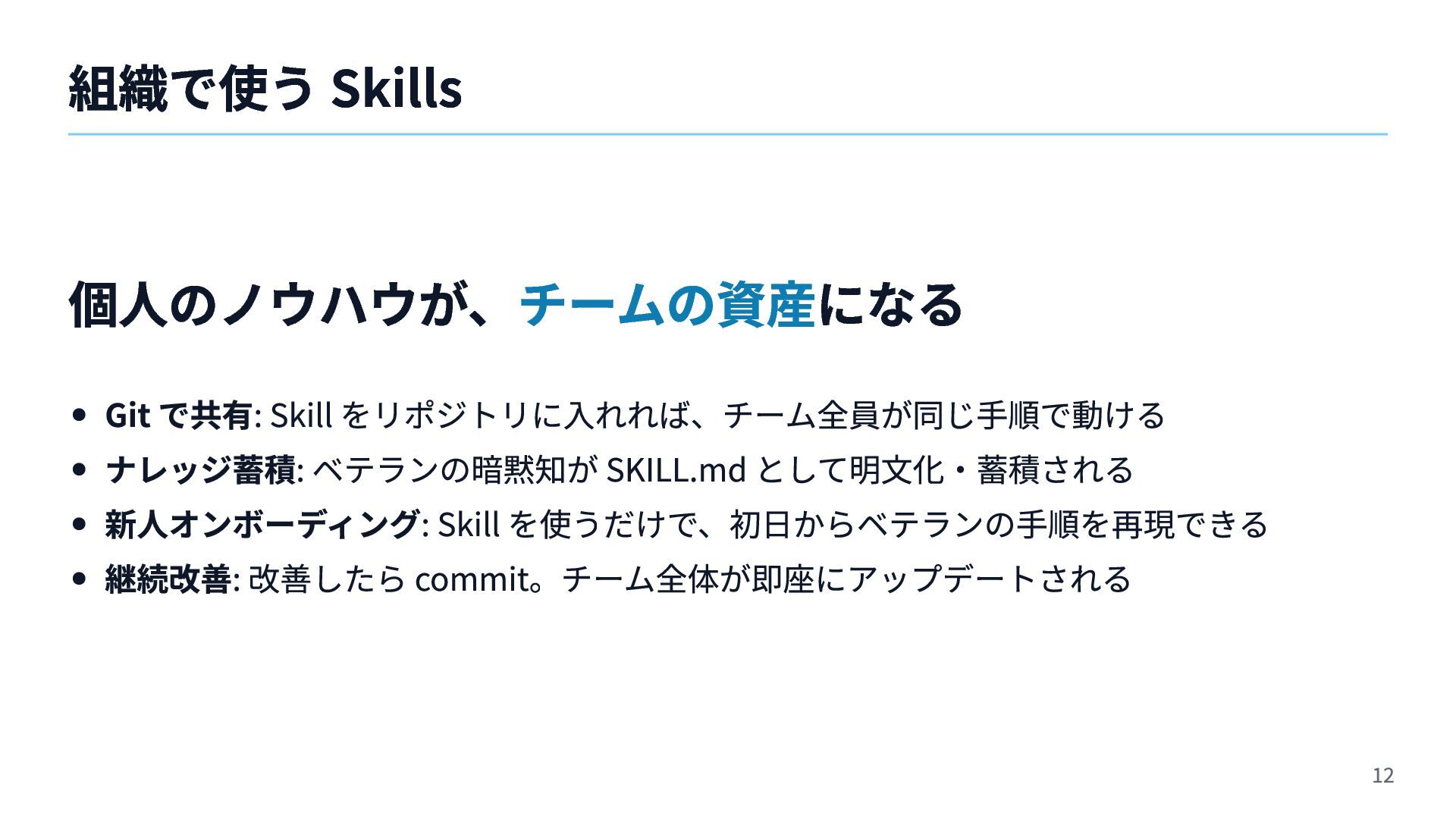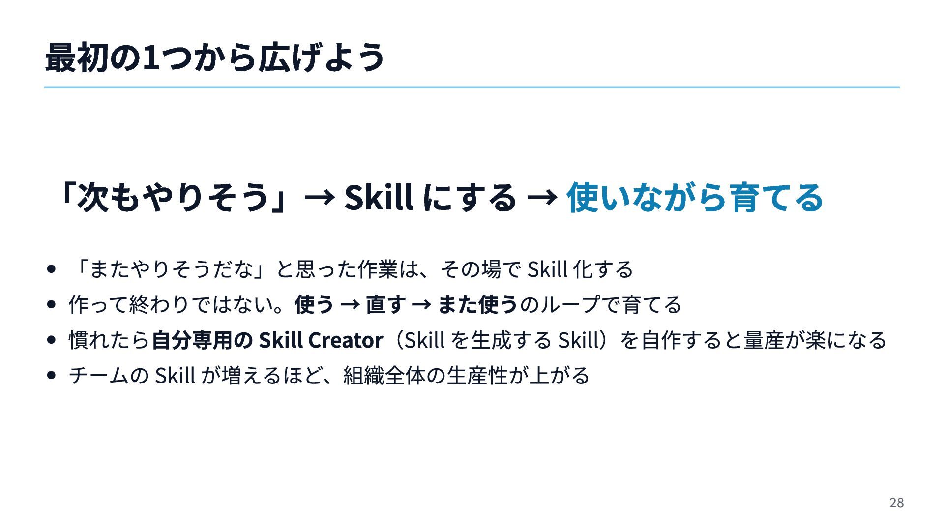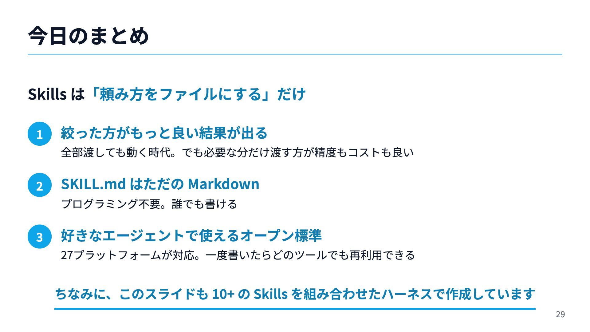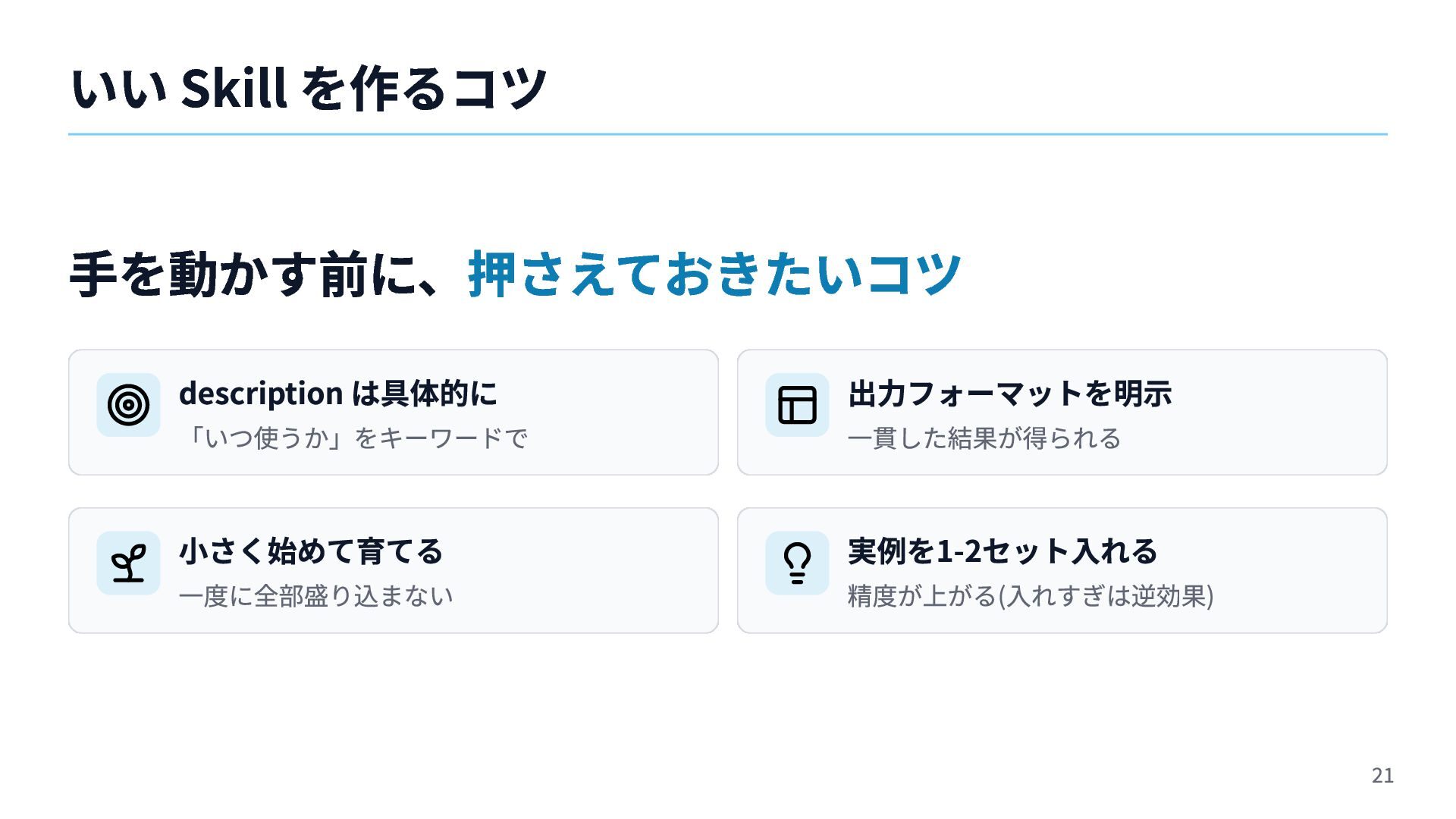 「Agent Skills」のワークショップ資料。なぜ毎回の指示出しでは限界があるのか、Skills で何ができるのか(議事録・コードレビュー・テスト生成など)、Skillsの仕組み、SkillsBench 研究に基づく効果的な書き方、セキュリティ上の注意点まで、入門から発展的な内容まで一通り網羅しています。後半は自分の Skill を手で書いて動かすハンズオン構成。Skillsの社内勉強会やオンボーディングの教材としてそのまま使えることを意図して作成し、実際に実施しました!