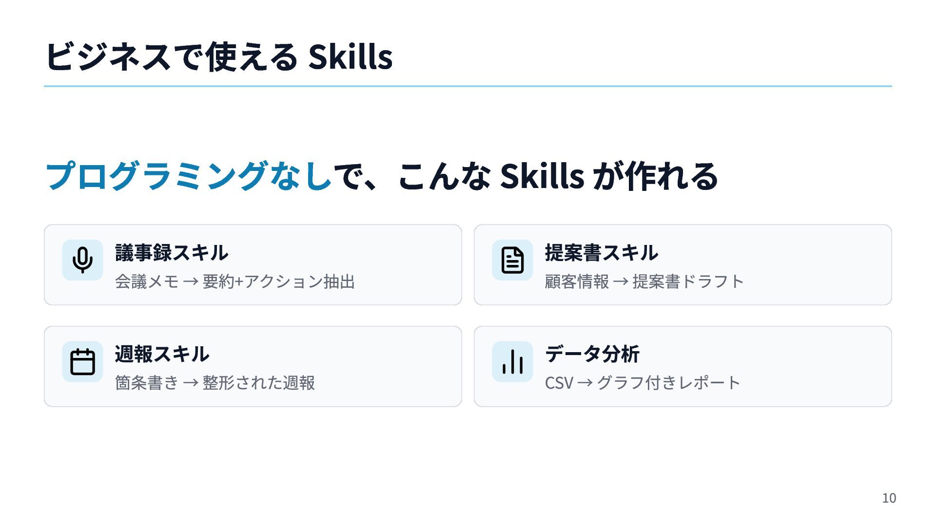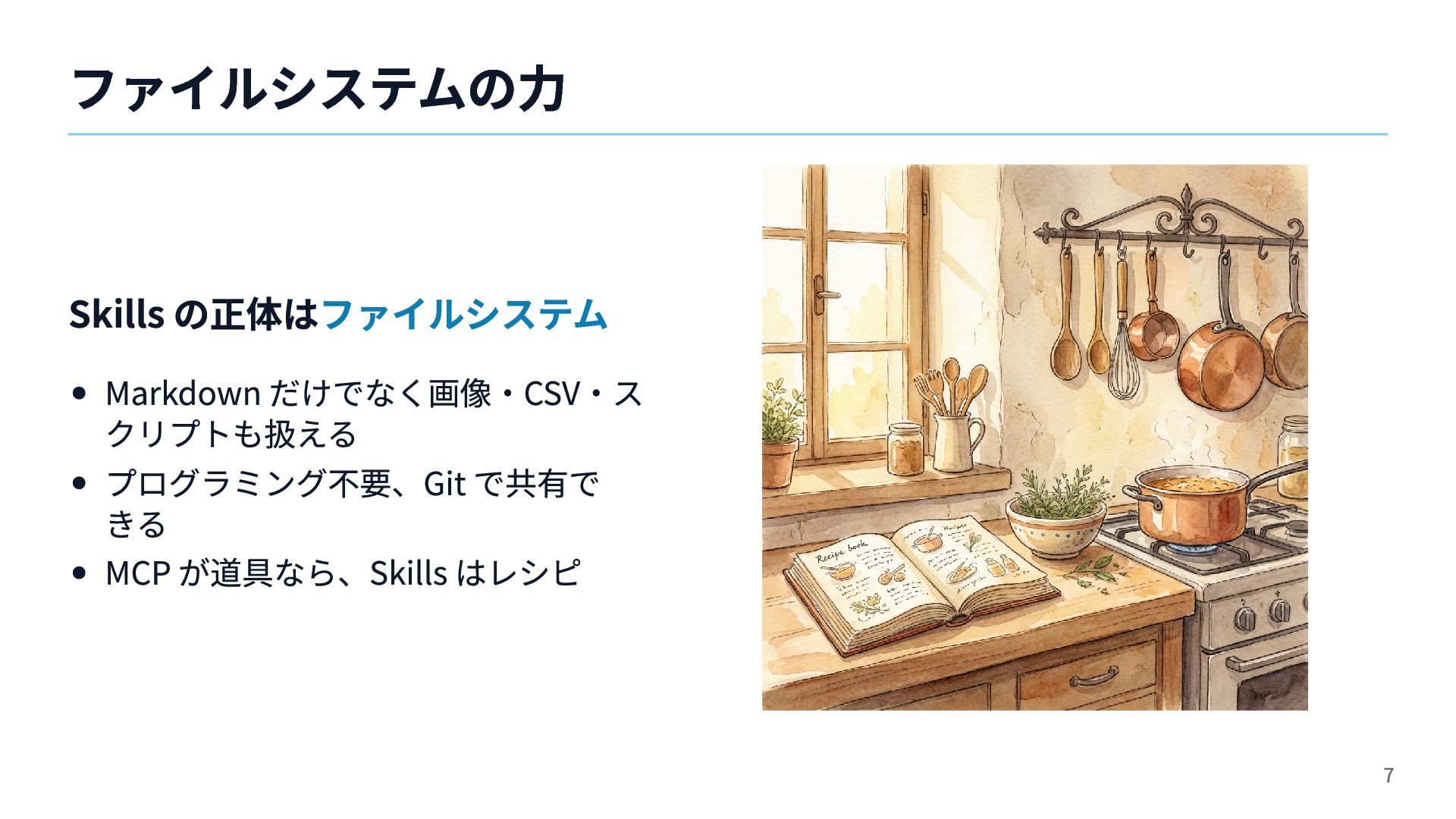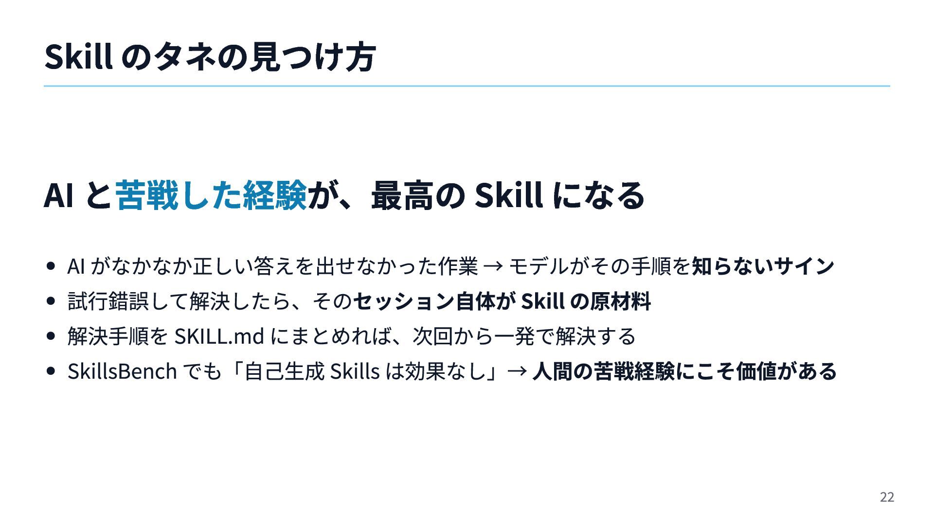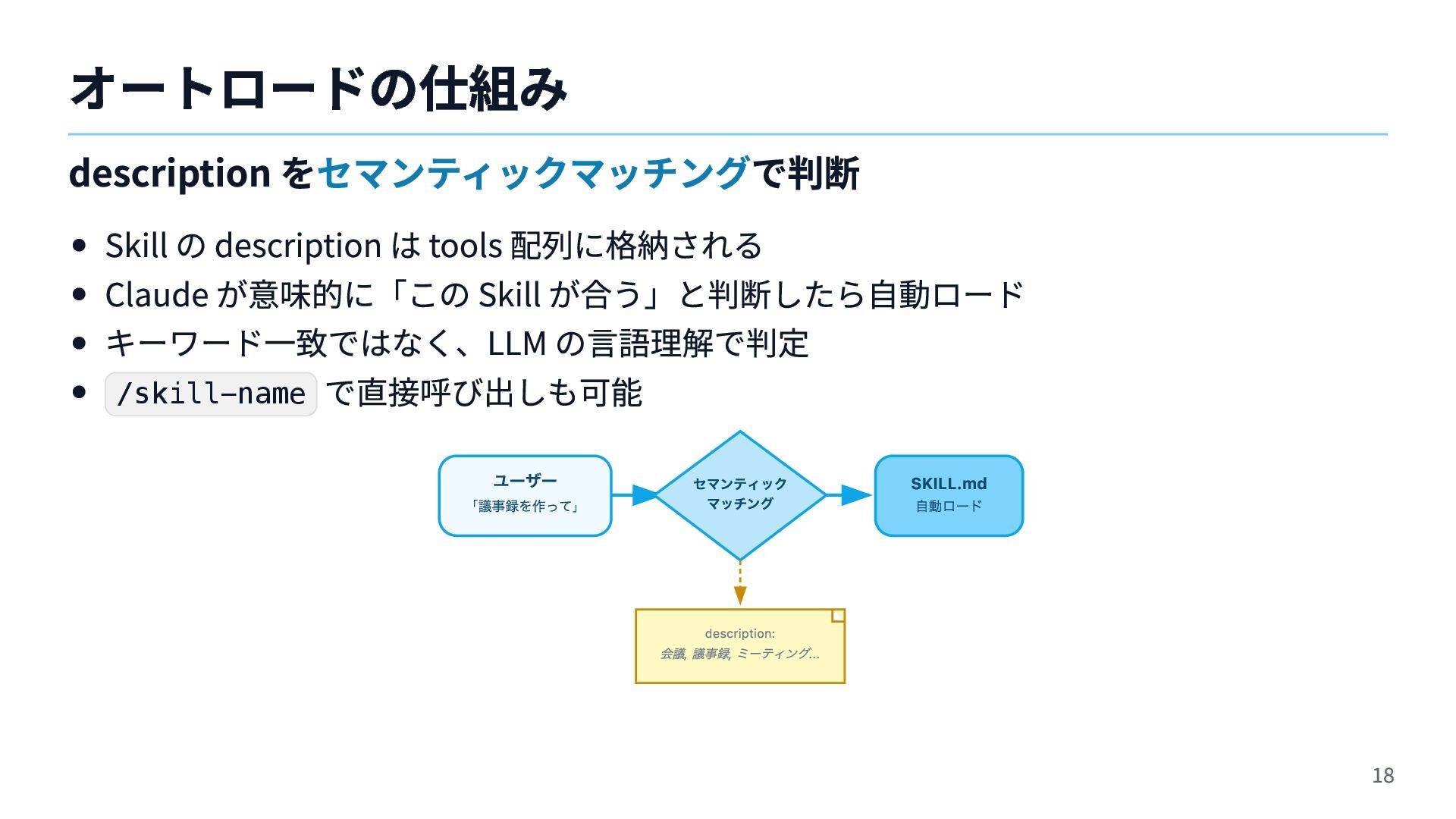 「Agent Skills」のワークショップ資料。なぜ毎回の指示出しでは限界があるのか、Skills で何ができるのか(議事録・コードレビュー・テスト生成など)、Skillsの仕組み、SkillsBench 研究に基づく効果的な書き方、セキュリティ上の注意点まで、入門から発展的な内容まで一通り網羅しています。後半は自分の Skill を手で書いて動かすハンズオン構成。Skillsの社内勉強会やオンボーディングの教材としてそのまま使えることを意図して作成し、実際に実施しました!