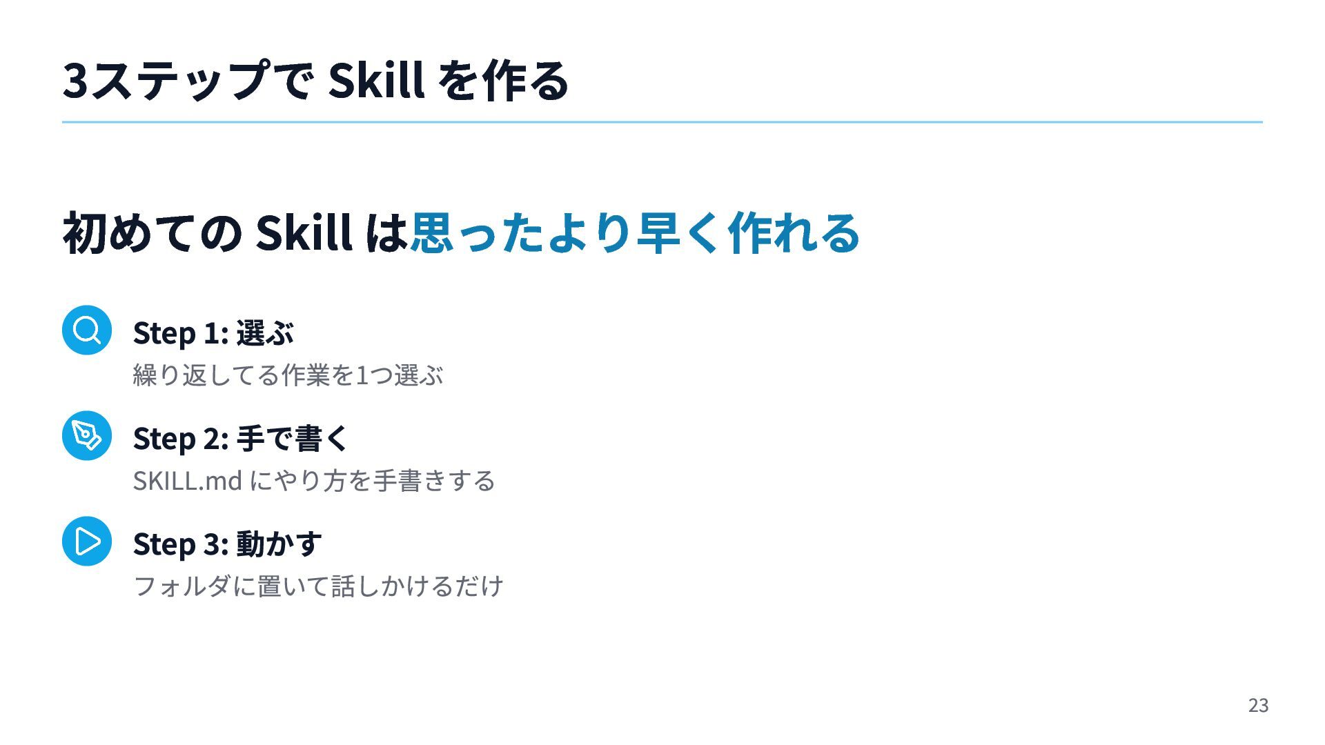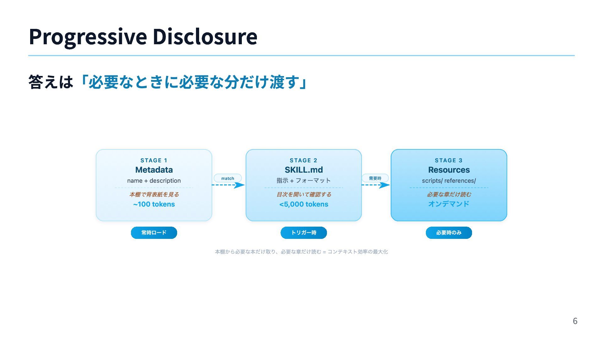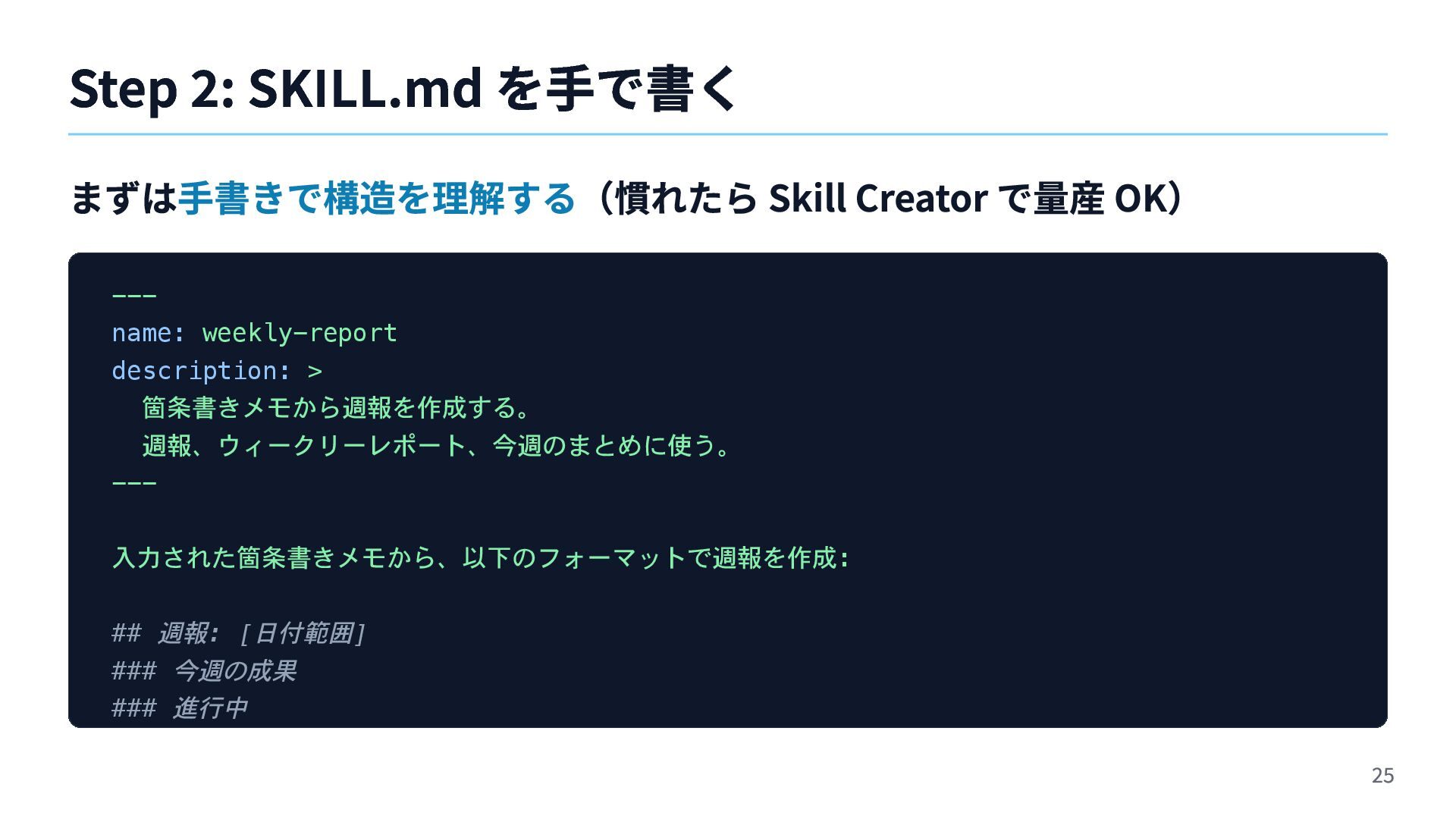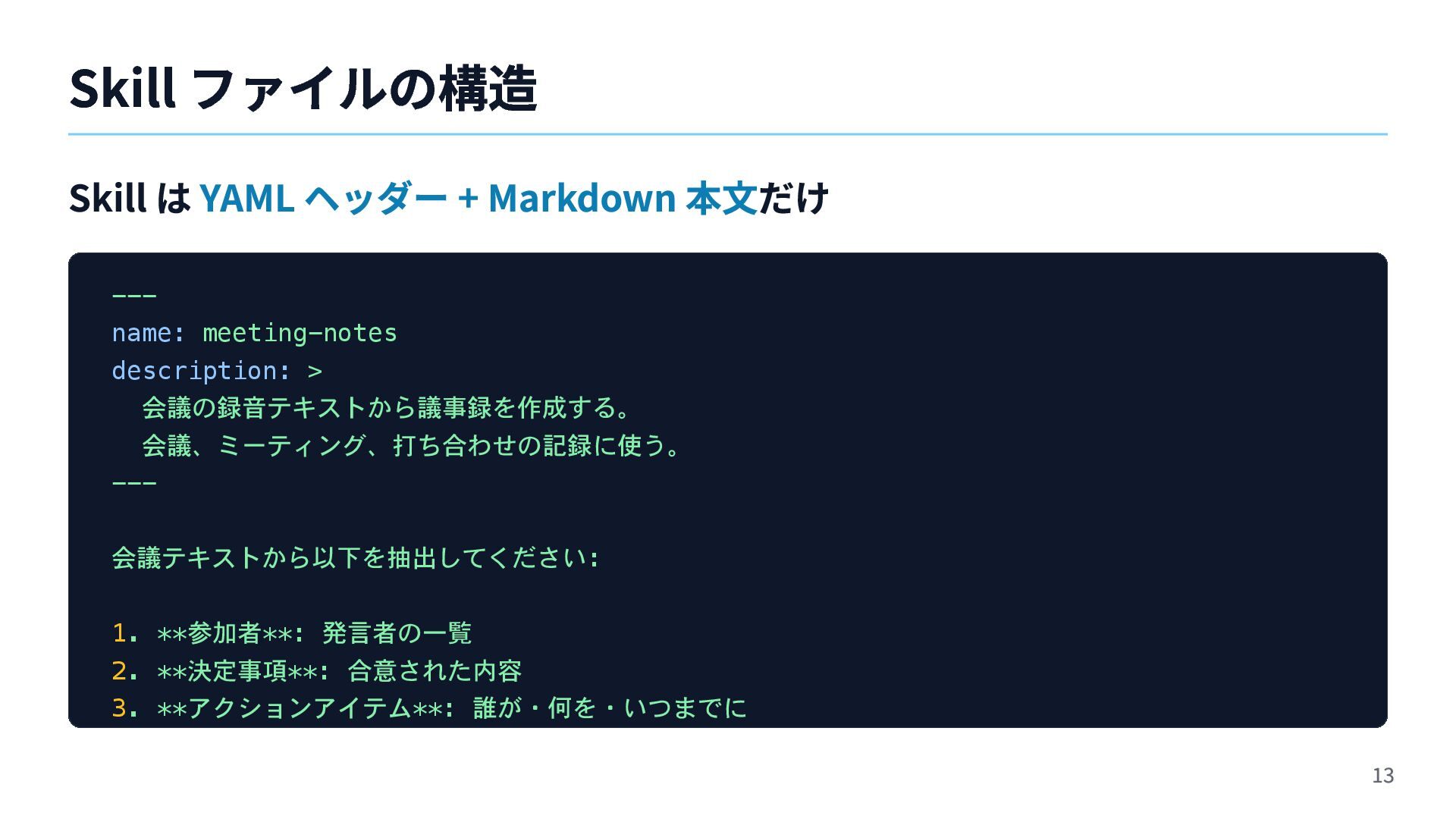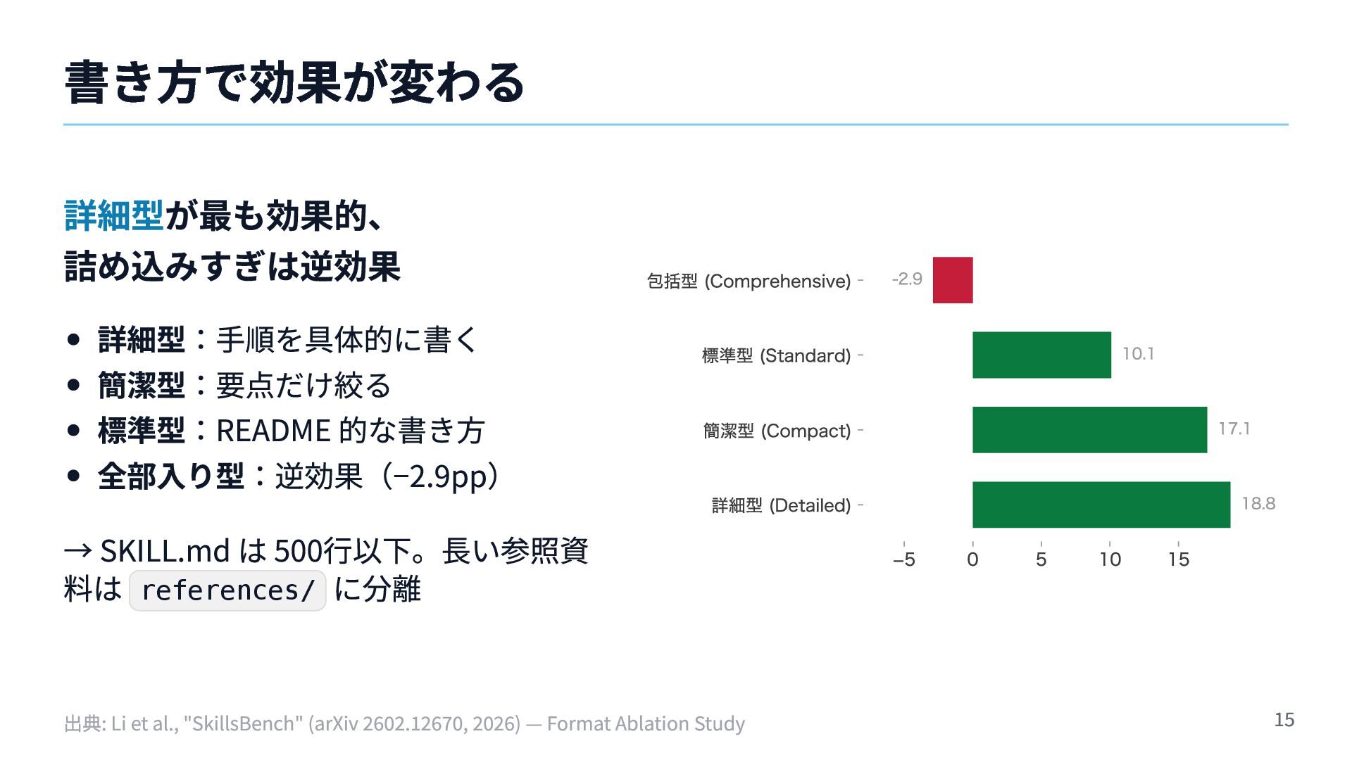 「Agent Skills」のワークショップ資料。なぜ毎回の指示出しでは限界があるのか、Skills で何ができるのか(議事録・コードレビュー・テスト生成など)、Skillsの仕組み、SkillsBench 研究に基づく効果的な書き方、セキュリティ上の注意点まで、入門から発展的な内容まで一通り網羅しています。後半は自分の Skill を手で書いて動かすハンズオン構成。Skillsの社内勉強会やオンボーディングの教材としてそのまま使えることを意図して作成し、実際に実施しました!