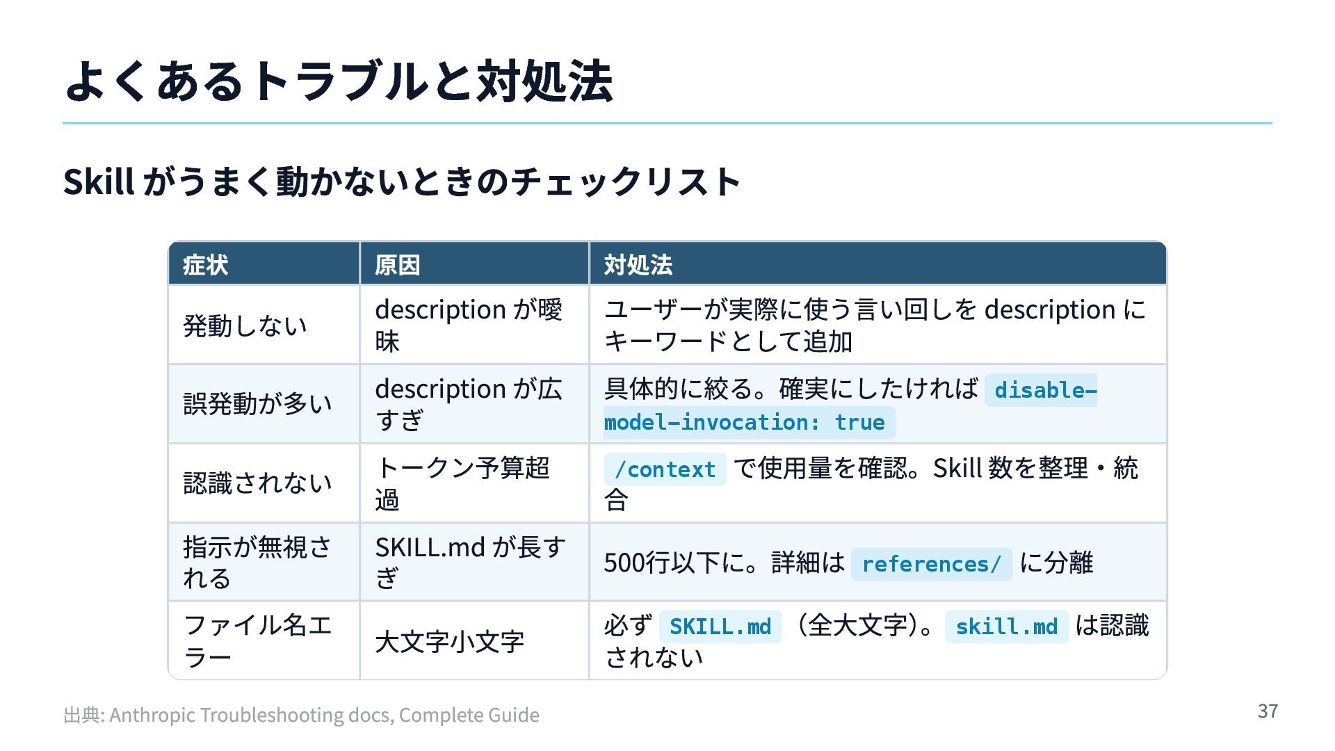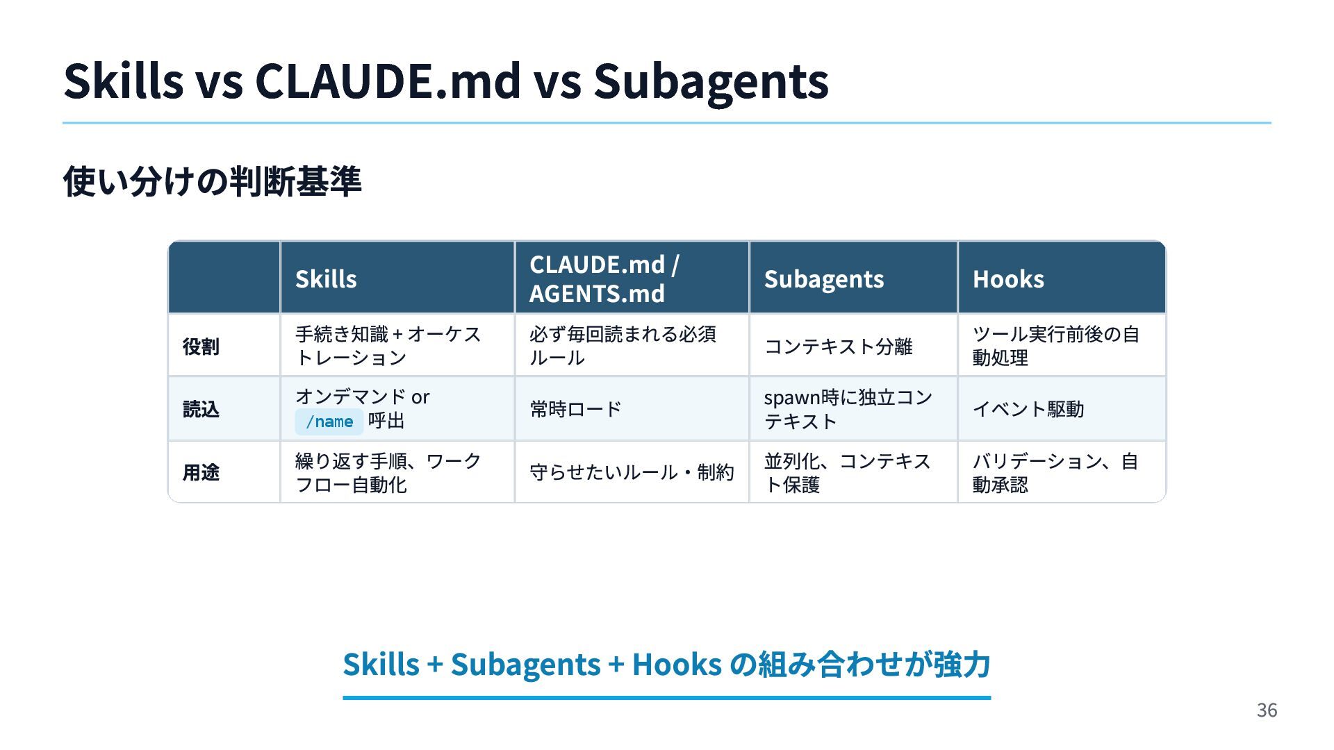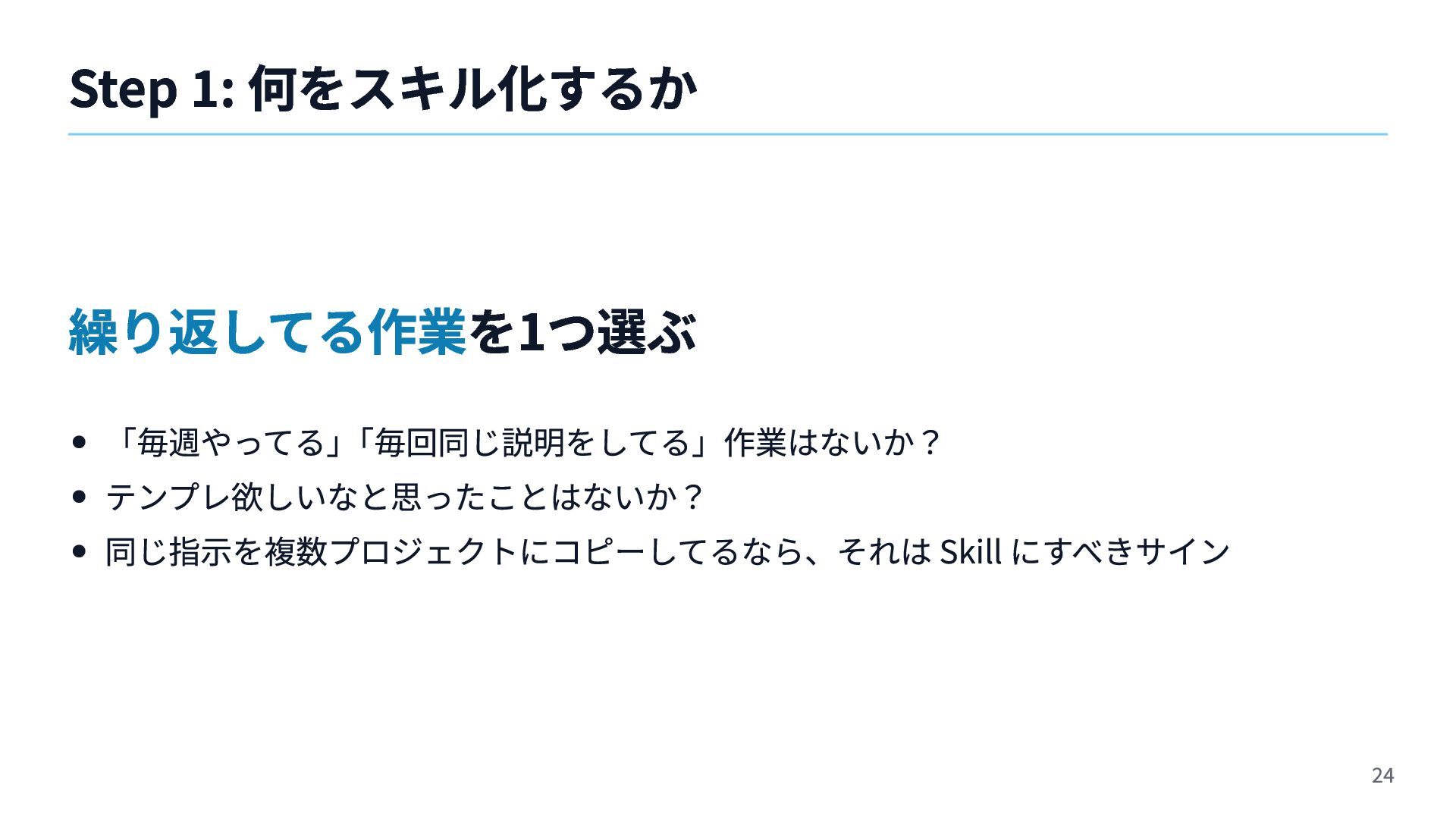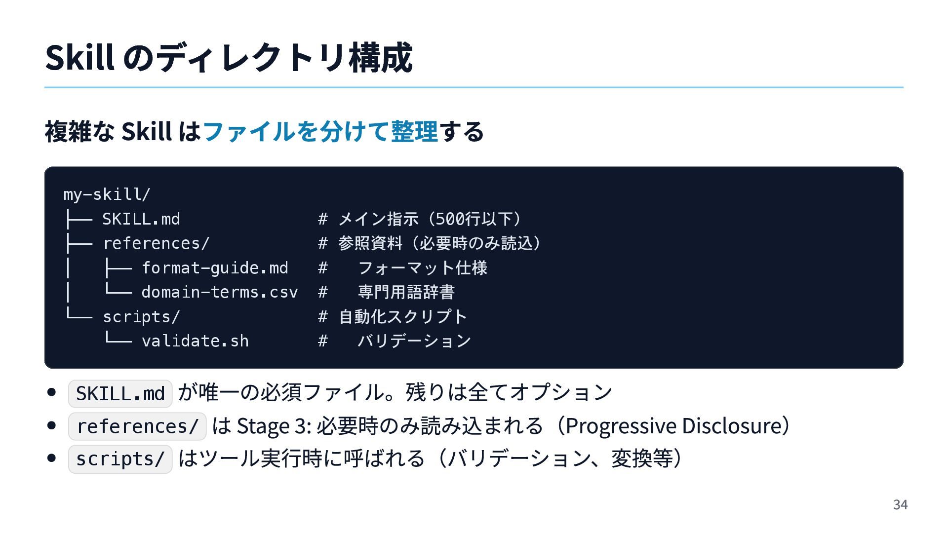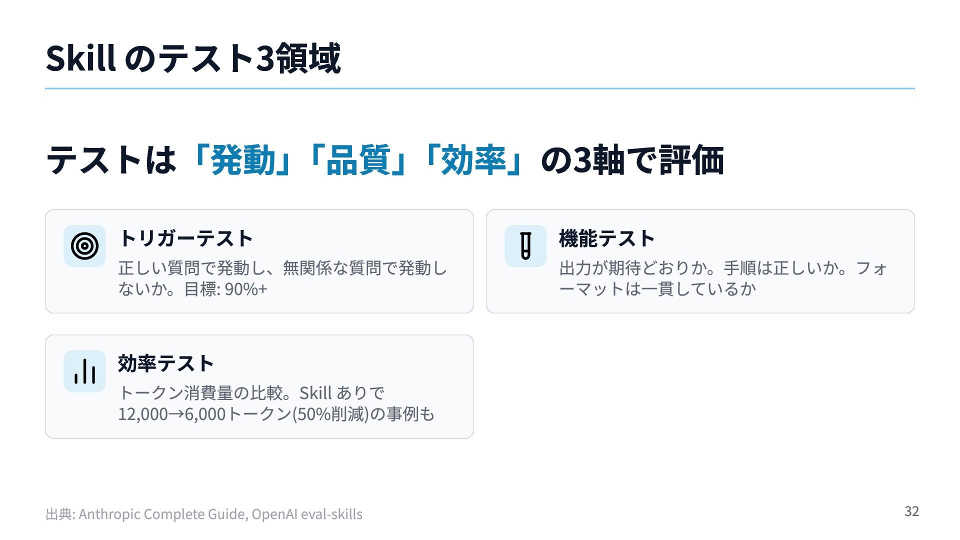 「Agent Skills」のワークショップ資料。なぜ毎回の指示出しでは限界があるのか、Skills で何ができるのか(議事録・コードレビュー・テスト生成など)、Skillsの仕組み、SkillsBench 研究に基づく効果的な書き方、セキュリティ上の注意点まで、入門から発展的な内容まで一通り網羅しています。後半は自分の Skill を手で書いて動かすハンズオン構成。Skillsの社内勉強会やオンボーディングの教材としてそのまま使えることを意図して作成し、実際に実施しました!