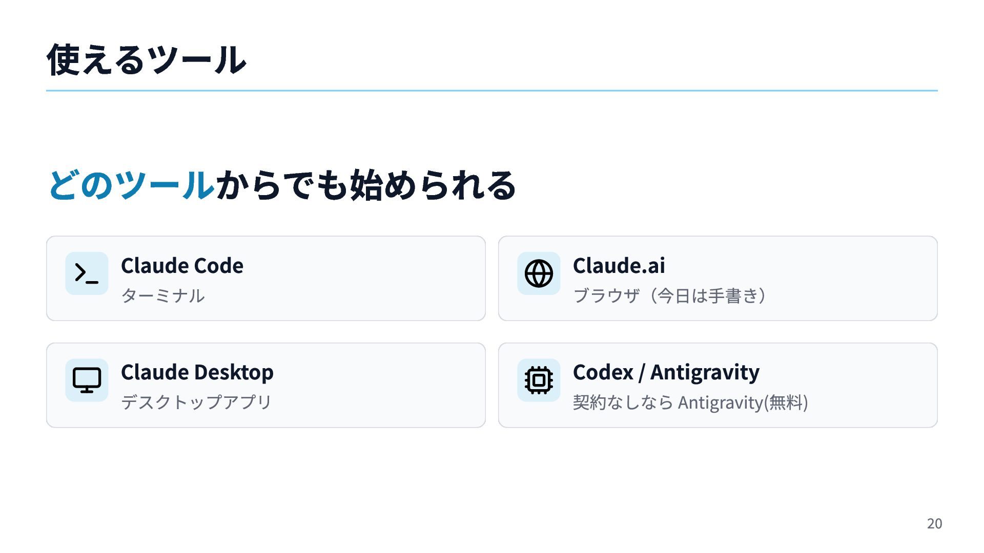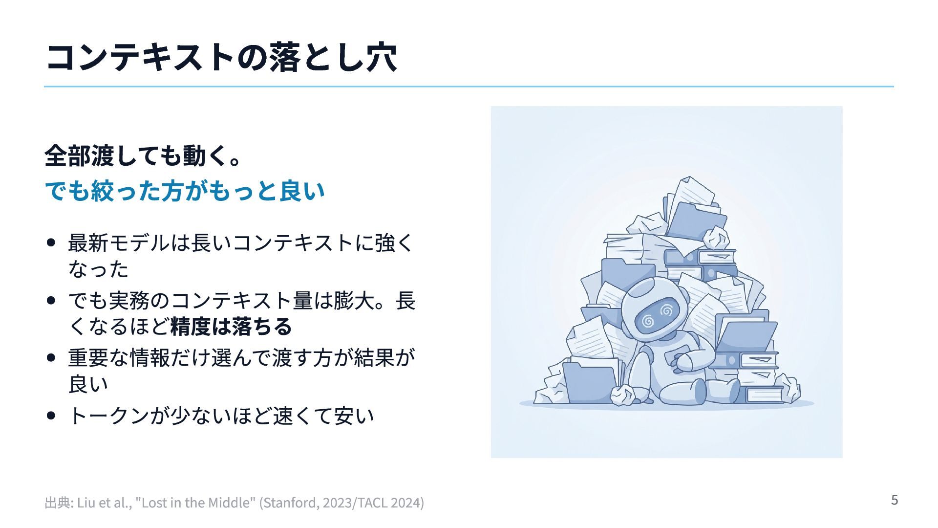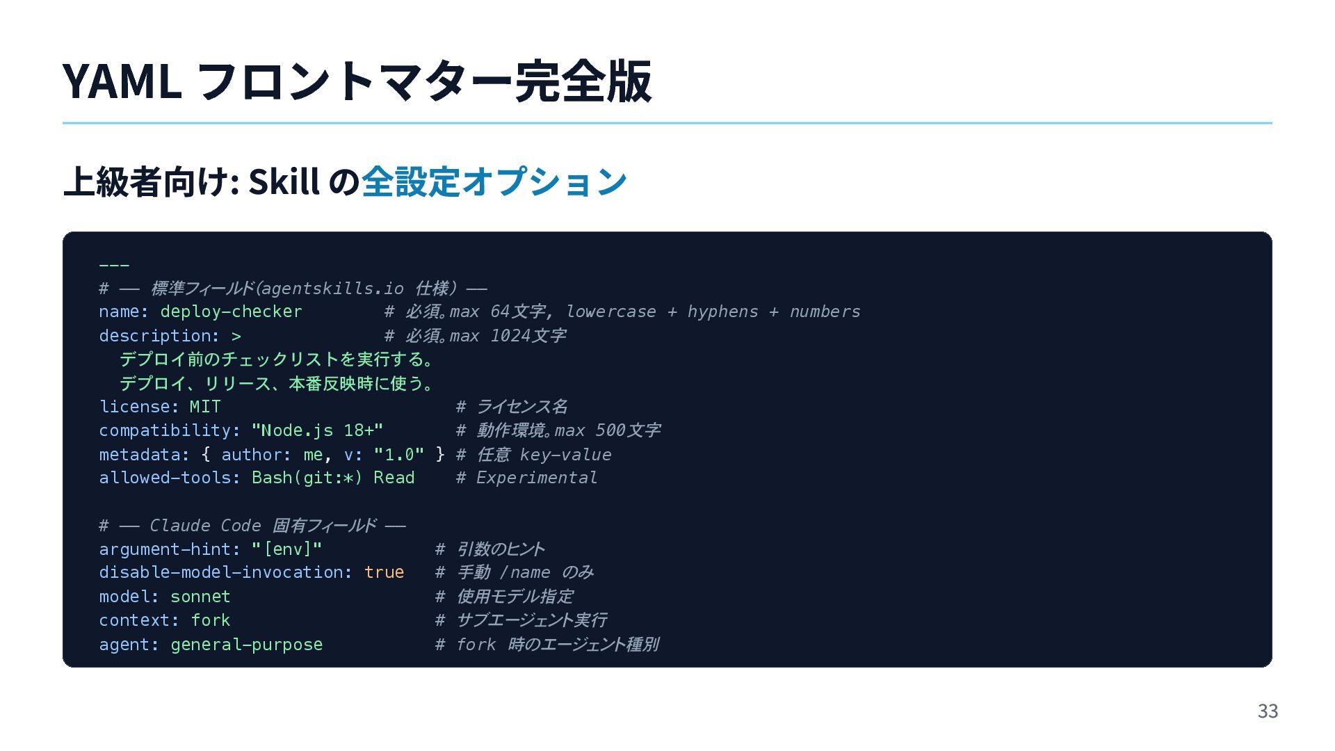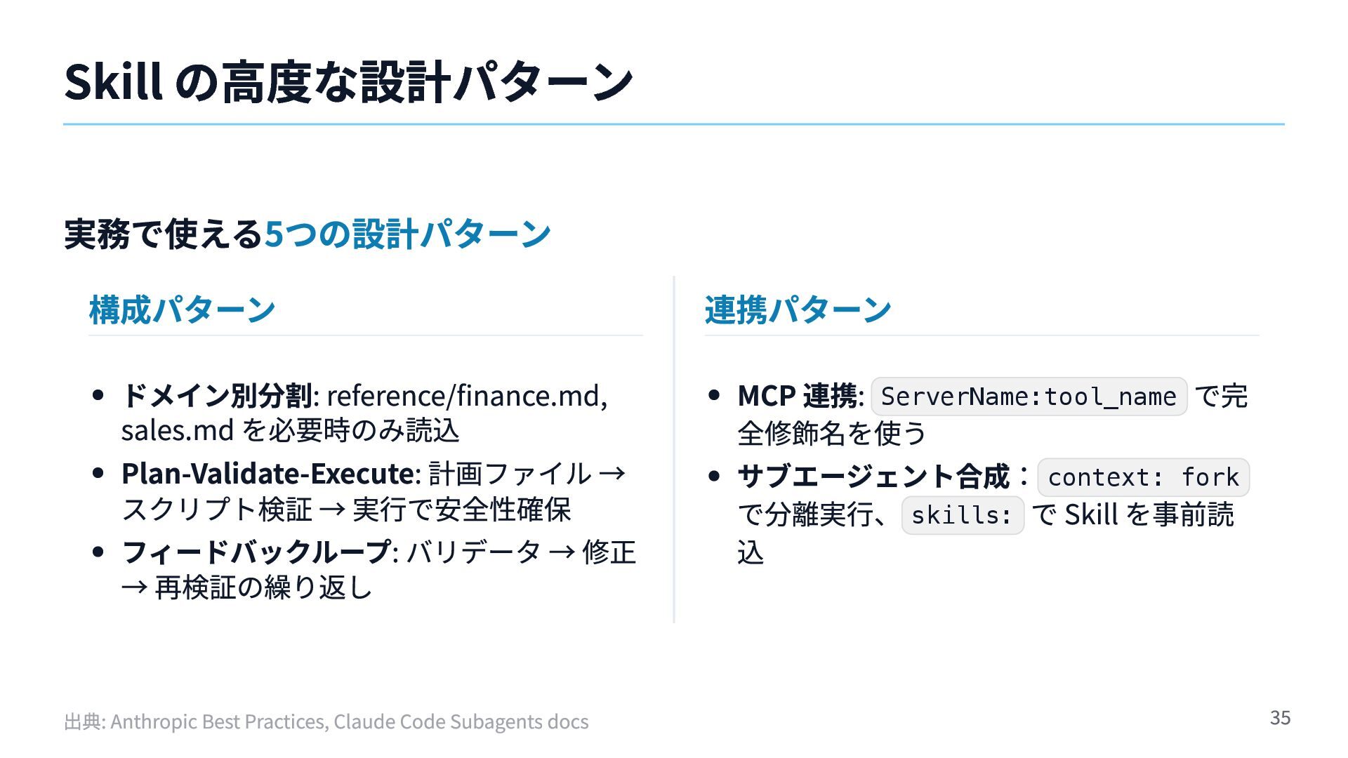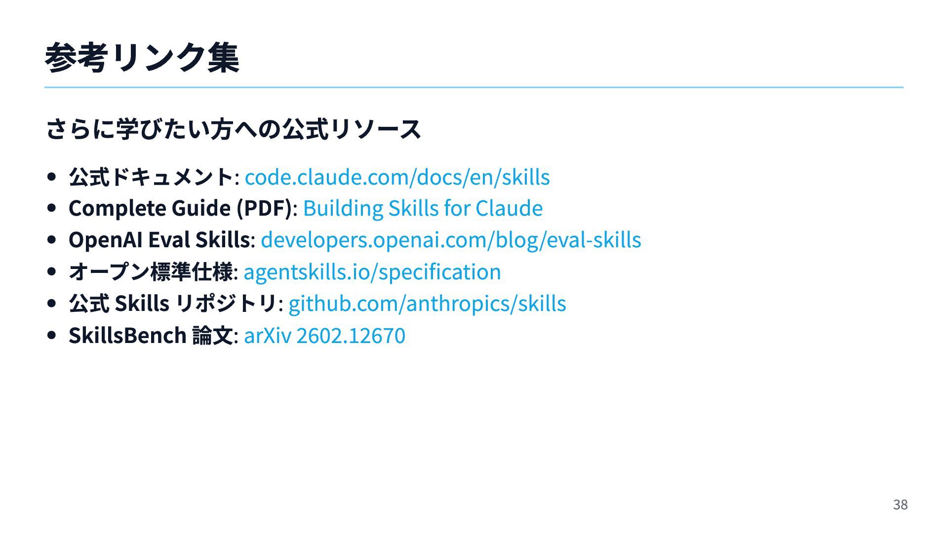 「Agent Skills」のワークショップ資料。なぜ毎回の指示出しでは限界があるのか、Skills で何ができるのか(議事録・コードレビュー・テスト生成など)、Skillsの仕組み、SkillsBench 研究に基づく効果的な書き方、セキュリティ上の注意点まで、入門から発展的な内容まで一通り網羅しています。後半は自分の Skill を手で書いて動かすハンズオン構成。Skillsの社内勉強会やオンボーディングの教材としてそのまま使えることを意図して作成し、実際に実施しました!
