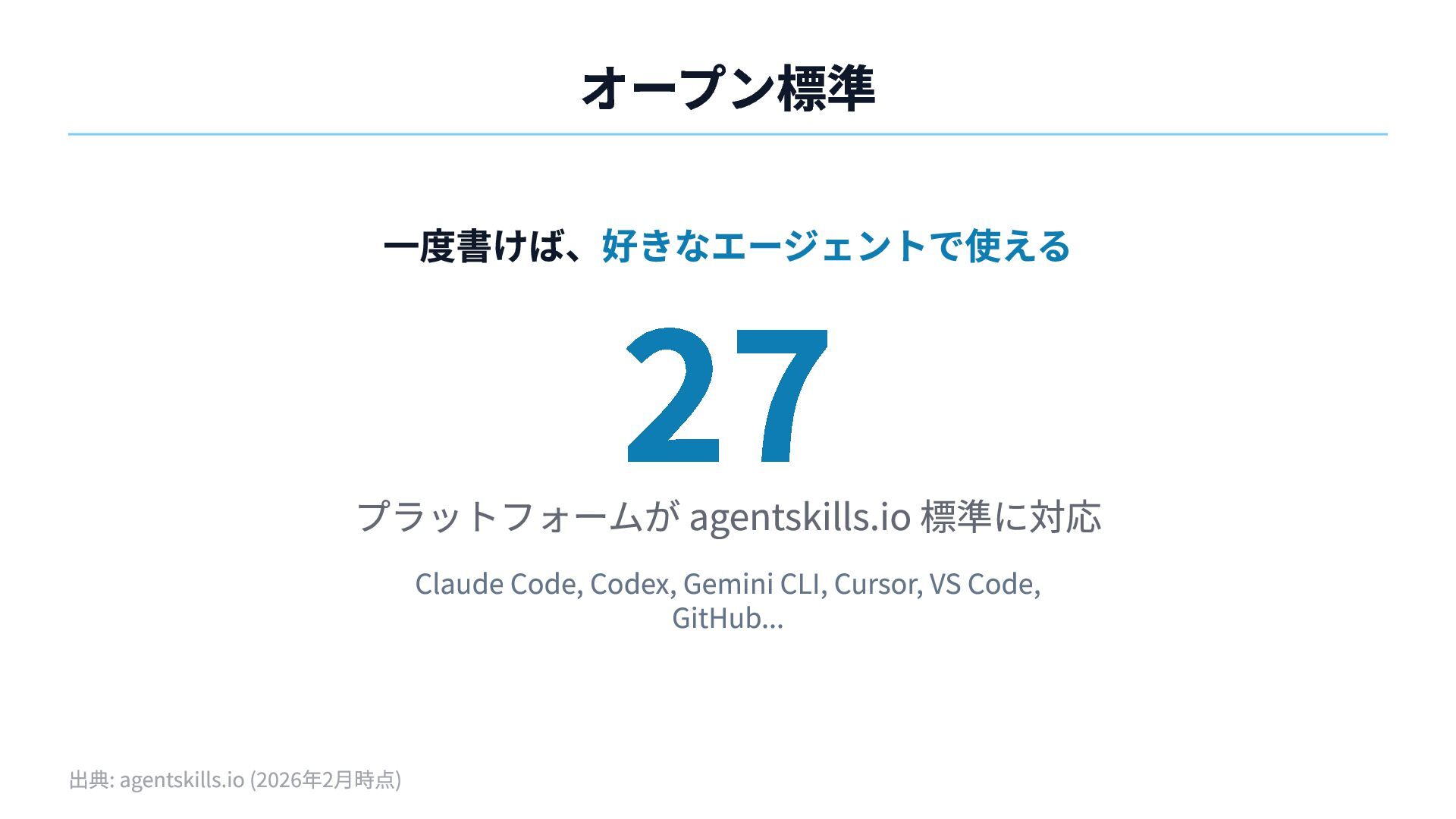 対応ツール: Claude Code / Codex ほか agentskills.io 標準準拠ツール全般。