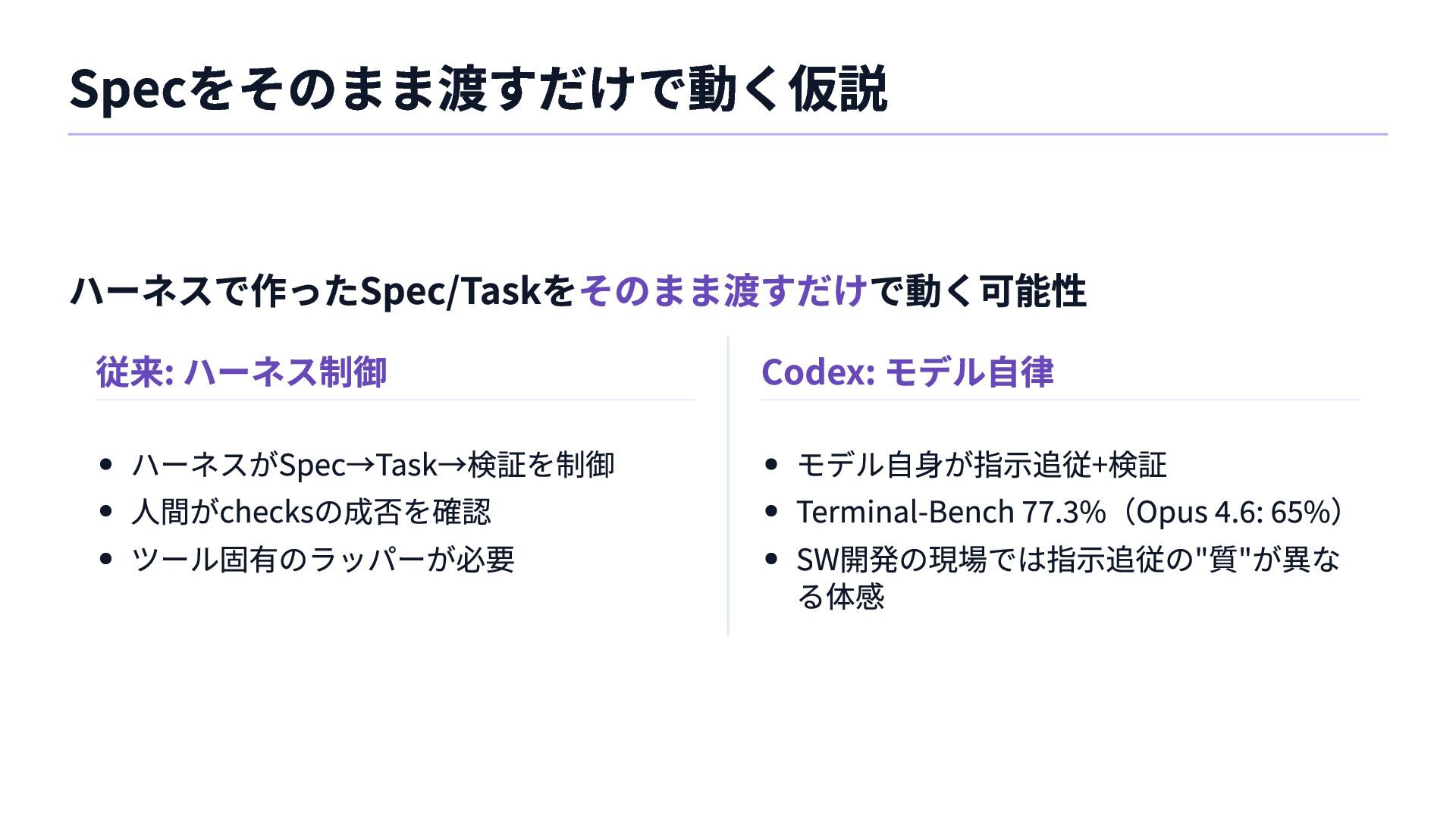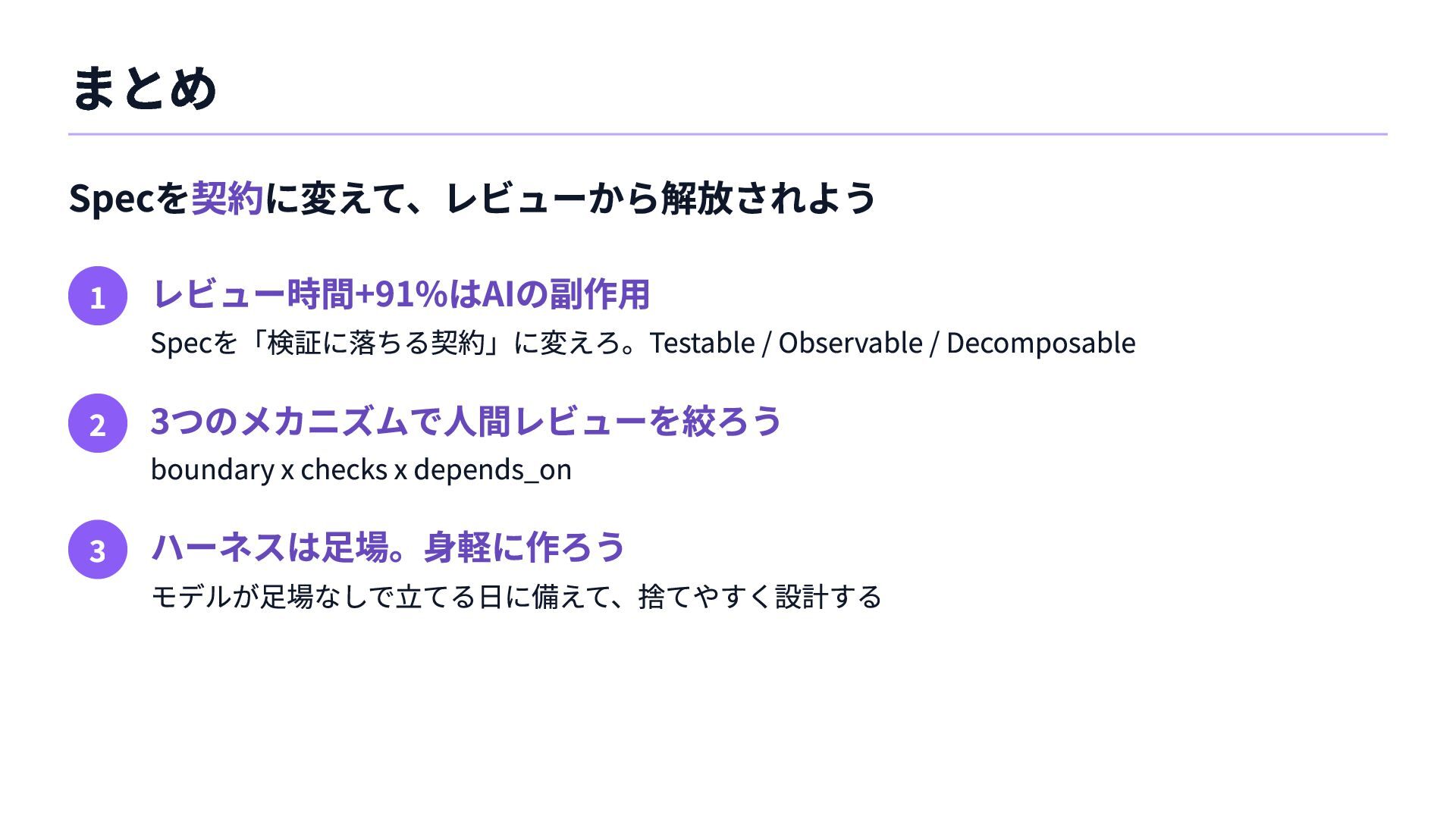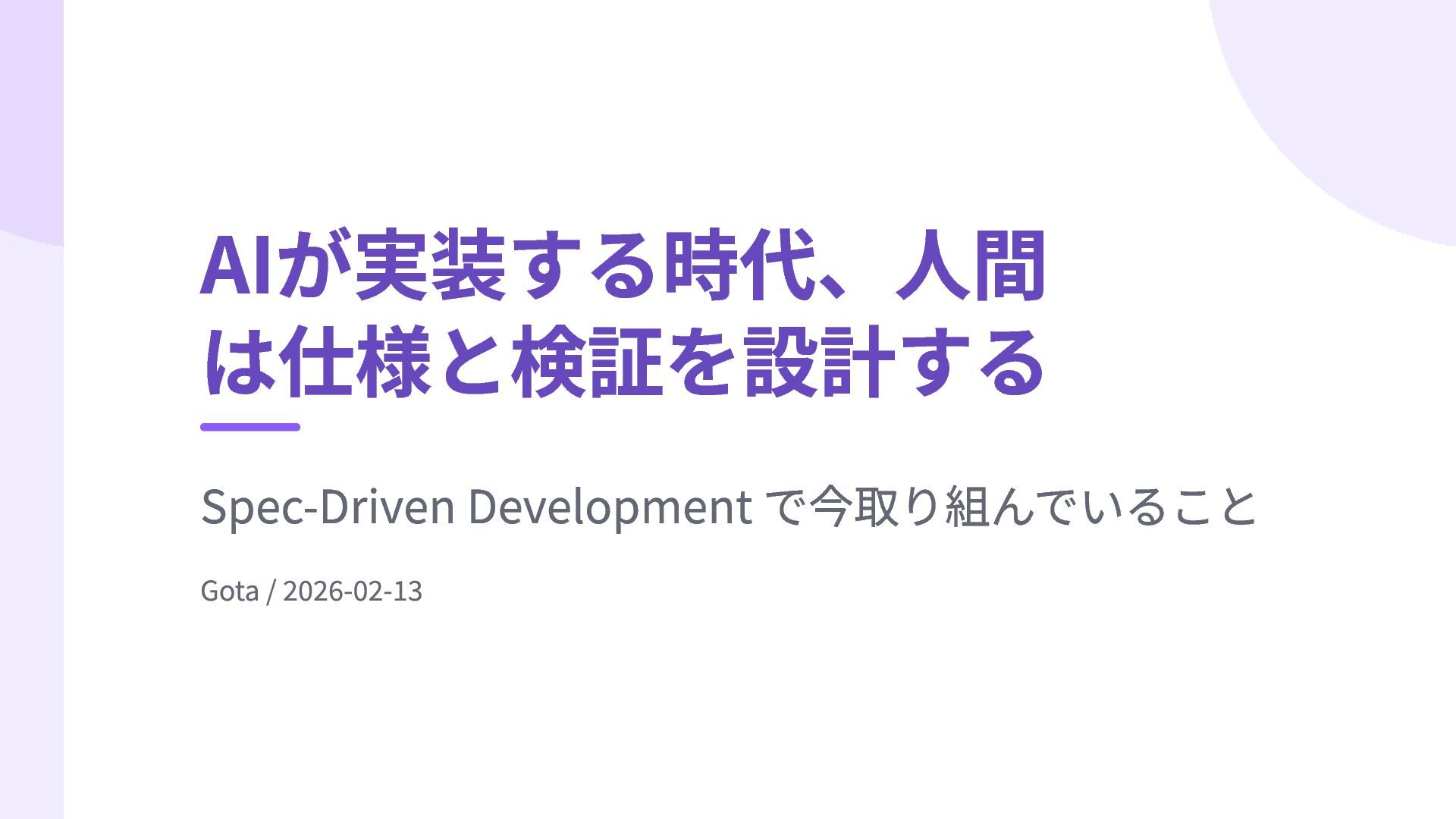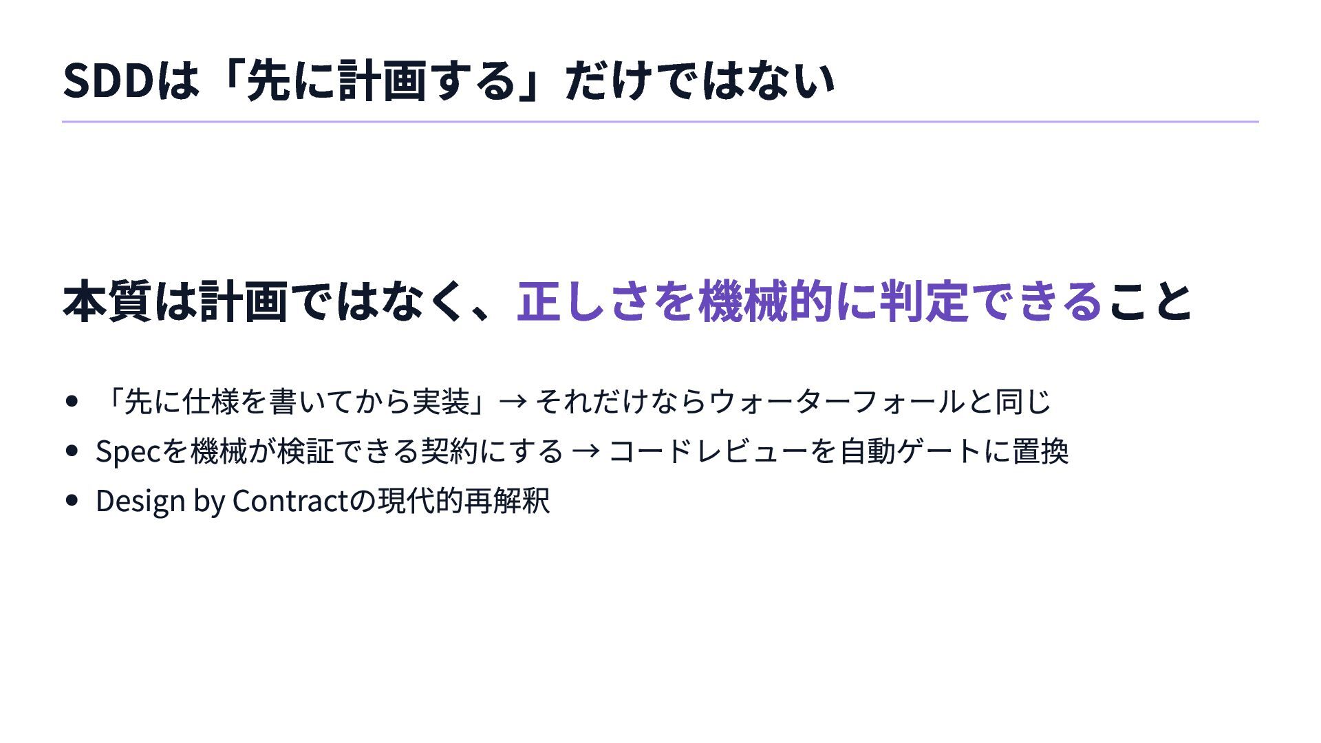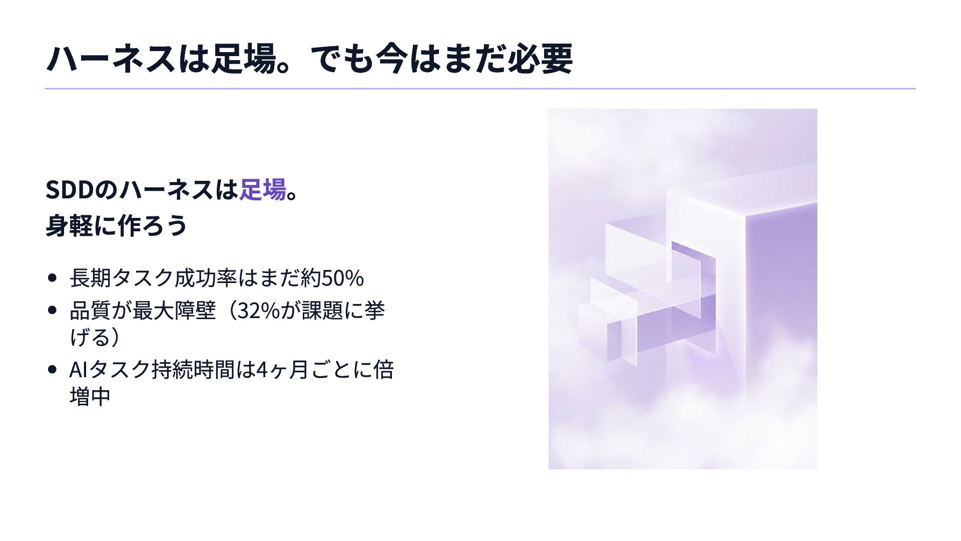 cc-sddの開発者が、仕様駆動開発 (Spec-Driven Development) で現在取り組んでいることや考えていることについて話す。 SDDの検証をどう行えば人間レビューを減少させることができるかや長時間自律性を高めるための取り組みやハーネスの概念について解説する。