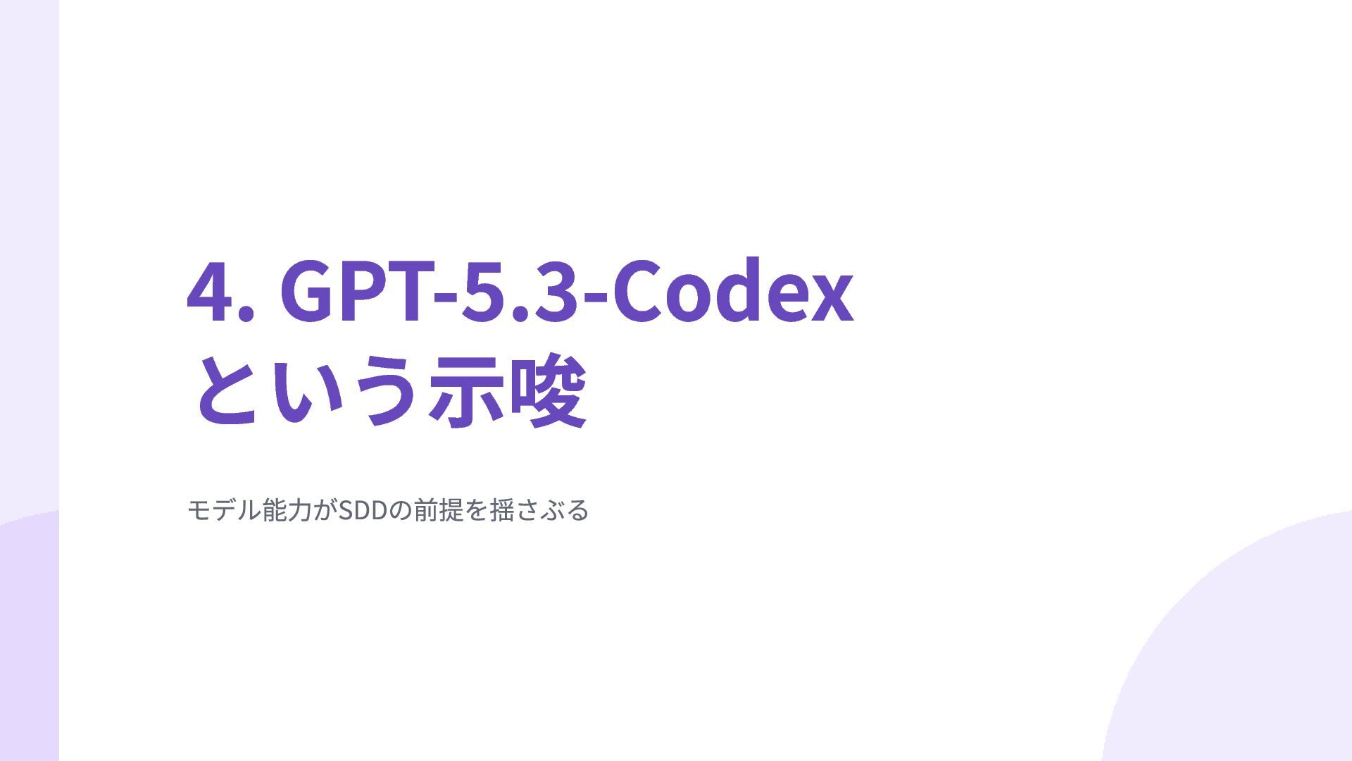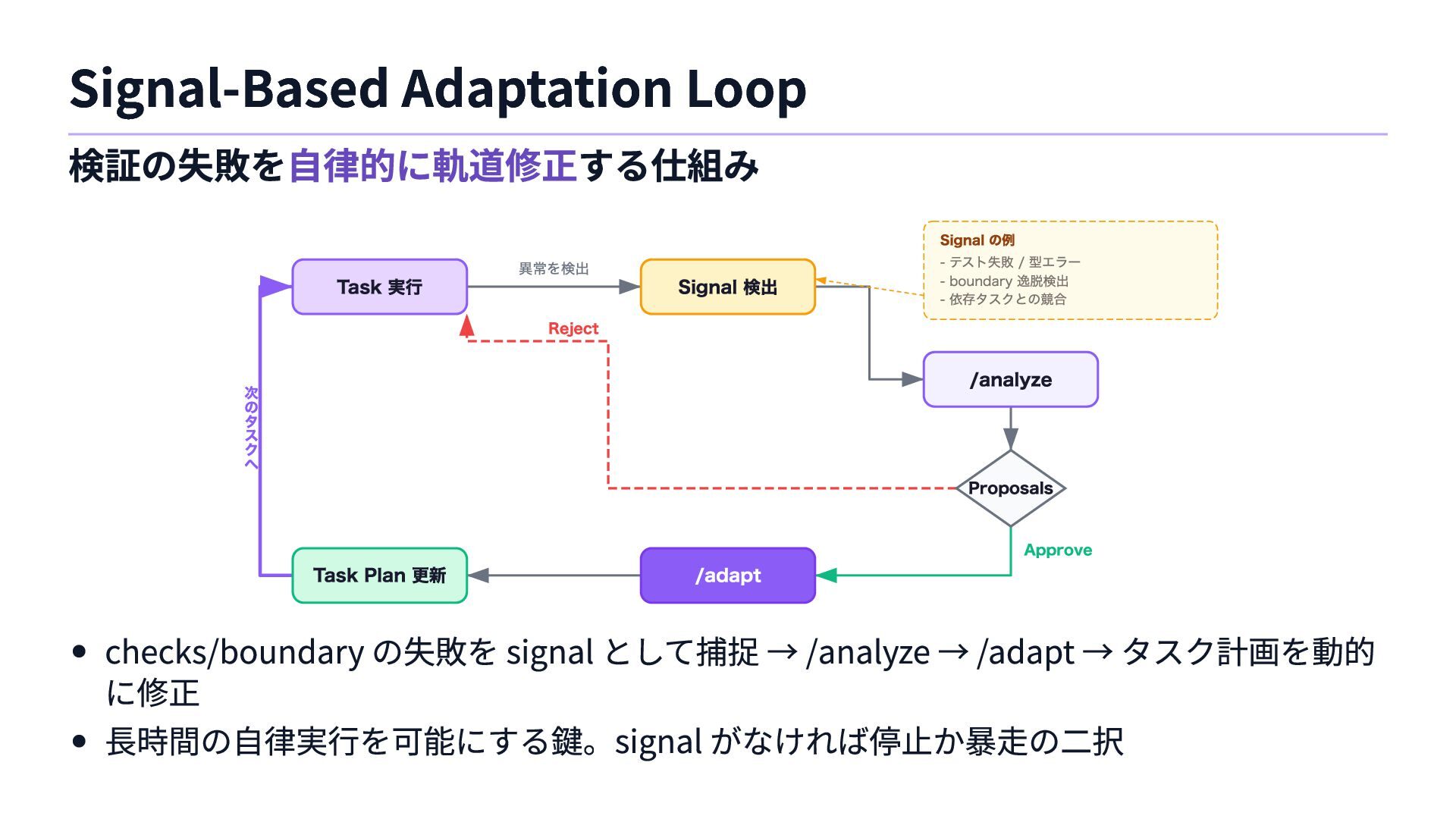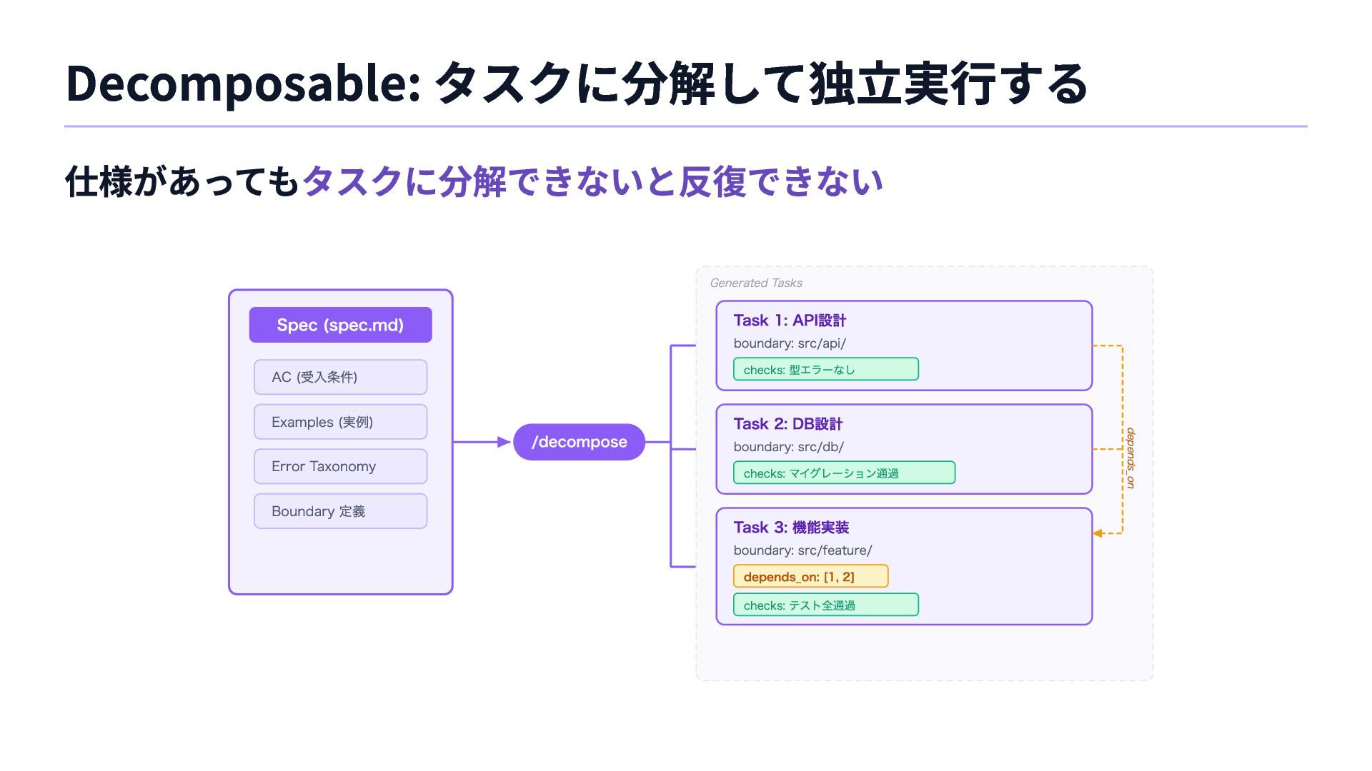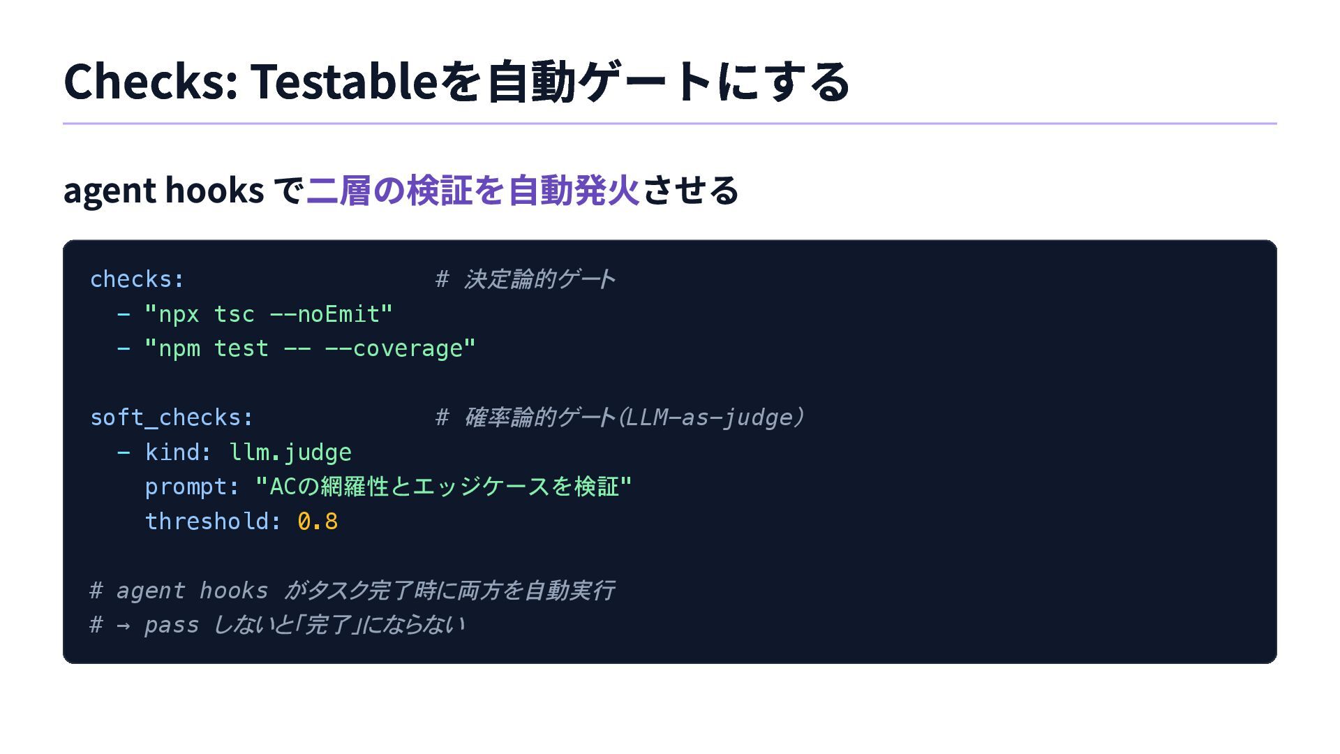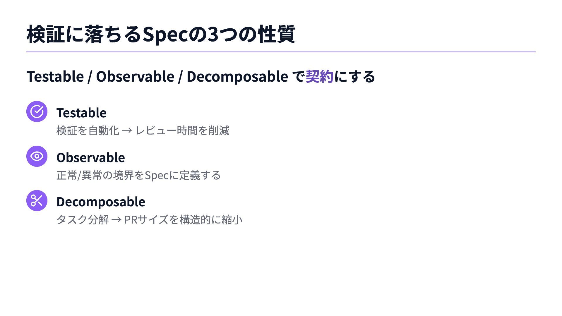cc-sddの開発者が、仕様駆動開発 (Spec-Driven Development) で現在取り組んでいることや考えていることについて話す。 SDDの検証をどう行えば人間レビューを減少させることができるかや長時間自律性を高めるための取り組みやハーネスの概念について解説する。