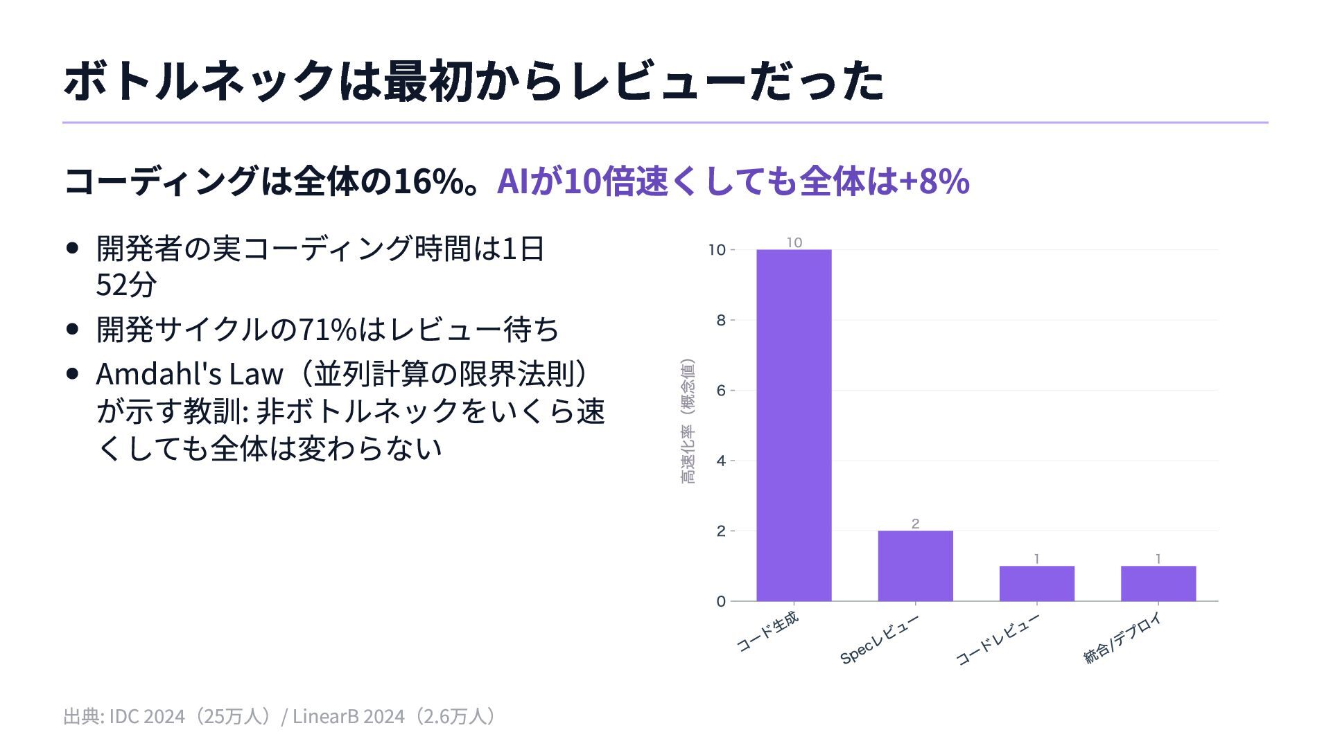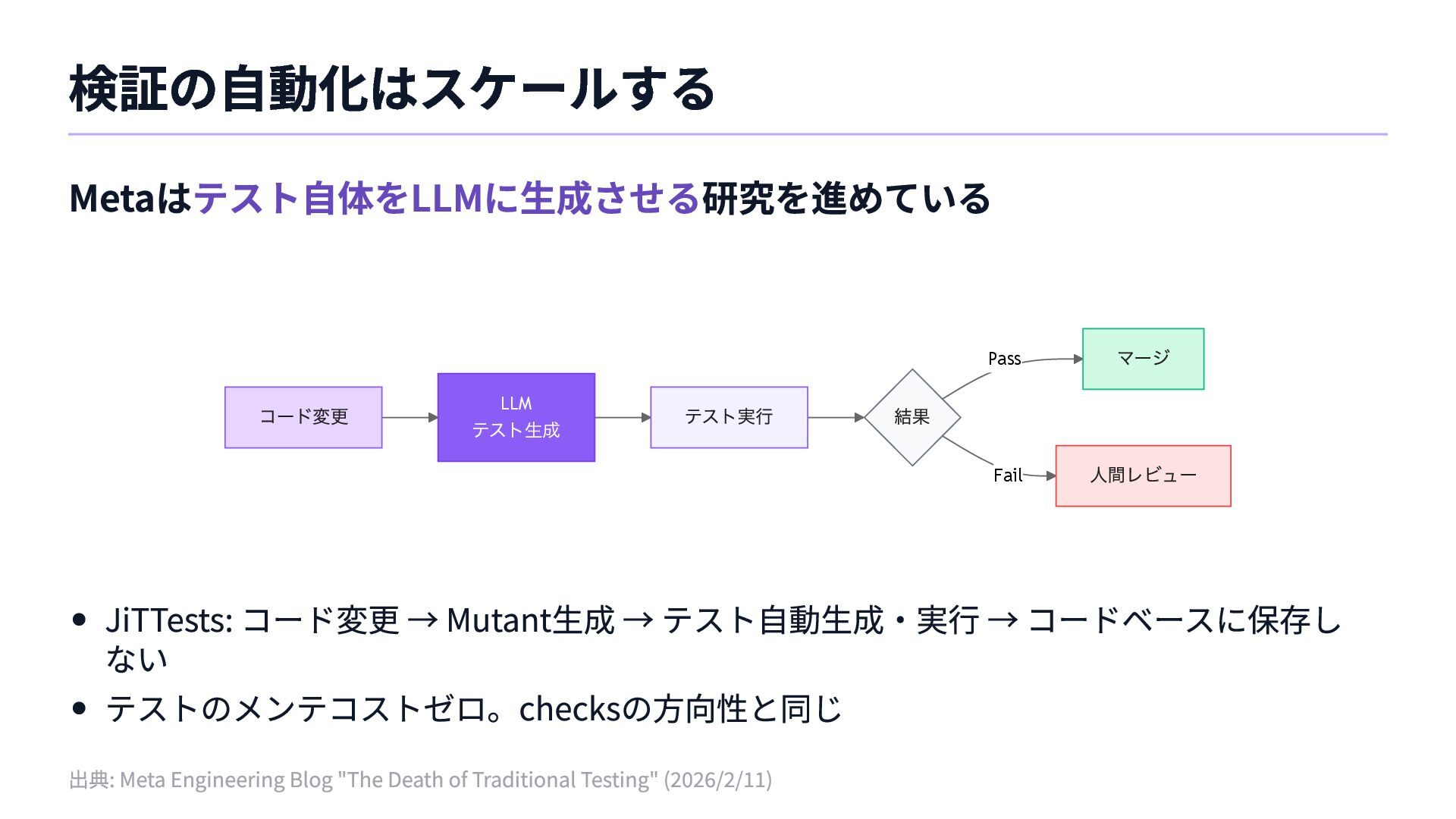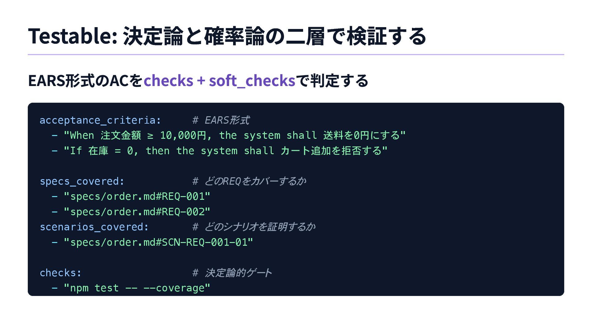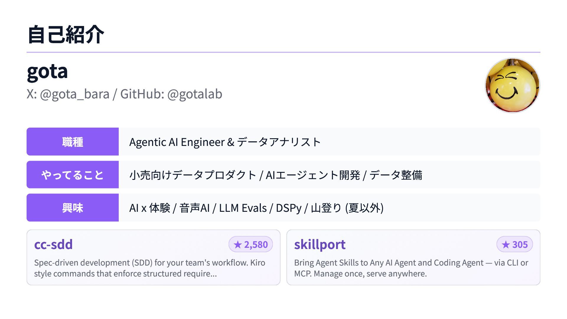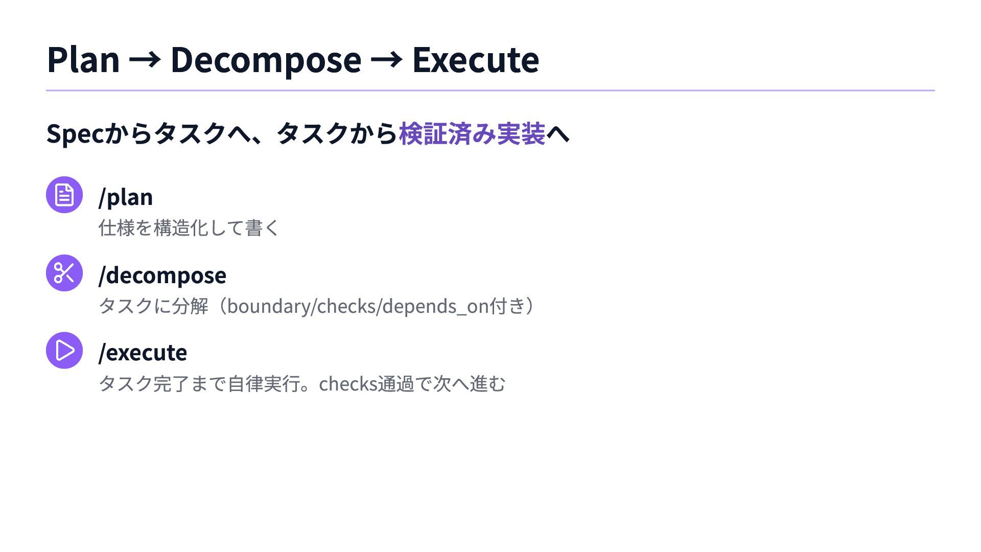 cc-sddの開発者が、仕様駆動開発 (Spec-Driven Development) で現在取り組んでいることや考えていることについて話す。 SDDの検証をどう行えば人間レビューを減少させることができるかや長時間自律性を高めるための取り組みやハーネスの概念について解説する。