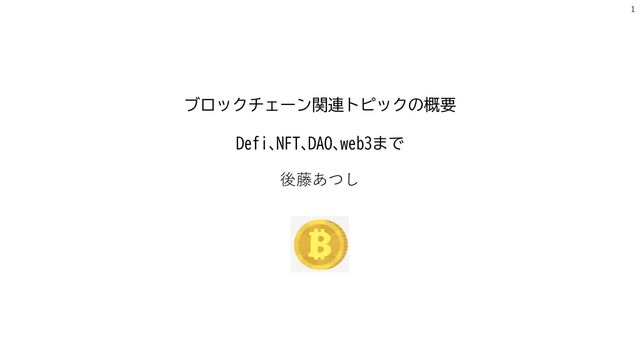 1. 2 このスライドは、暗号資産、Defi、NFT、DAO、web3まで、ブロックチェーンに関連するトピックを幅広く概要説明し、ブ ロックチェーン関連の動向がどうなっているかをザックリ把握できることを目的に作成したものです。 【想定読者】 非技術者の方で、ブロックチェーンを利用したビジネスに興味のある方やブロックチェーン関連規制やルールに興味が ある方で、少し詳しくブロックチェーンやそれを利用したサービスの仕組みなどを知りたい方を想定しています。 【著者について】 後藤あつし @kotetsu_dec 金融の経験をベースに、ブロックチェーン・暗号資産のリサーチや業界のサポート等を行っています。